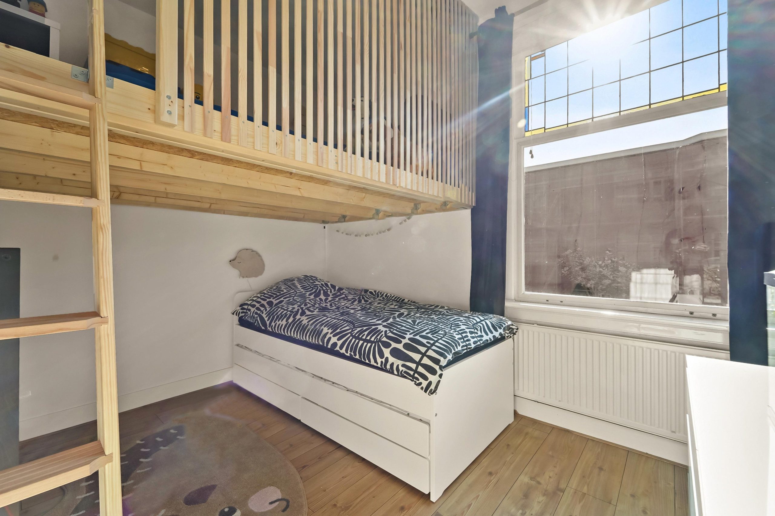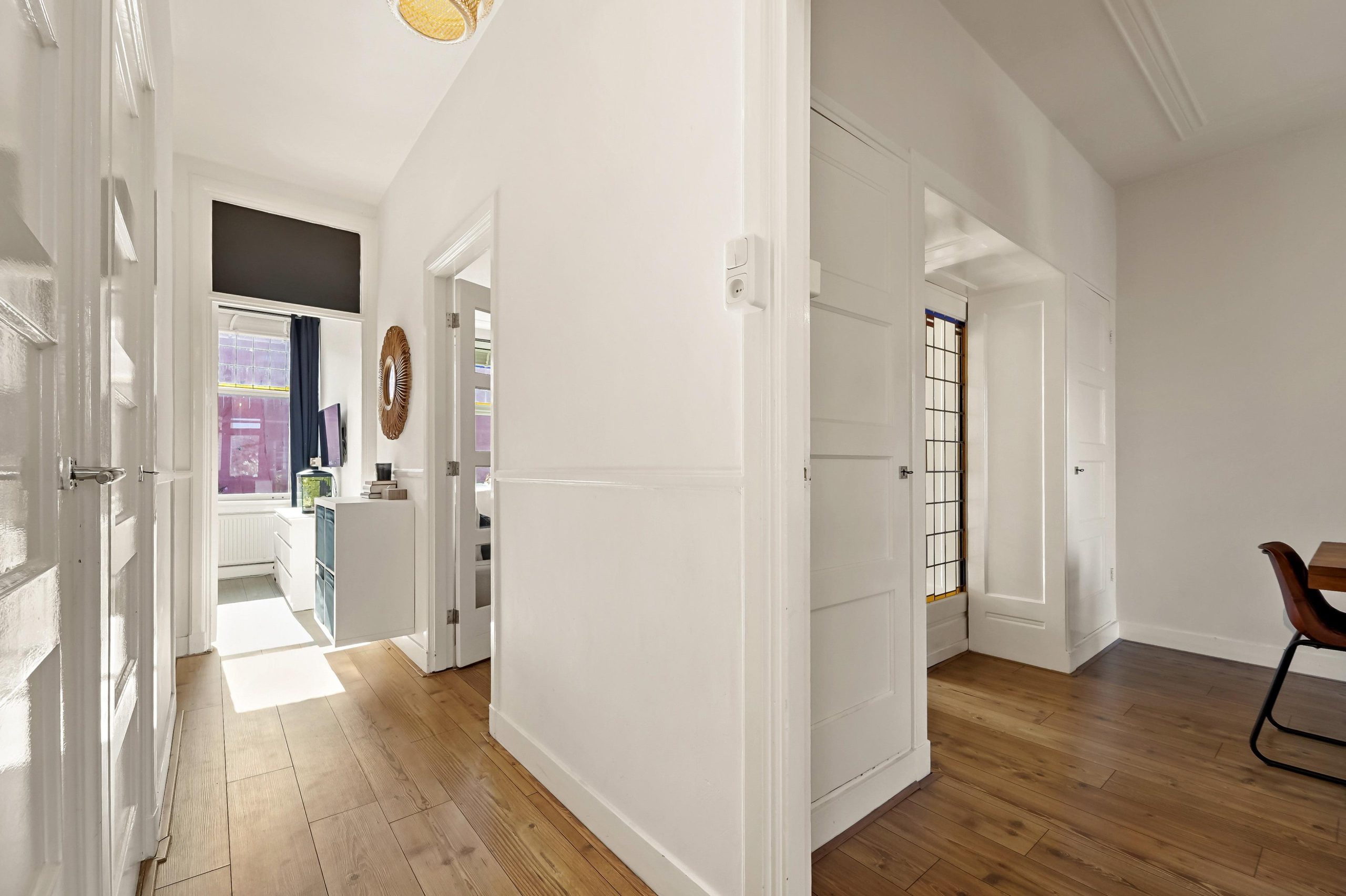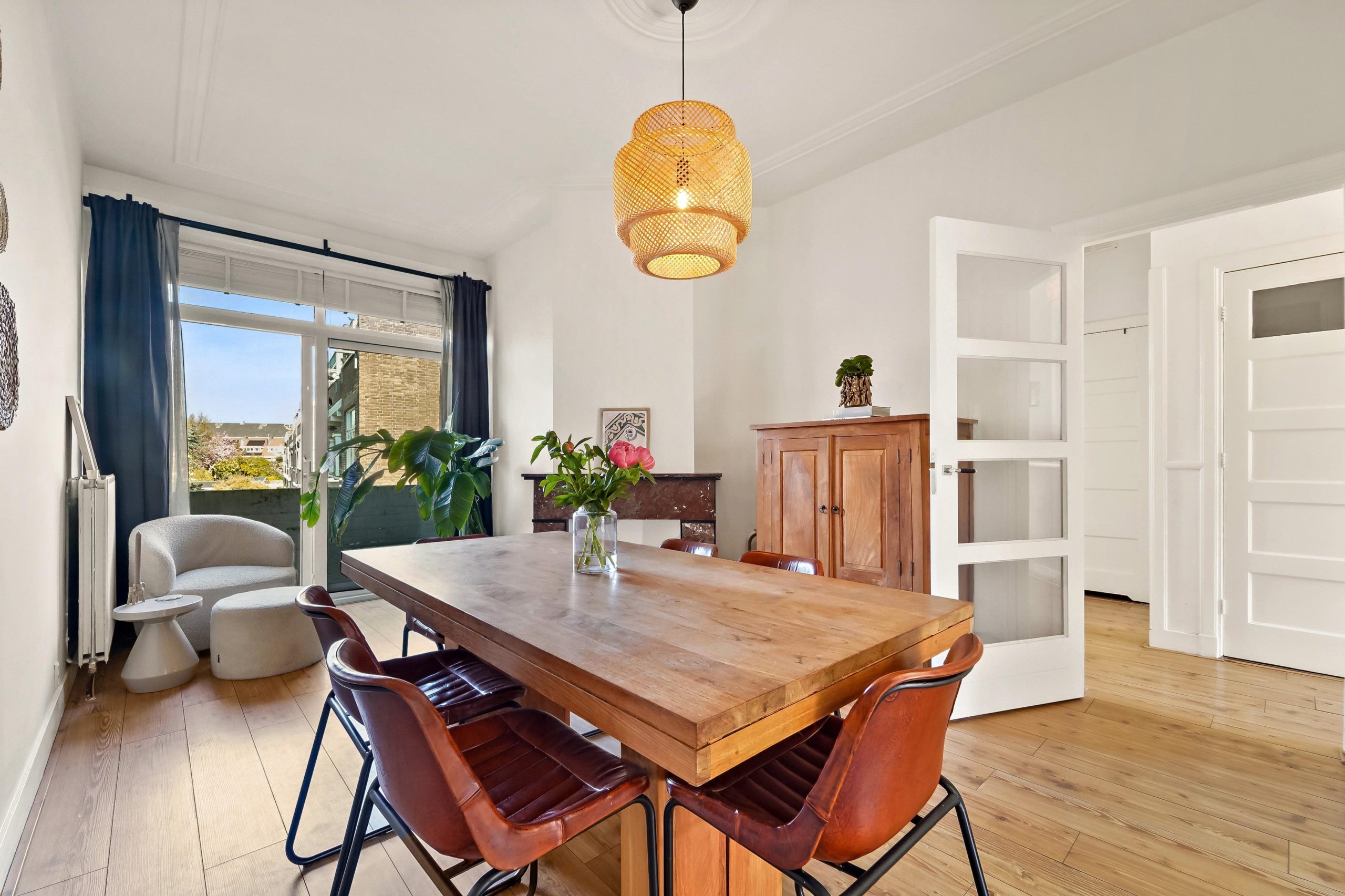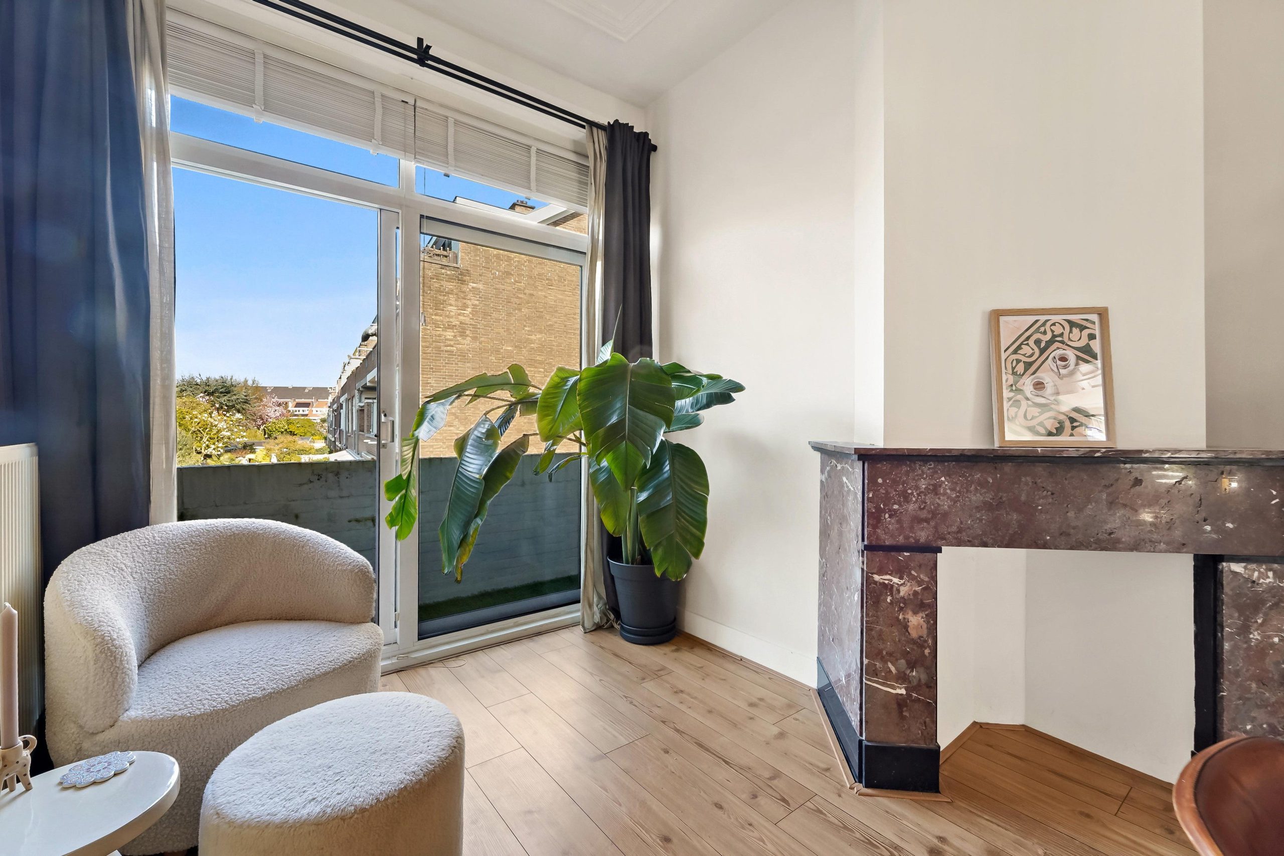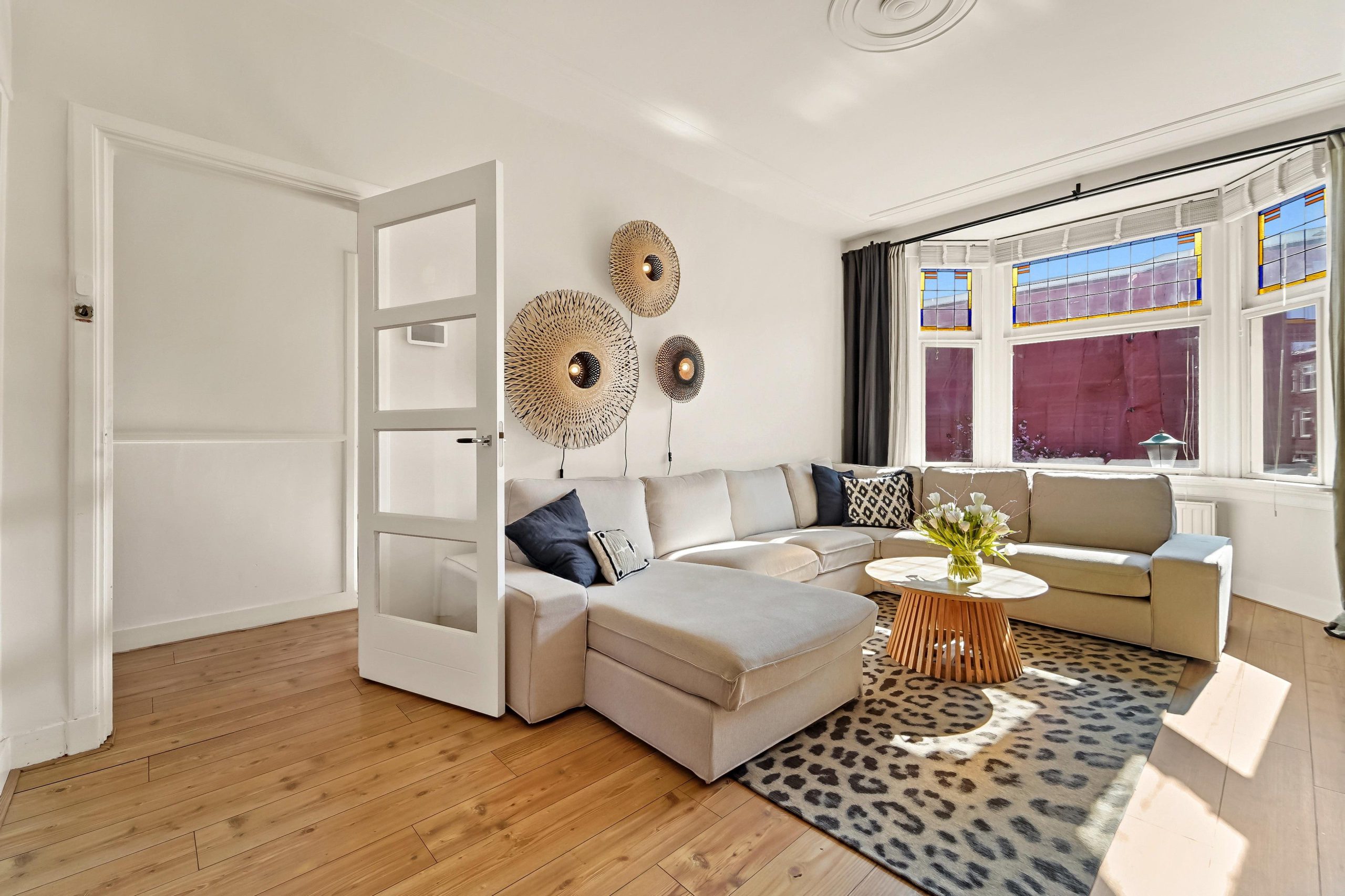 WOW! Insane first floor house (81m2) located in the popular Vruchtenbuurt where all AUTHENTIC DETAILS have been preserved! Think of the room en suite with sliding separation with stained glass doors, cozy bay window with stained glass windows and original fireplaces! The house has TWO spacious bedrooms, a lovely BALCONY located on the west and green view over the gardens located at the rear!
