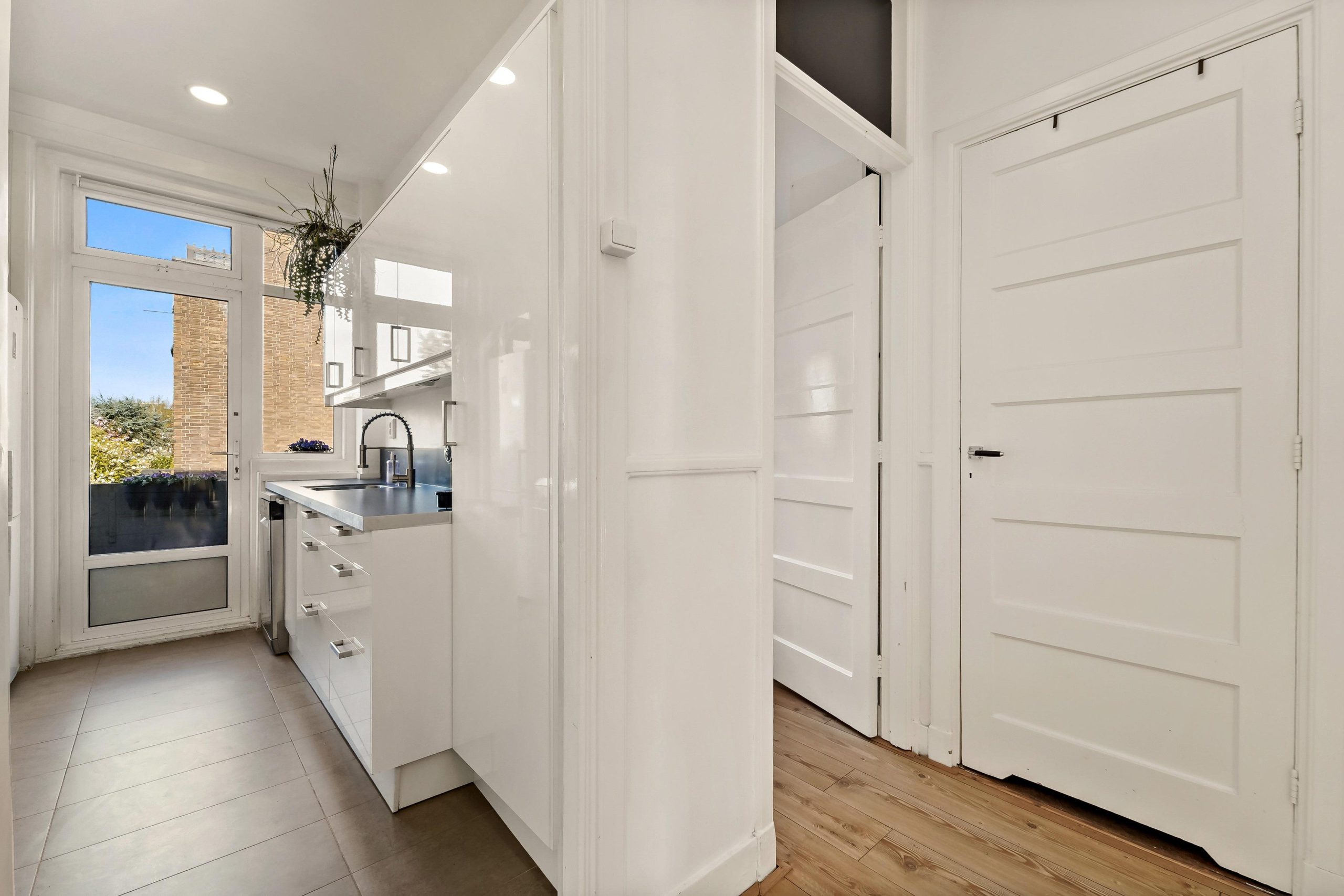 Indeling: Haags portiek met trap naar de eerste etage. Entree woning, gang met toegang tot alle vertrekken. Garderobe kast met meterkast. Woonkamer en suite met originele schuifseparatie voorzien van glas in lood. Erker aan de voorzijde voorzien van glas in lood en originele schouw. Eetkamer aan de achterzijde met originele schouw en schuifpui naar het balkon gelegen op het westen met groen uitzicht. Keuken gelegen aan de achterzijde voorzien van diverse apparatuur zoals vaatwasser, gasfornuis en afzuigkap en toegang tot het balkon. Hoofdslaapkamer gelegen aan de achterzijde met wederom toegang tot het balkon via schuifpui. Badkamer voorzien van douche, wastafel en handdoekradiator. Terug op de gang bevind zicht het toilet met fontein en een berging voorzien van wasmachine en droger aansluiting. Tweede slaapkamer gelegen aan de voorzijde.