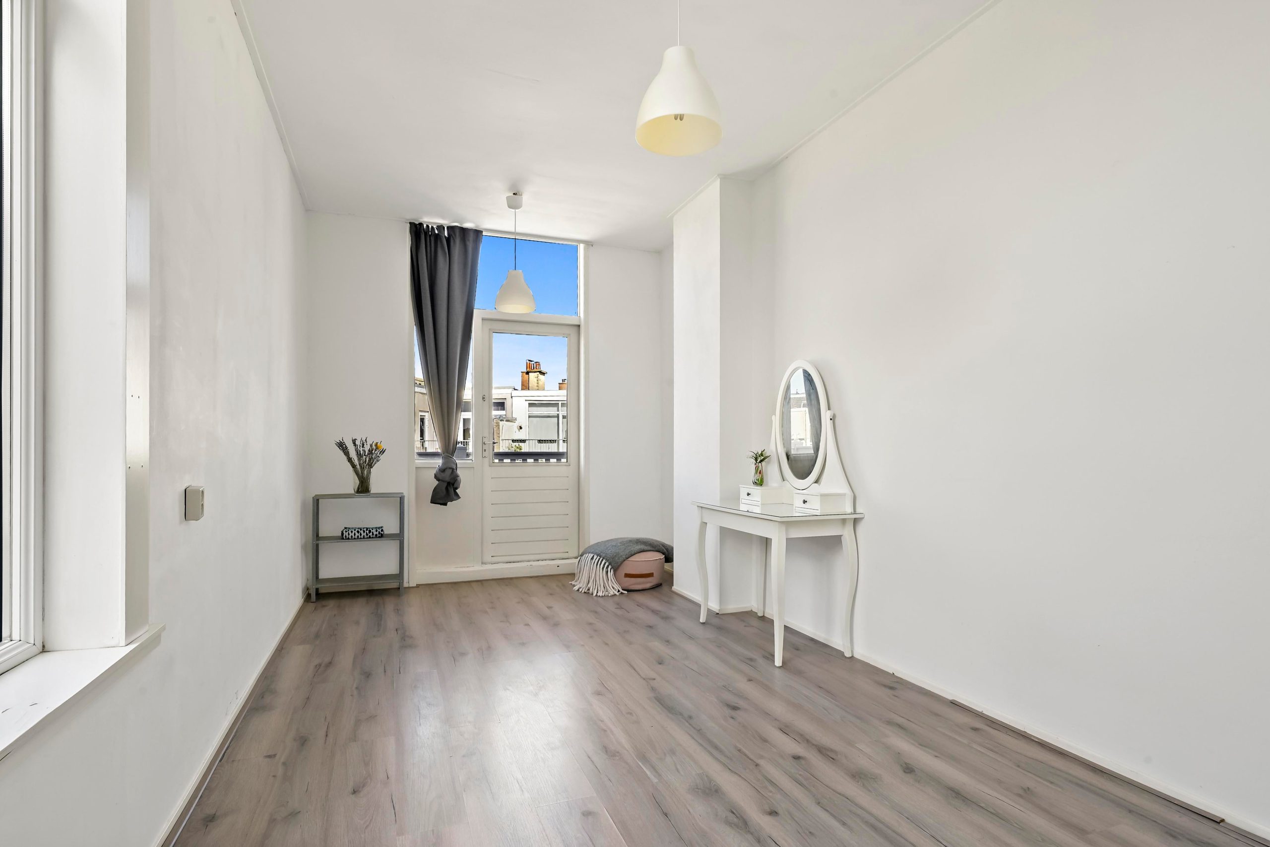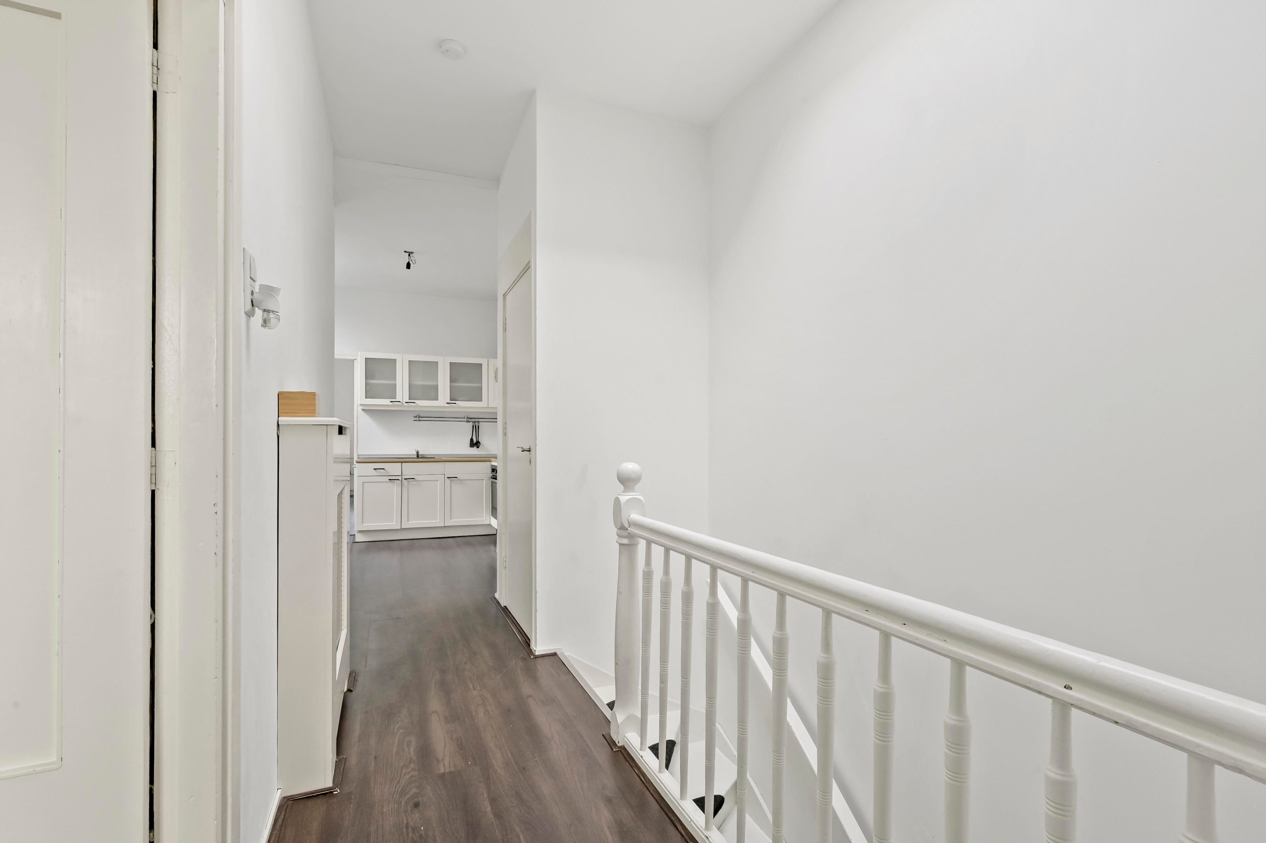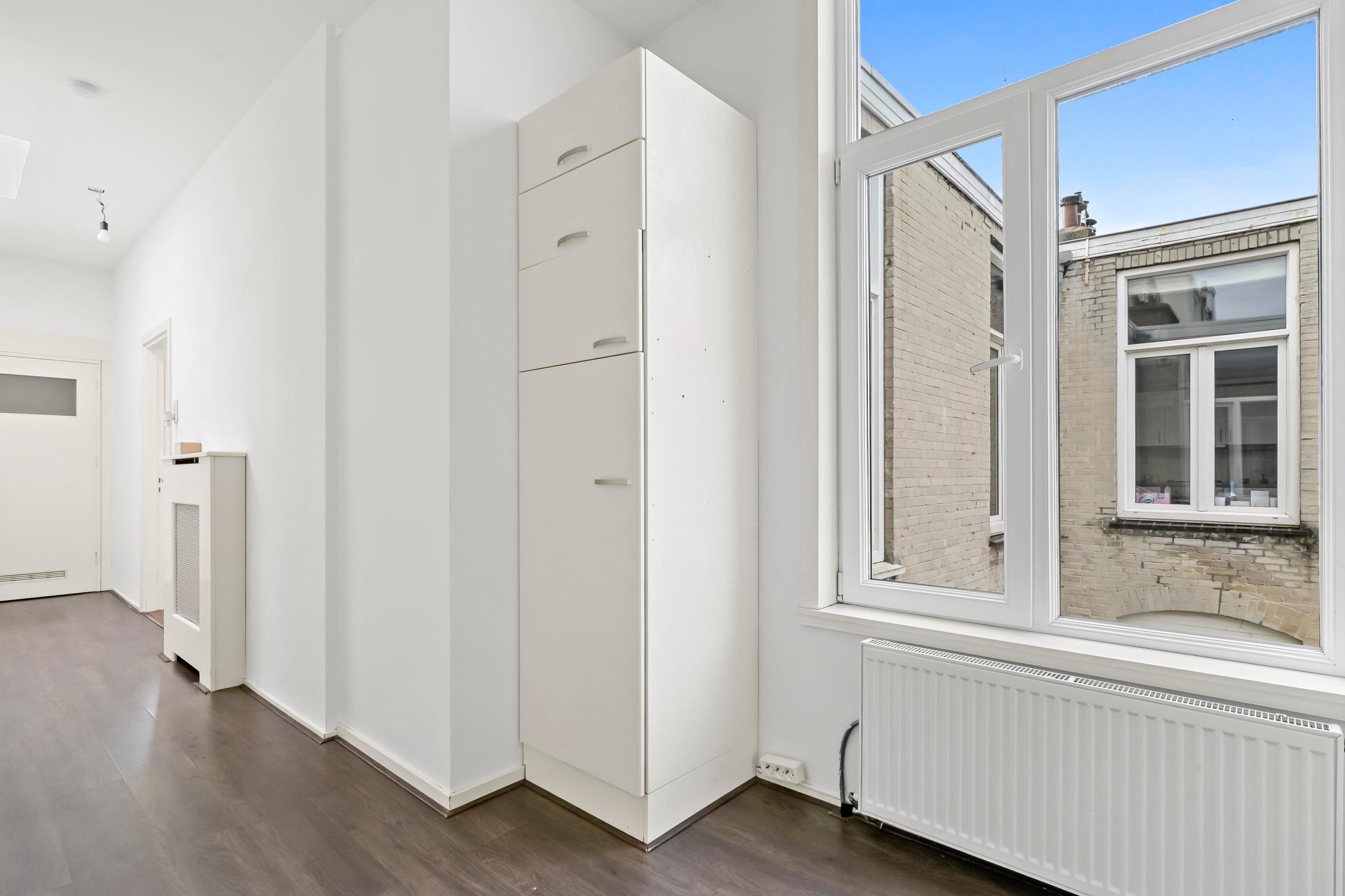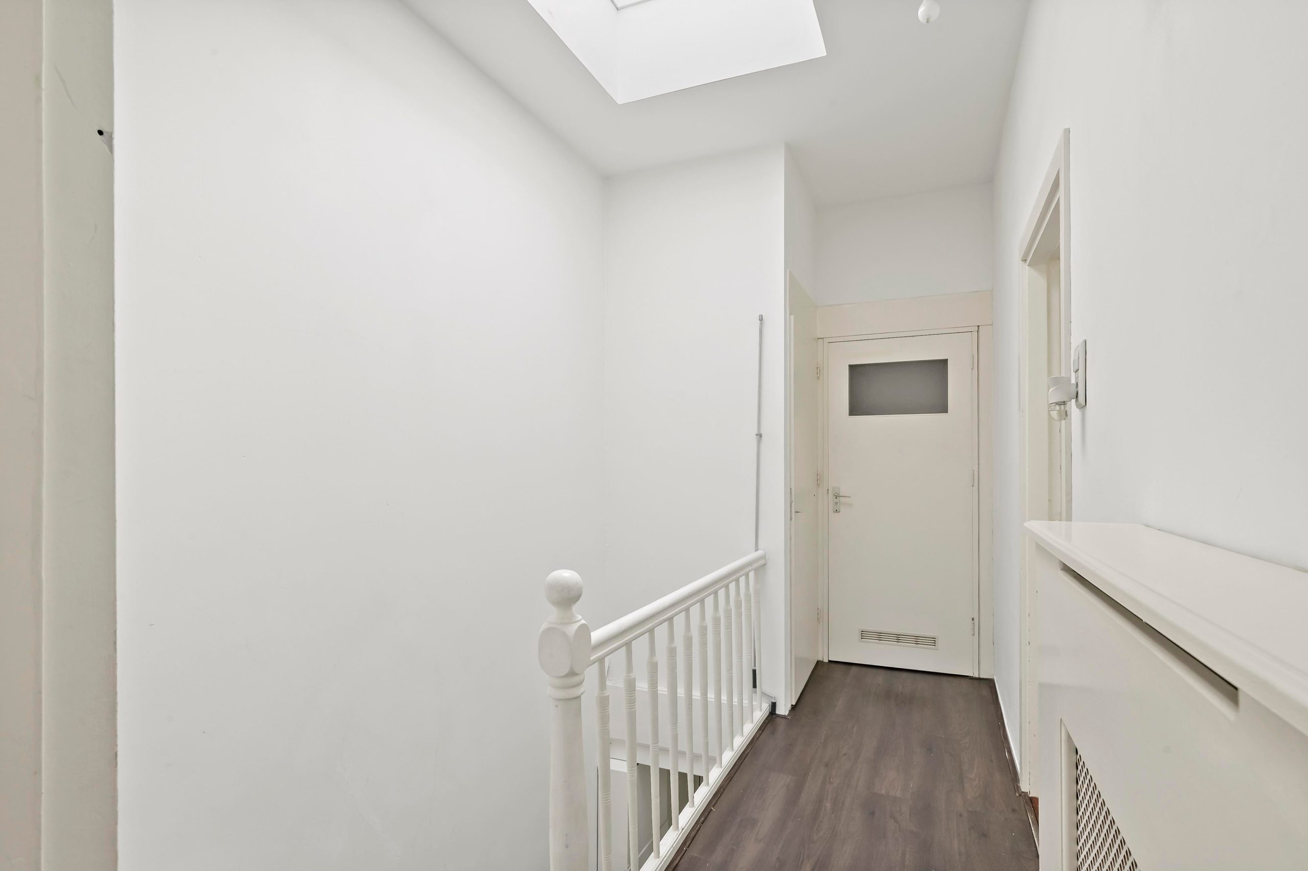 Open ‘Hague’ porch with wide stairs to the first floor. Entrance apartment, hall with meter cupboard and internal stairs to the top floor with skylight. Spacious bright landing with storage cupboard with washing machine connection. Access to toilet, living-dining room, modern bathroom (which has a shower, washbasin and mirror). Access to the L-shaped living/dining room with lots of daylight thanks to the authentic bay window. Access to the bedroom (3.40 x 3.62) via the living room. The kitchen is located on the right side of the apartment and is equipped with a connection for a dishwasher, oven, 4-burner gas stove, fridge-freezer combination. Spacious second bedroom located at the rear with access to the balcony. Finally, the entire apartment has a laminate floor.