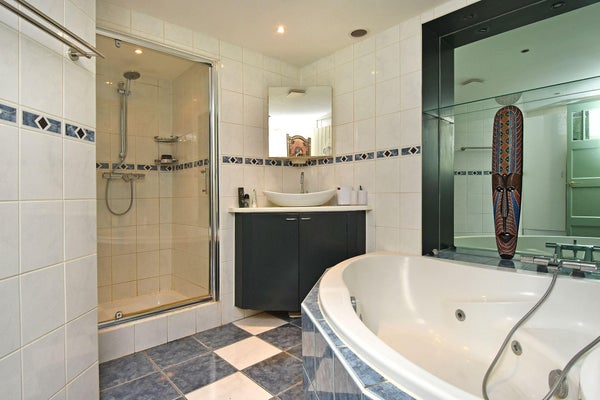Ligbad, douche, dubbele wastafel, wastafelmeubel