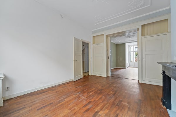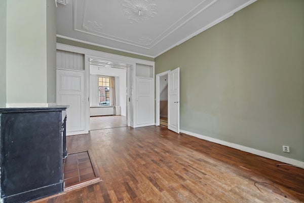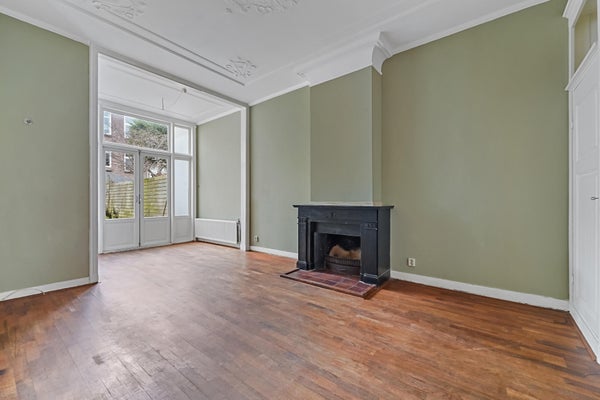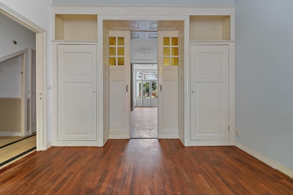 Very charming GROUND FLOOR APARTMENT with EXTENSION (118m2) and deep backyard on the SOUTHWEST in the very popular STATENKWARTIER. The house is characterized by its AUTHENTIC DETAILS such as the beautiful ornamental ceilings, original fireplaces and en-suite rooms with sliding separation doors.