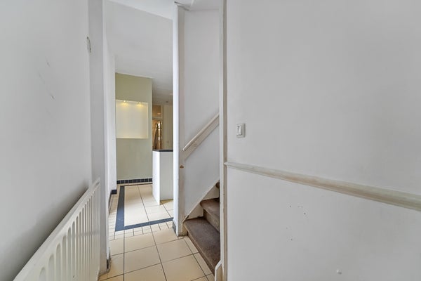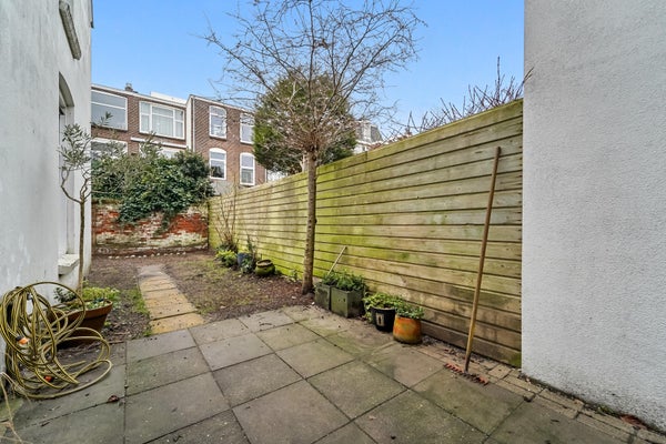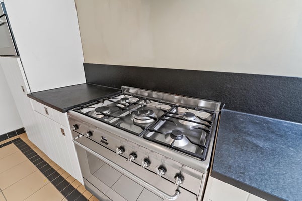 Layout: Entrance, hall with characteristic granite floor. Hallway with fixed cupboard with shower and separate toilet with washbasin. The attractive front and back rooms have beautiful ornamental ceilings, fireplaces and are separated by the original sliding separation. From the back room access to the lovely sunny garden through French doors. The spacious L-shaped garden of no less than 45m2 offers enough space to place a shed or veranda. In the extension is the kitchen with a black stone countertop and various built-in appliances, such as a large SMEG oven with 5-burner gas stove, extractor hood, combination microwave, refrigerator and dishwasher. From the kitchen again access to the garden. Spacious bedroom located at the rear of the extension with two deep fixed cupboards and French doors to the garden. From the hallway stairs to the first floor with access to the second spacious bedroom and the bathroom with bath, sink, toilet and bidet.