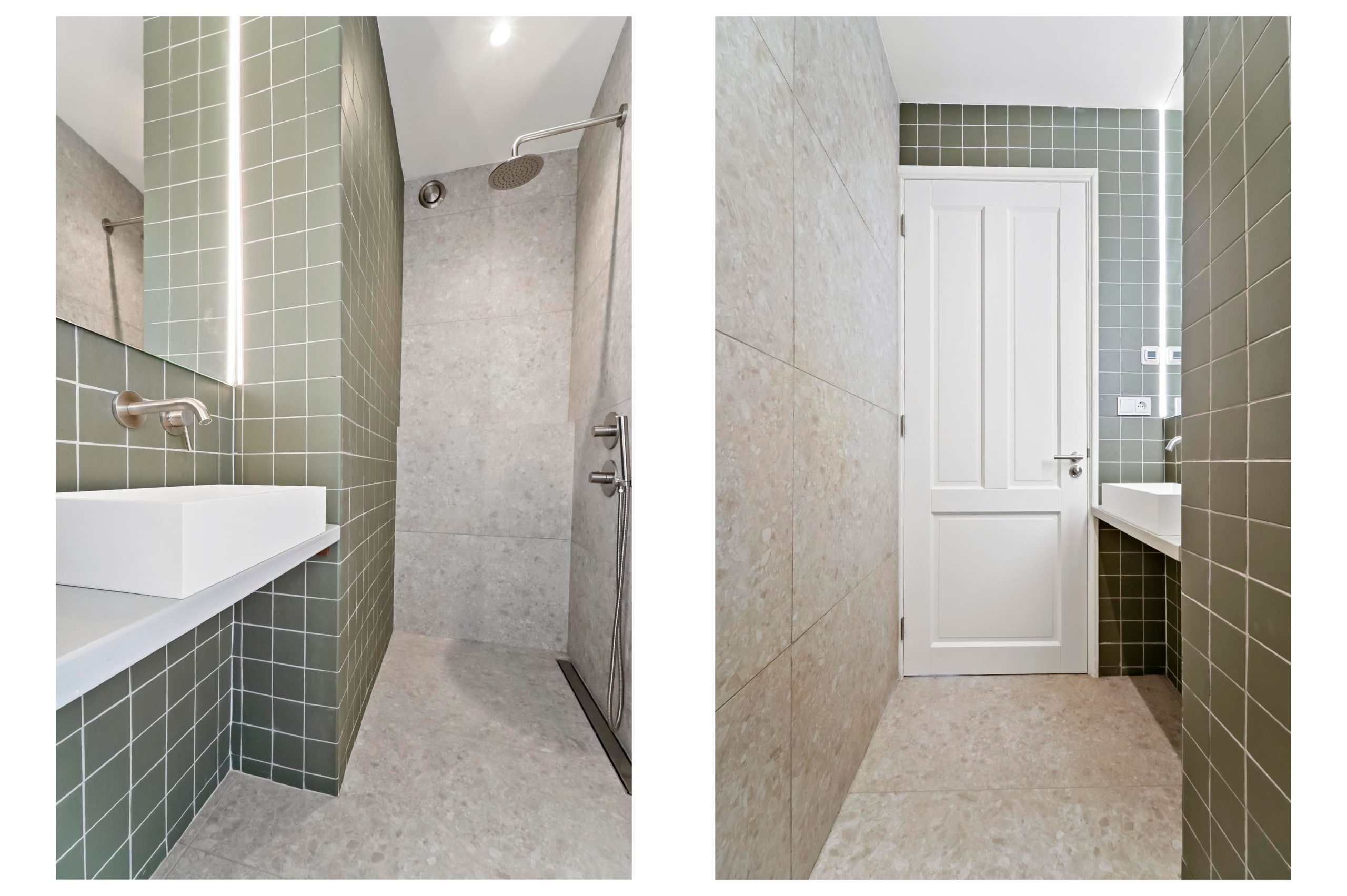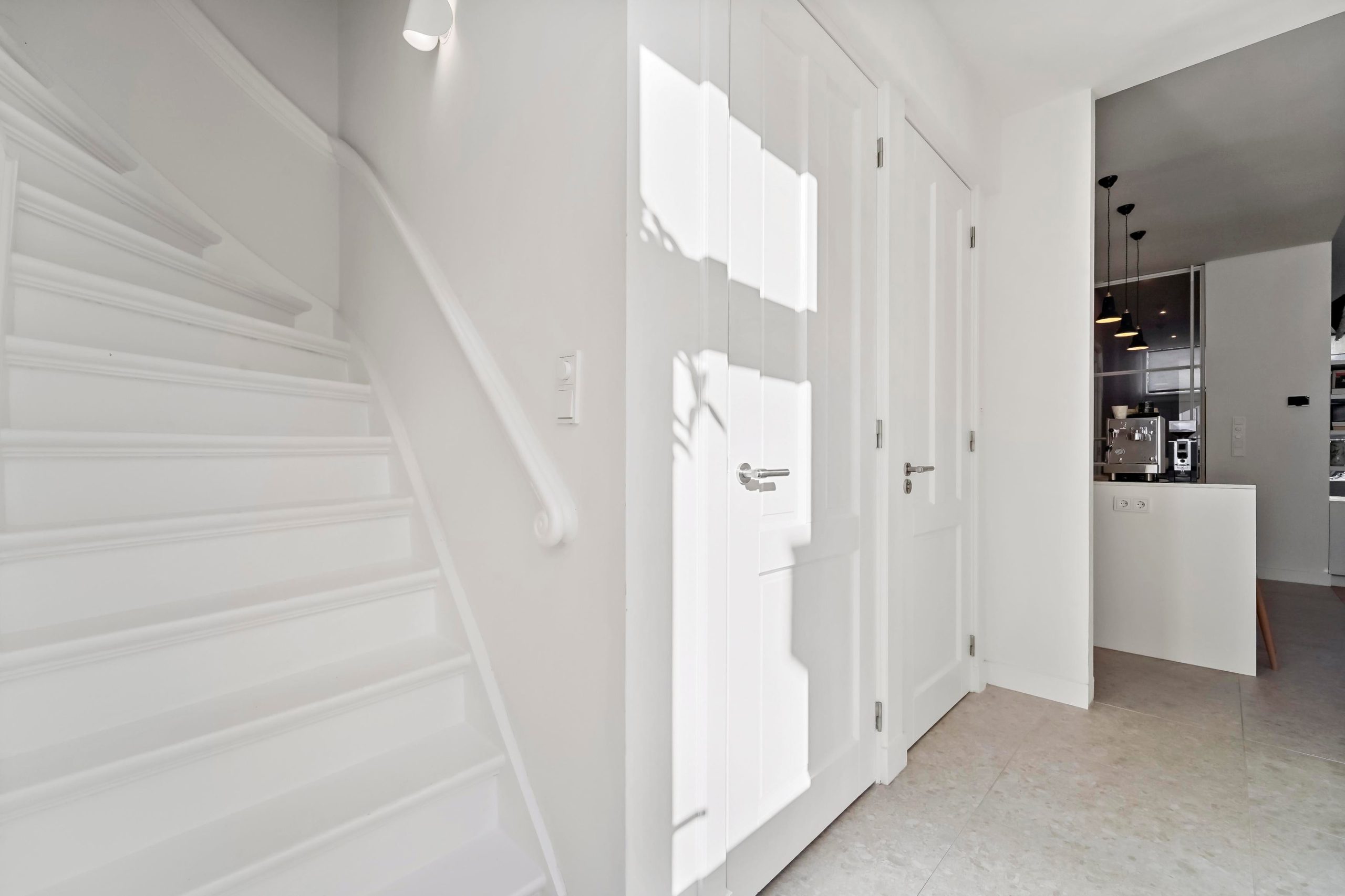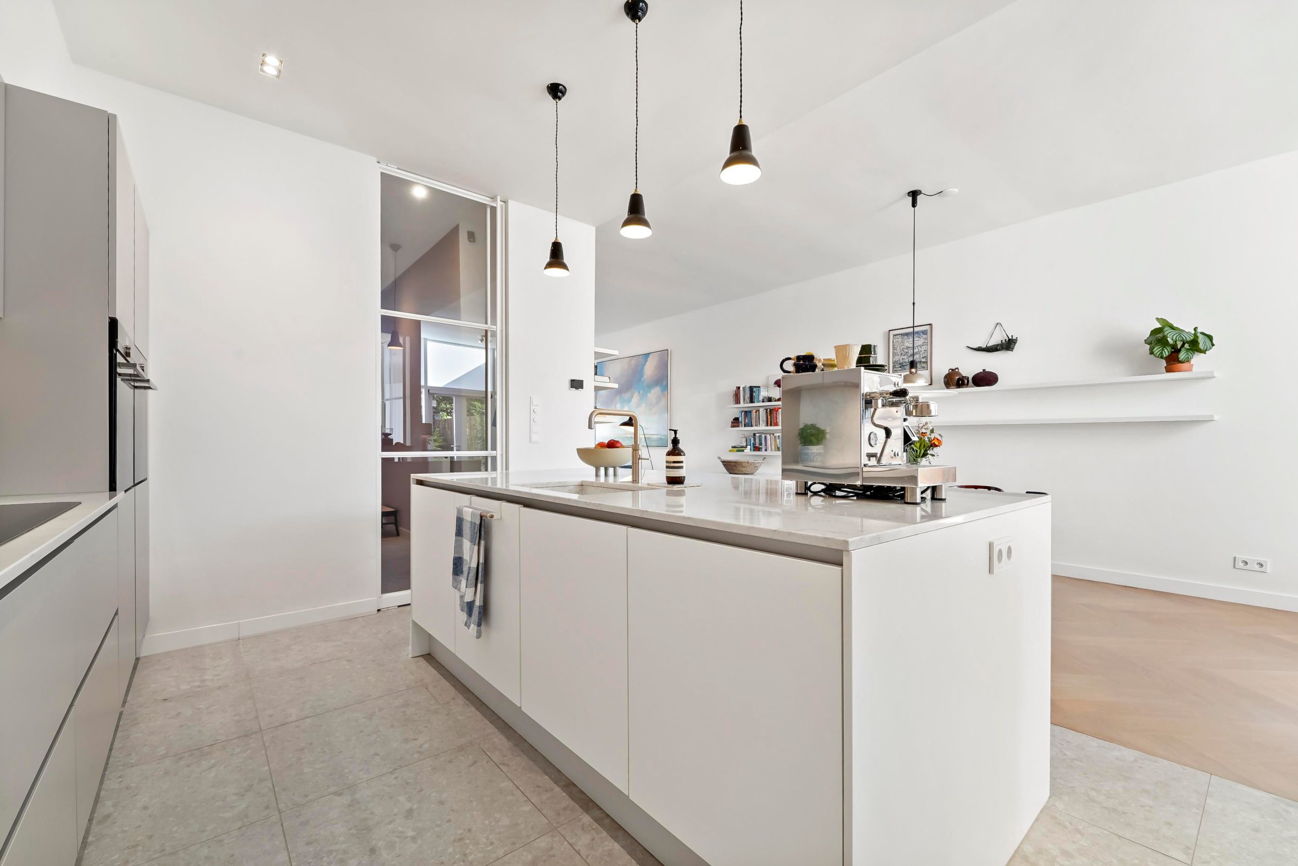 Layout: entrance of the house, hall with wardrobe and deep closet with washing machine and dryer connections. Access to the living room via white steel door. Beautiful kitchen/diner with island with an ‘arabesque polished’ composite top, an oven, combination microwave/oven, dishwasher (all from the Siemens luxury line), a Quooker, and sufficient cupboard space. The kitchen and hall have a beautiful terrazzo tiled floor which fits nicely with the oak herringbone floor of the living room. The spacious living/dining room has lots of light through large windows at the front and French doors at the rear leading to the lovely green and sunny garden with veranda, which has been landscaped under architecture. Access to the second hallway via steel door with toilet with fountain, deep closet with central heating installation and storage space, door to the garden and access to the master bedroom. The fantastic master bedroom has a freestanding bath, walk-in shower (with underfloor heating), washbasin and fitted wardrobes as well as a patio door to the garden. Back in the hallway, stairs to the first floor with two more beautiful bedrooms and a bathroom with a sink, mirror and walk-in shower with underfloor heating in the same style as the bathroom in the master bedroom.