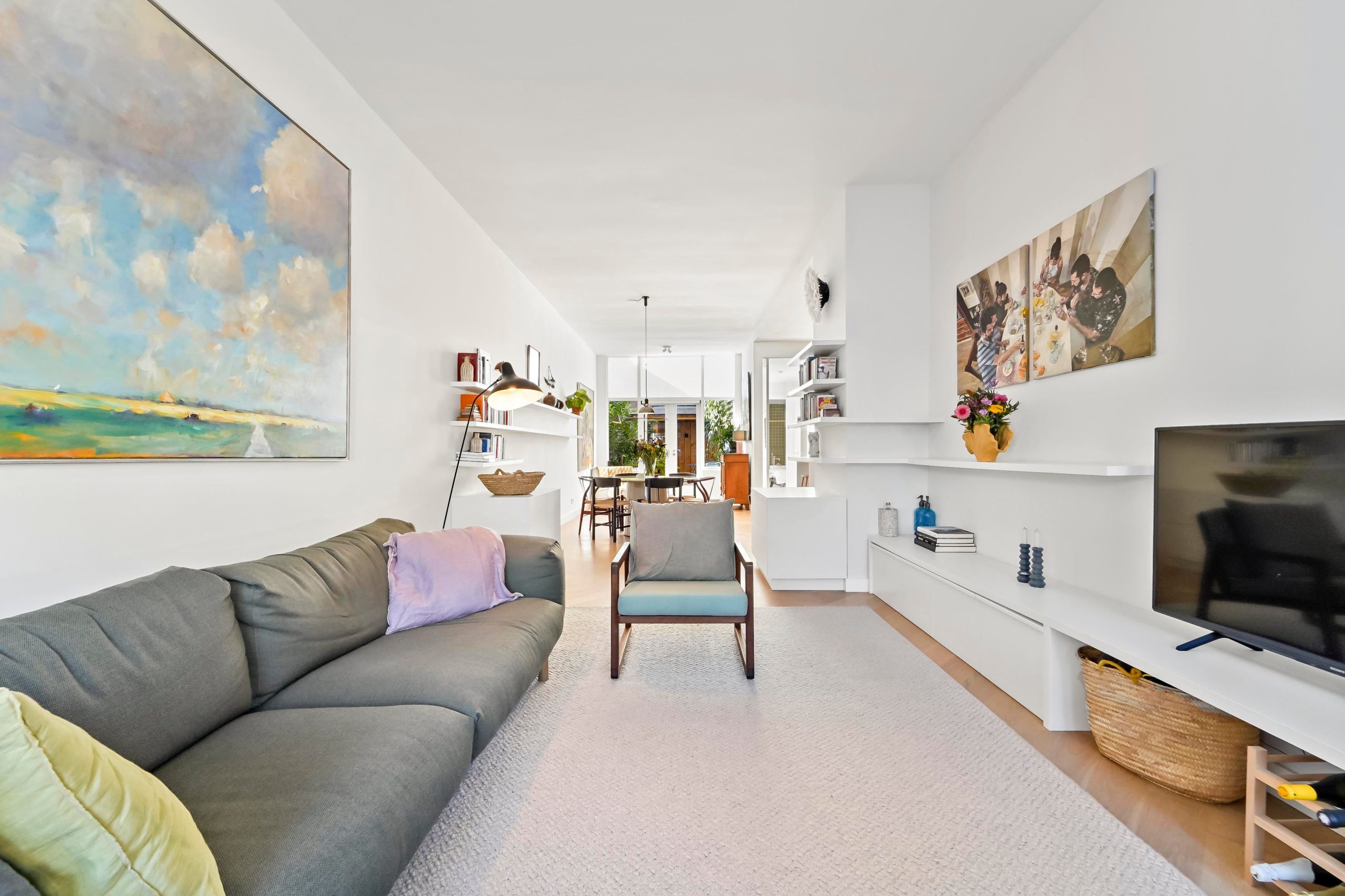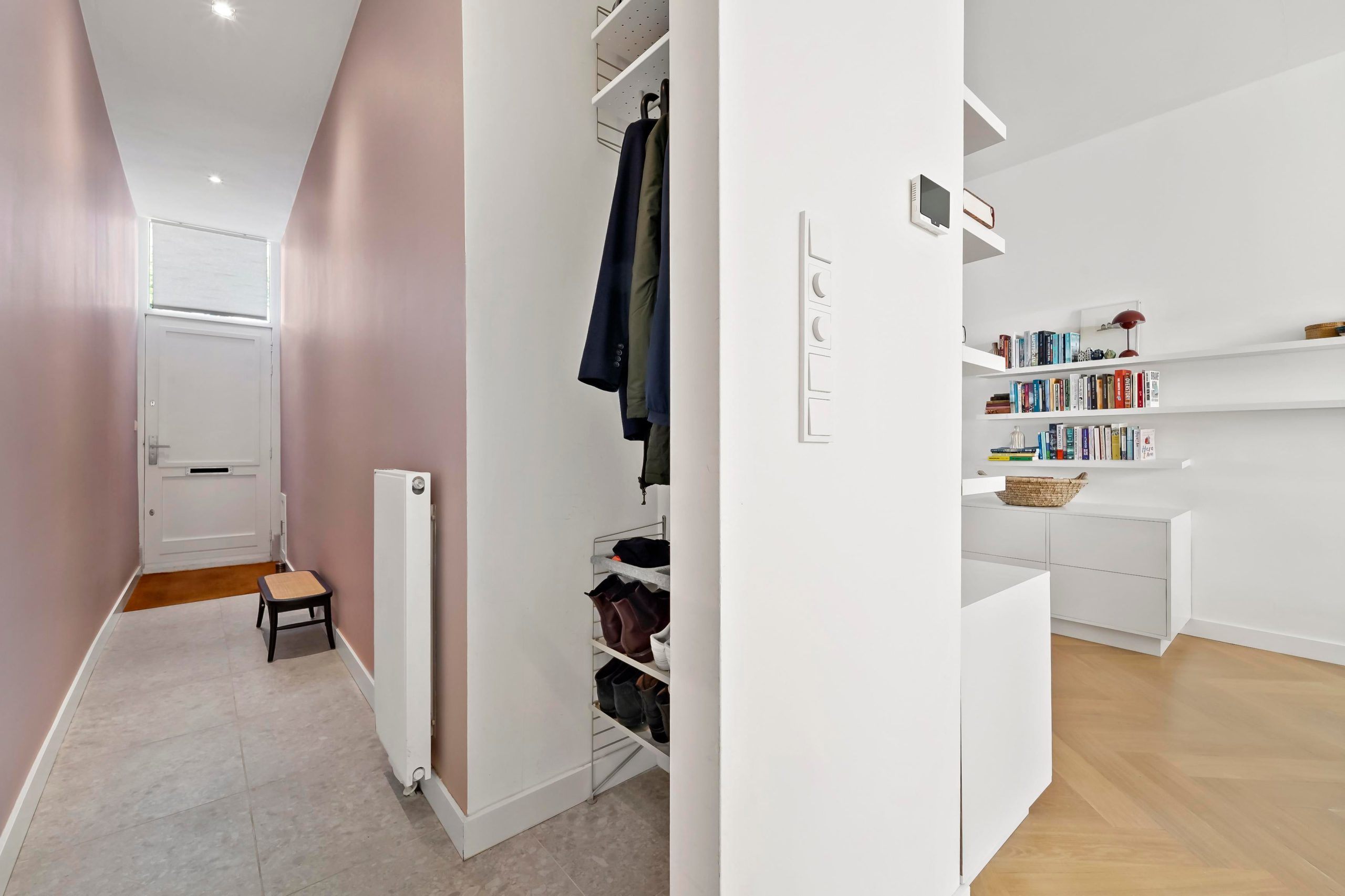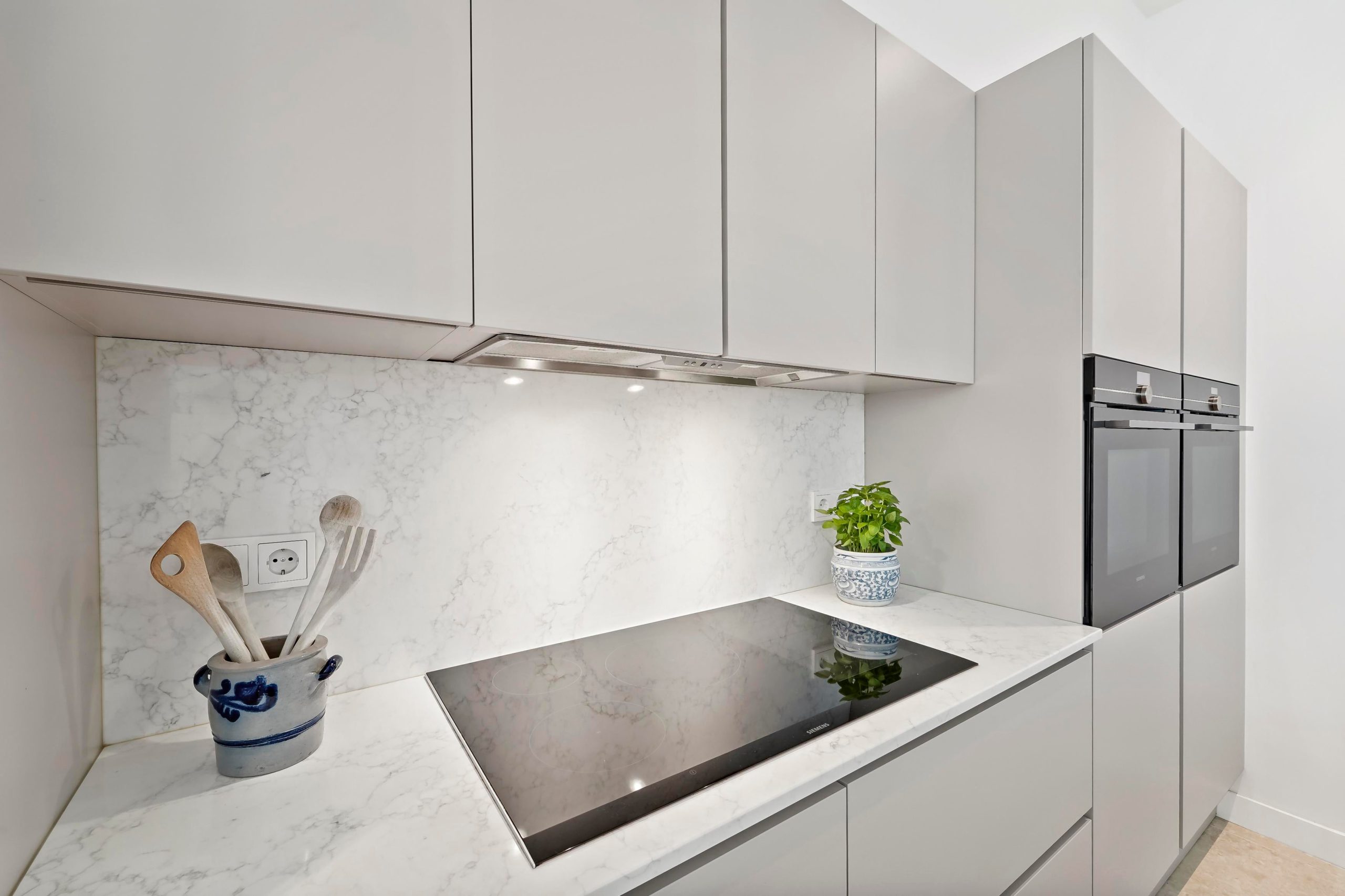 Layout: entrance of the house, hall with wardrobe and deep closet with washing machine and dryer connections. Access to the living room via white steel door. Beautiful kitchen/diner with island with an ‘arabesque polished’ composite top, an oven, combination microwave/oven, dishwasher (all from the Siemens luxury line), a Quooker, and sufficient cupboard space. The kitchen and hall have a beautiful terrazzo tiled floor which fits nicely with the oak herringbone floor of the living room. The spacious living/dining room has lots of light through large windows at the front and French doors at the rear leading to the lovely green and sunny garden with veranda, which has been landscaped under architecture. Access to the second hallway via steel door with toilet with fountain, deep closet with central heating installation and storage space, door to the garden and access to the master bedroom. The fantastic master bedroom has a freestanding bath, walk-in shower (with underfloor heating), washbasin and fitted wardrobes as well as a patio door to the garden. Back in the hallway, stairs to the first floor with two more beautiful bedrooms and a bathroom with a sink, mirror and walk-in shower with underfloor heating in the same style as the bathroom in the master bedroom.