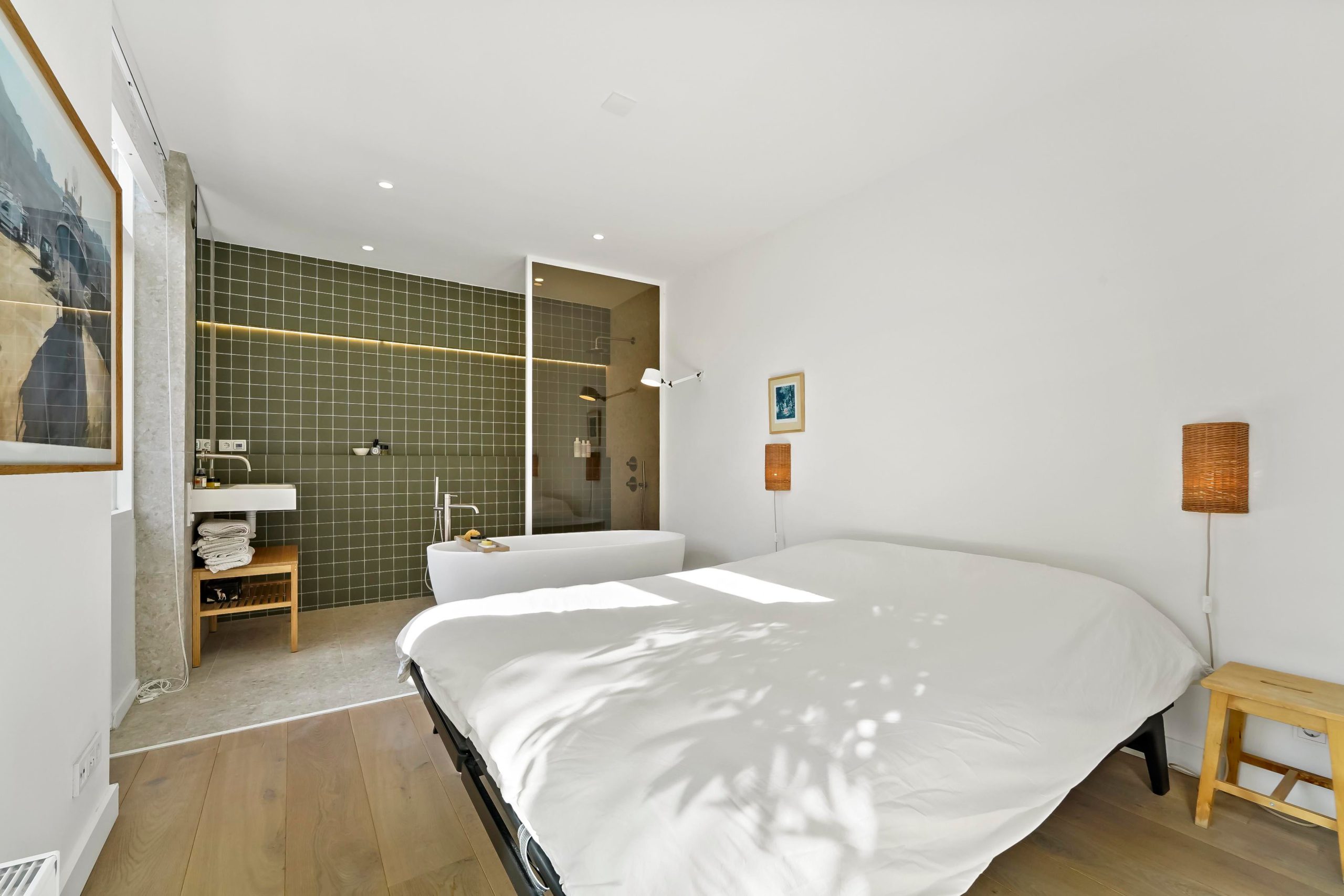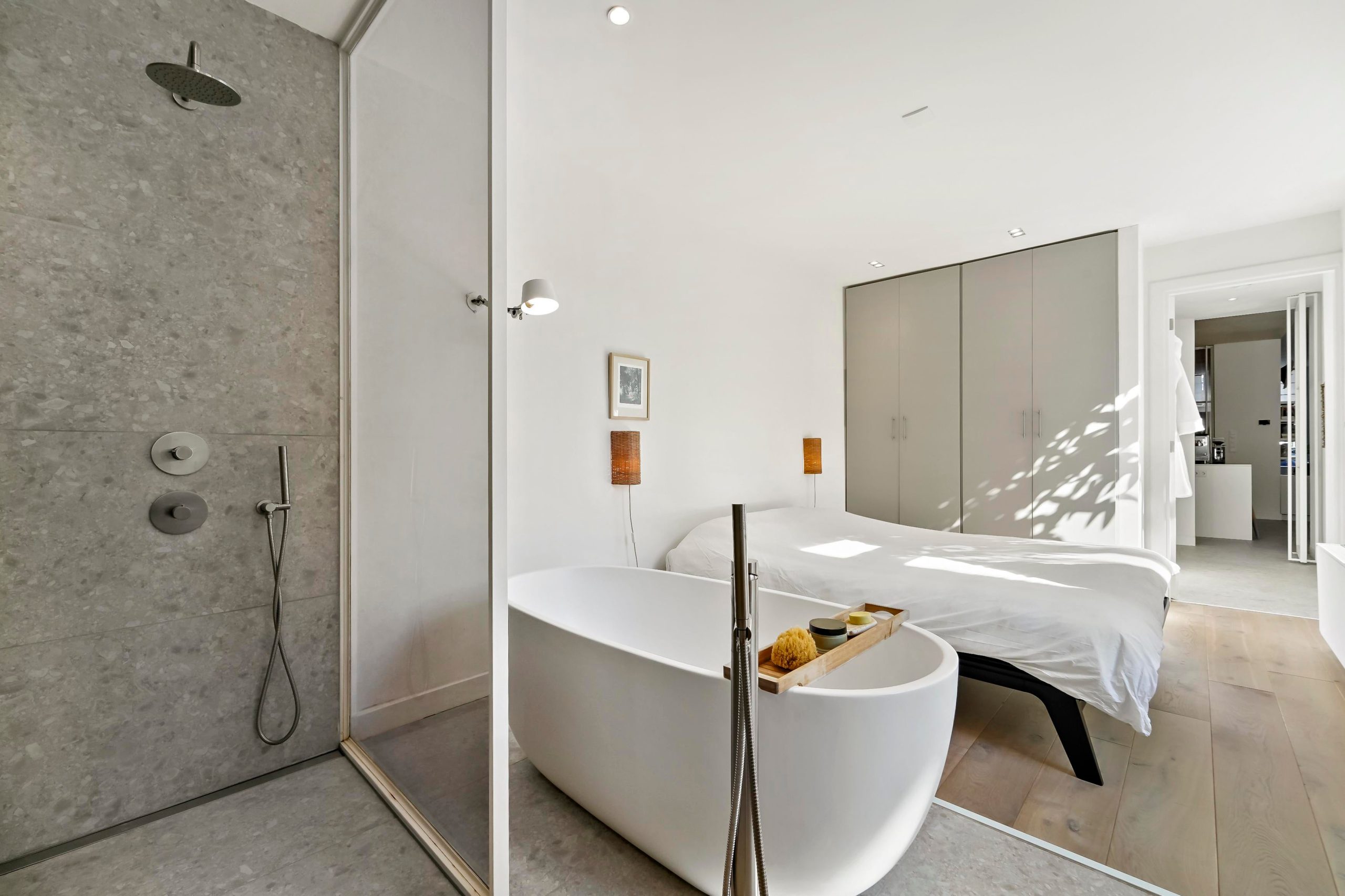 The house is characterized by the beautiful open kitchen, white steel doors, beautiful solid oak herringbone floor and, as a real EYECATCHER, the master bedroom with luxurious open bathroom with freestanding bath, walk-in shower and washbasin!