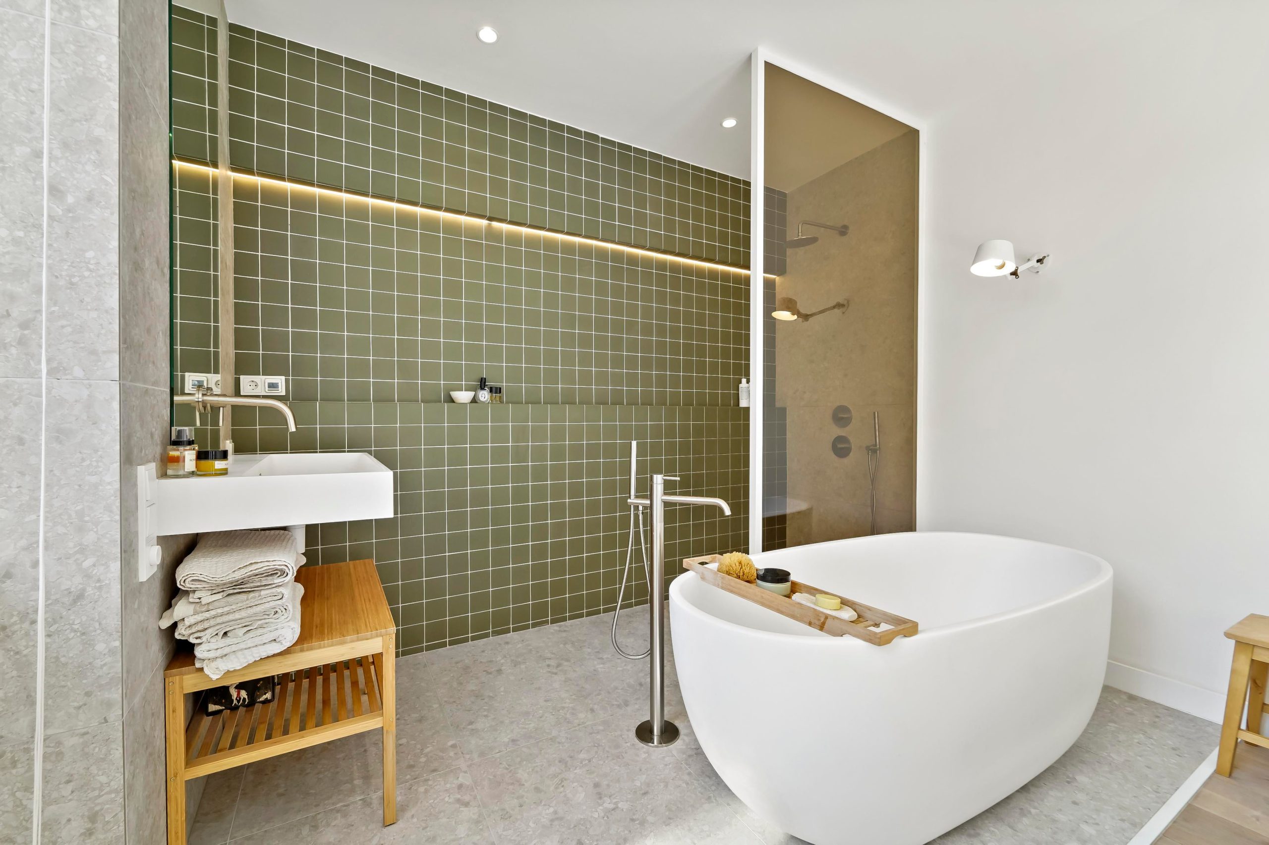 Ligbad, wastafelmeubel, inloopdouche, vloerverwarming geheel, wastafel