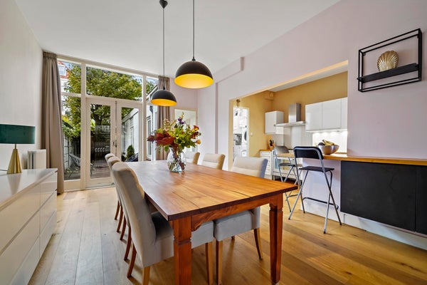 Layout: Entrance of the house, hall, hallway with fixed storage cupboard, meter cupboard and toilet with fountain. From the hallway access to the kitchen and living room. Spacious and bright living/dining room with high ceilings and large windows allowing plenty of light. Semi-open kitchen located at the rear with a beautiful 5-burner gas stove with oven, dishwasher, sink and cozy bar to sit at. Utility room with space for a large fridge/freezer, washing machine and dryer connections and central heating installation. From the back room doors open to the lovely sunny garden facing northwest. Via corridor access to the two bedrooms located in the rear extension and modern bathroom (December 2022) with walk-in shower, washbasin and towel radiator. The entire house has a wooden floor and double glazing.