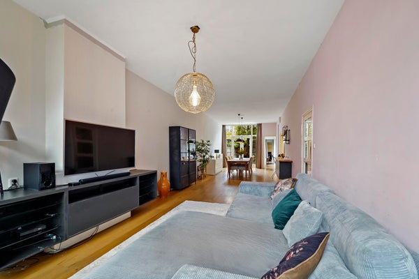 Indeling: Entree woning, tochthal, gang met vaste bergkast, meterkast en toilet met fontein. Vanuit de gang toegang tot de keuken en de woonkamer. Ruime en lichte woon-/eetkamer met hoge plafonds en grote raampartijen waardoor veel lichtinval. Half open keuken gelegen aan de achterzijde voorzien van fraai 5-pits gasfornuis met oven, vaatwasser, spoelbak en gezellige bar om aan te zitten. Bijkeuken met plek voor grote koelkast, wasmachine en droger aansluiting en CV opstelplaats. Vanuit de achterkamer openslaande deuren naar de heerlijke zonnige tuin gelegen op het noordwesten. Via gang toegang tot de twee slaapkamers gelegen in de achteruitbouw en moderne badkamer (december 2022) met inloopdouche, wastafelmeubel en handdoekradiator. De gehele woning is voorzien van een houten vloer en dubbelglas.