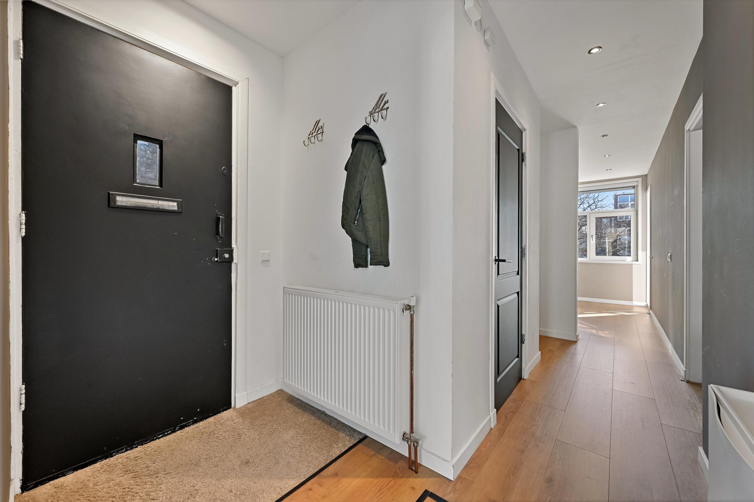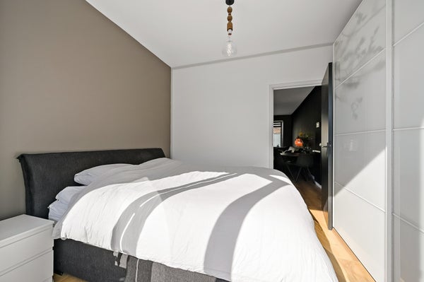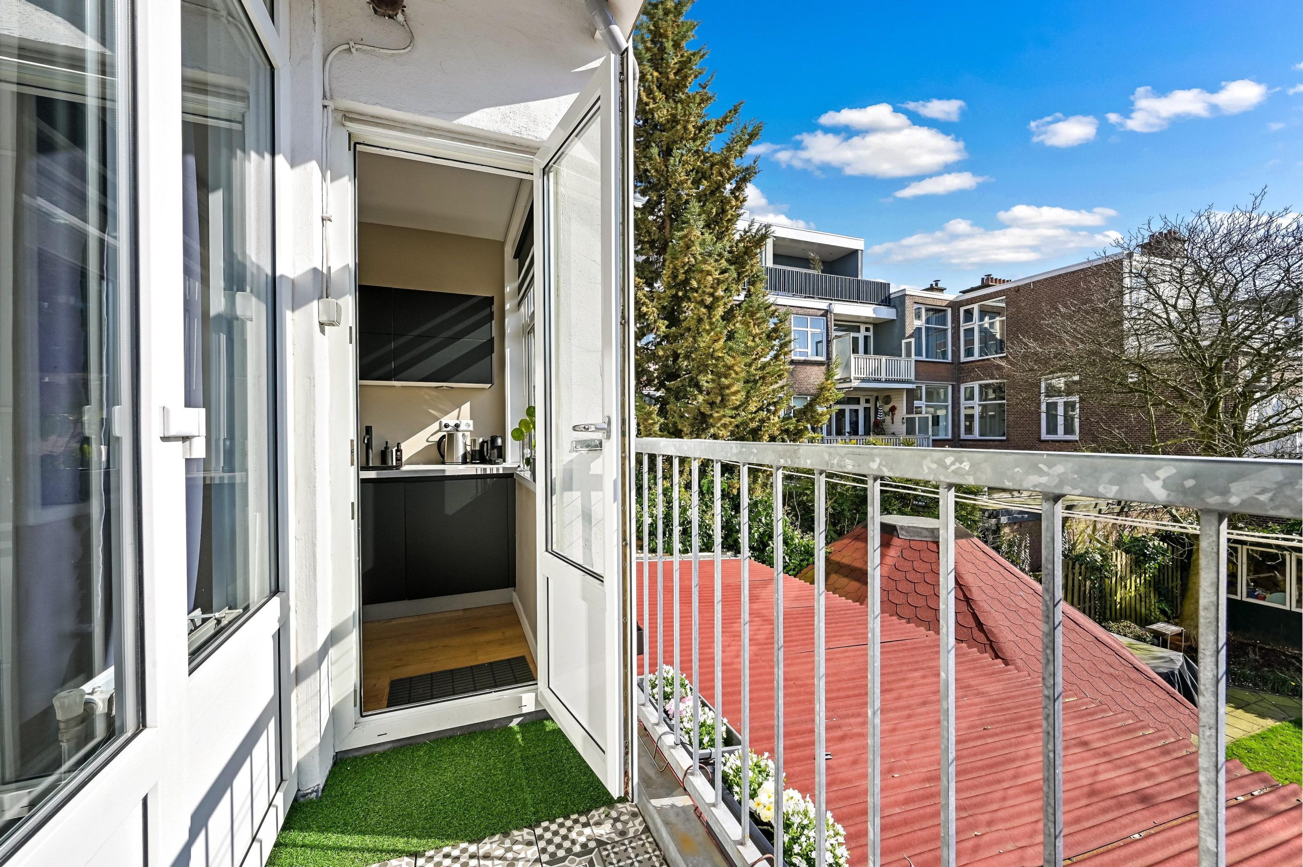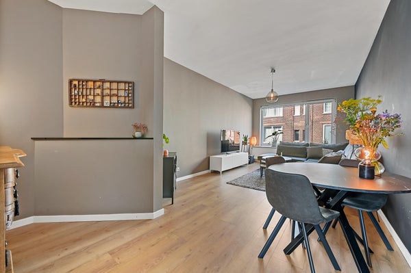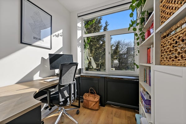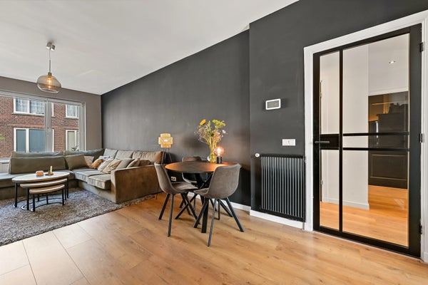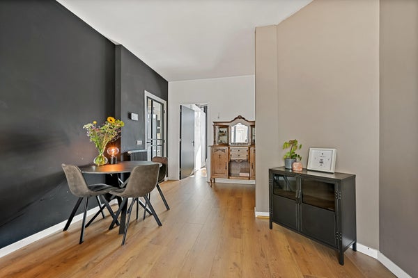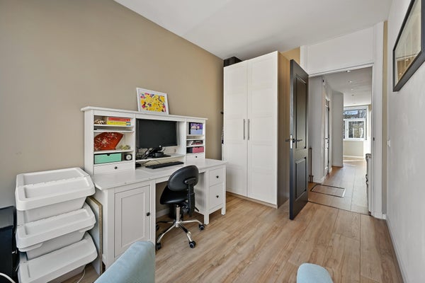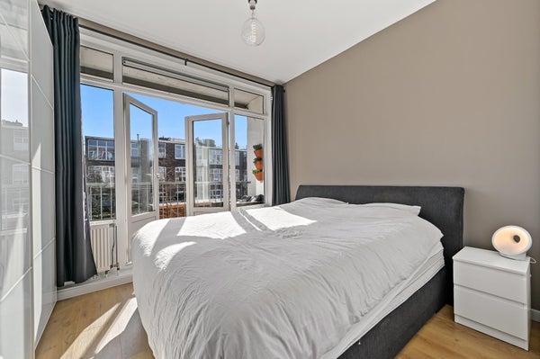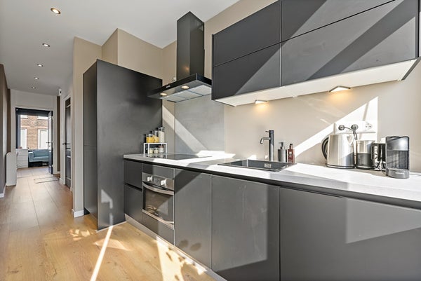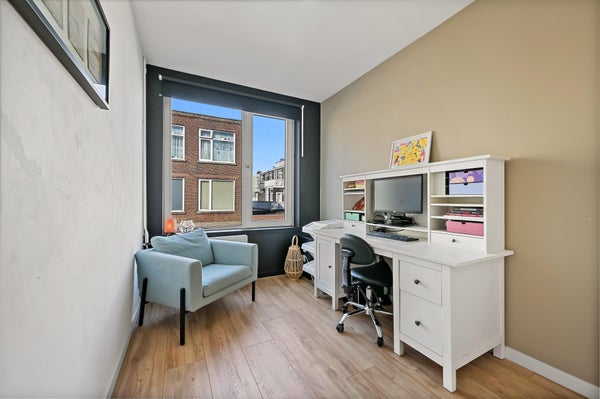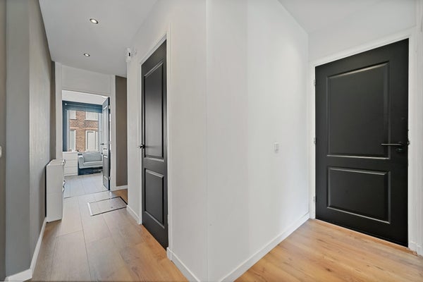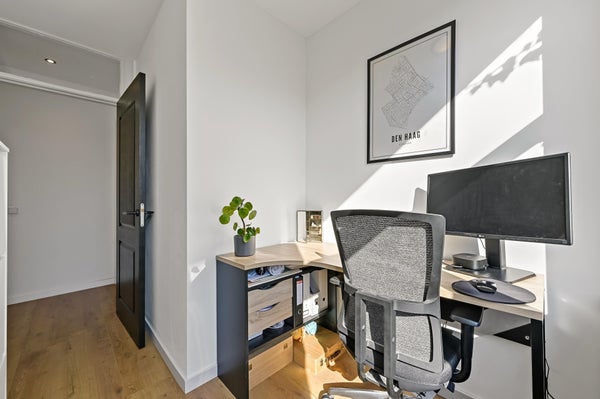 Layout: open Hague porch with stairs to the first floor. Entrance house, hallway with access to all rooms and equipped with a fixed cupboard with storage space. Spacious living / dining room located at the front of the house with access to the master bedroom located at the rear. Through French doors access to the lovely sunny balcony located on the southeast. Modern black kitchen (2021) equipped with various built-in appliances such as fridge/freezer, combination microwave, induction hob, dishwasher, built-in washer-dryer, location of the central heating boiler and again access to the balcony. Second bedroom/study located at the rear. Bathroom (2022) with toilet, walk-in shower, sink and towel radiator. Third bedroom located at the front. The entire house has a beautiful laminate floor and HR+ glass in plastic frames.