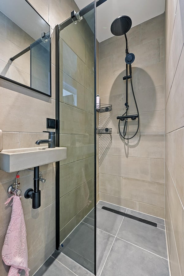 Inloopdouche, hangend toilet, wastafel, wastafelmeubel