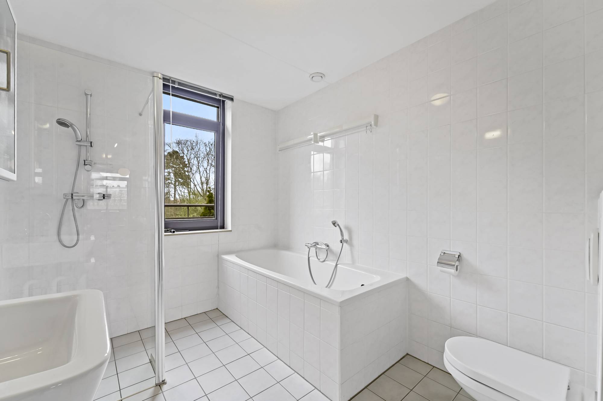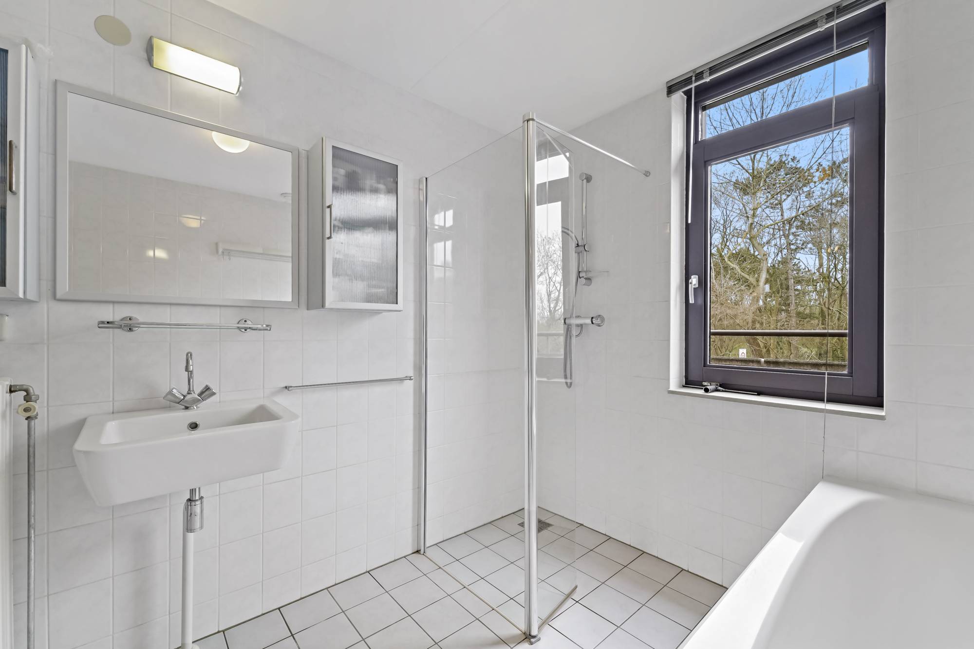 Op de eerste verdieping, met ruime overloop, bevinden zich 3 ruime slaapkamers. Via de slaapkamer aan de voorzijde toegang tot het balkon gelegen op het westen met uitzicht over de Bosjes van Pex. De twee slaapkamers aan de achterkant hebben groen uitzicht over de tuin. Ruime badkamer voorzien van inloopdouche, bad, wastafel en toilet.