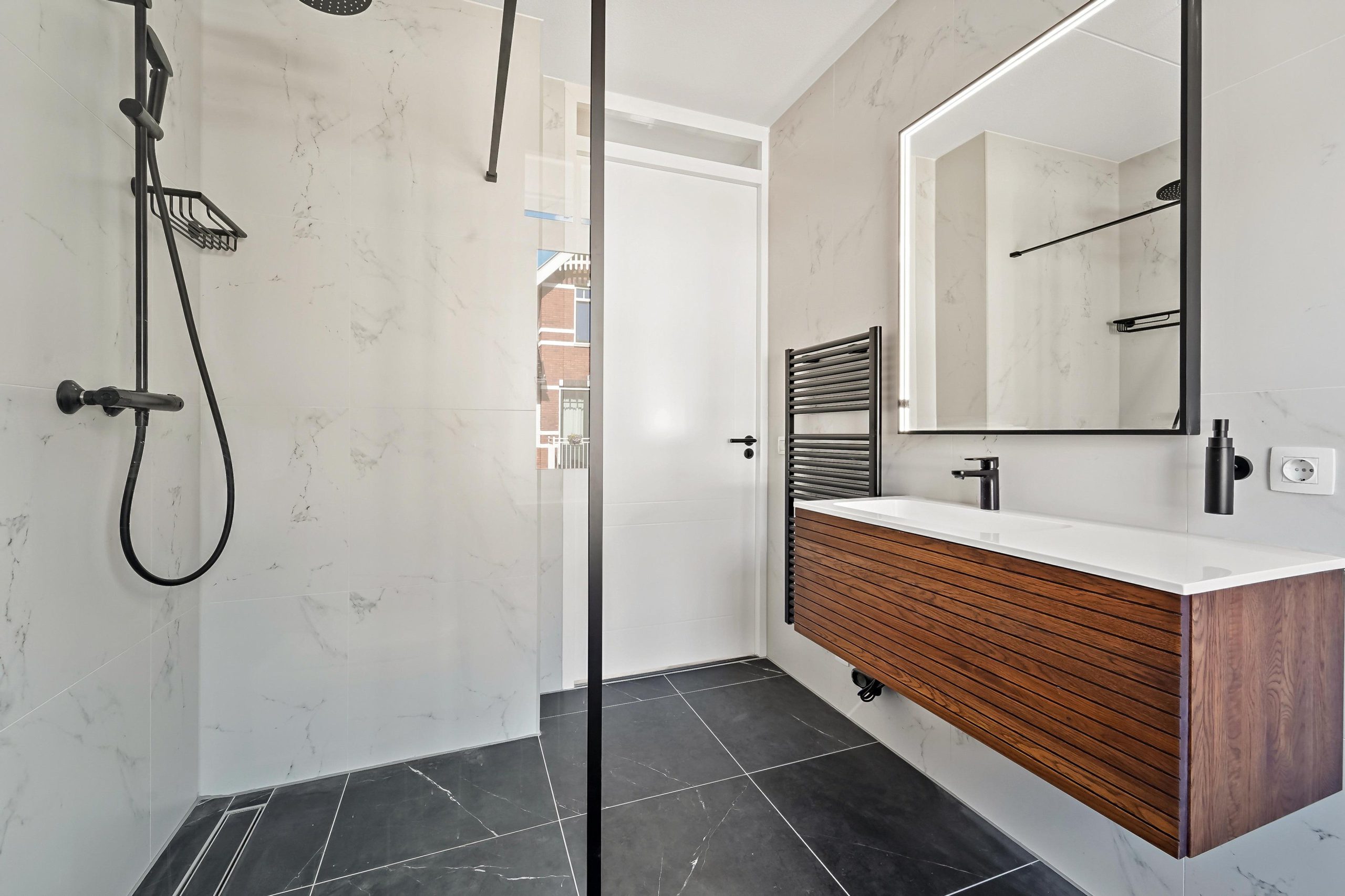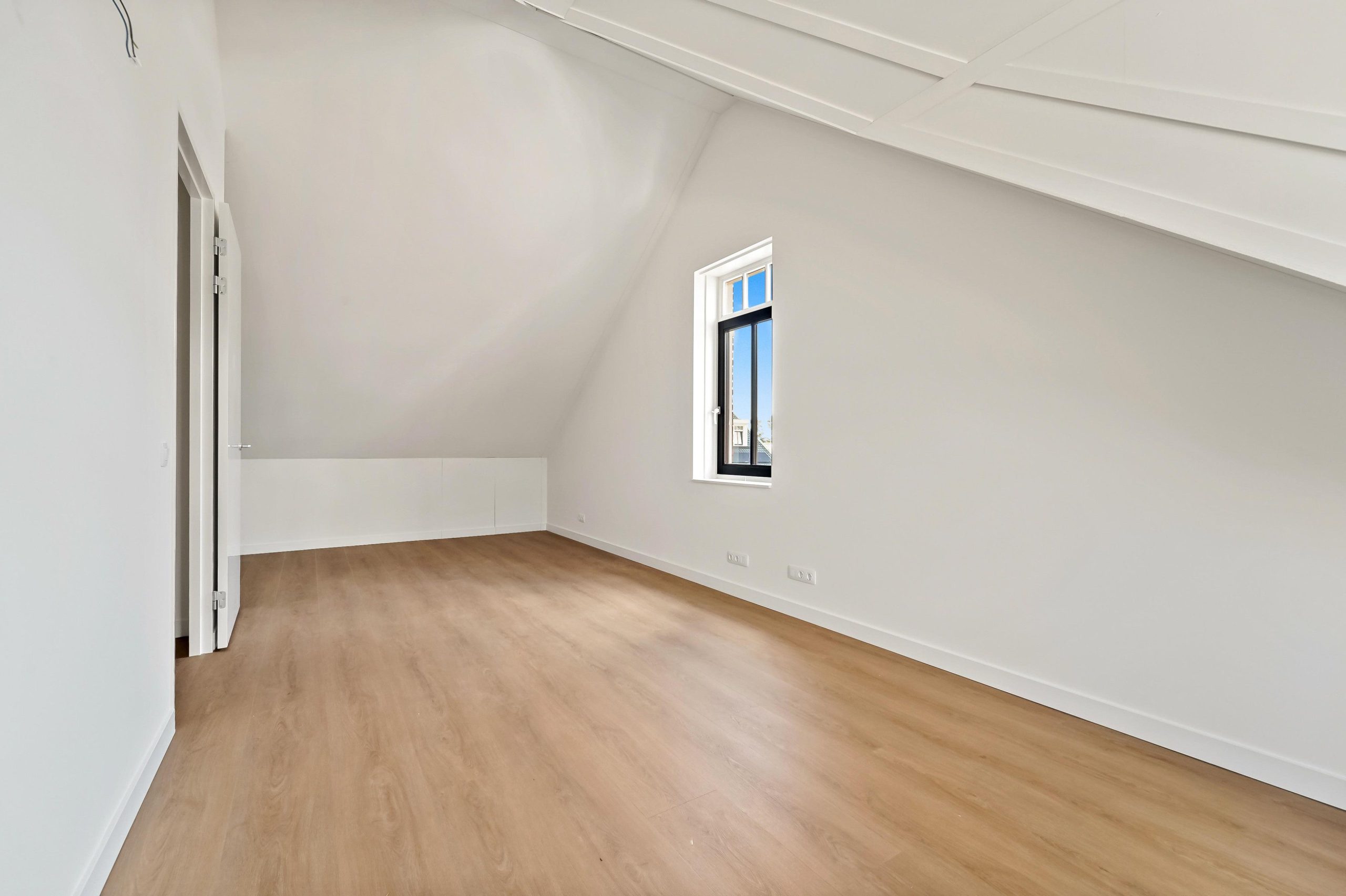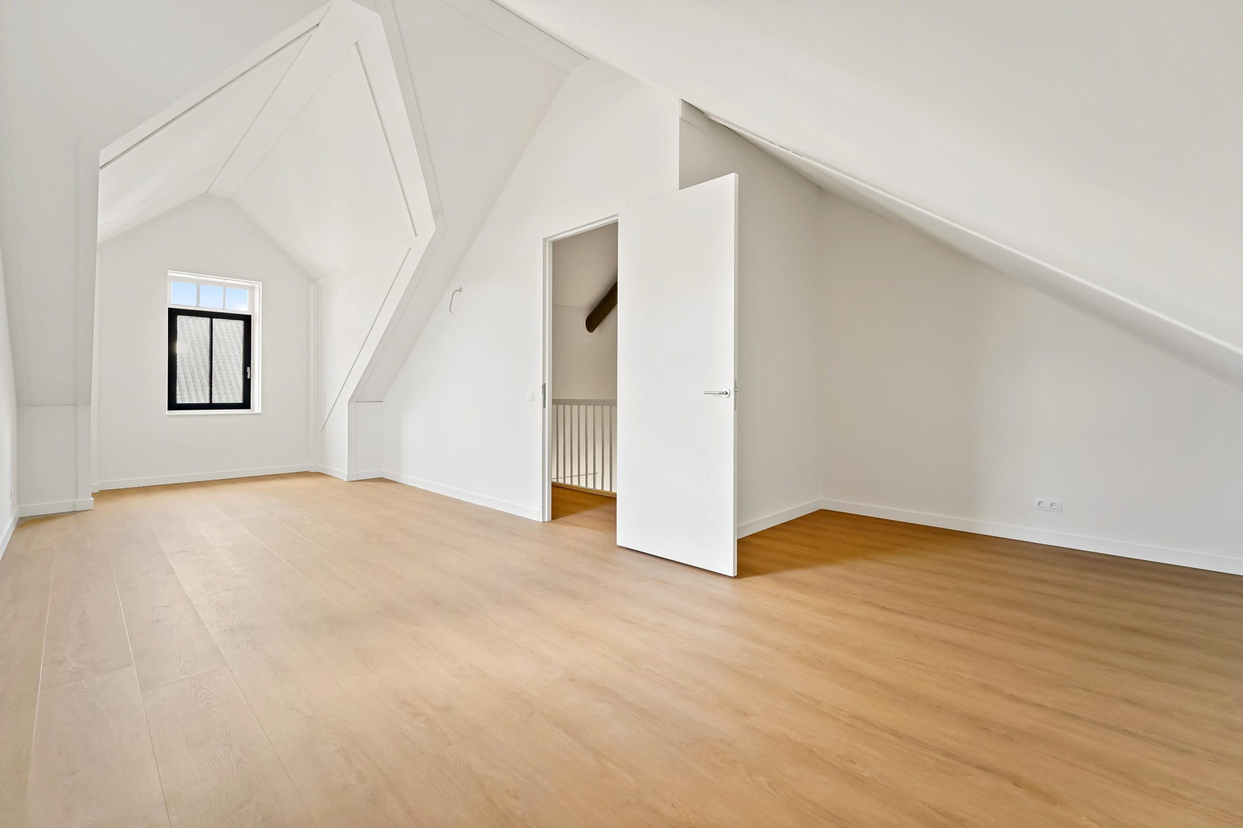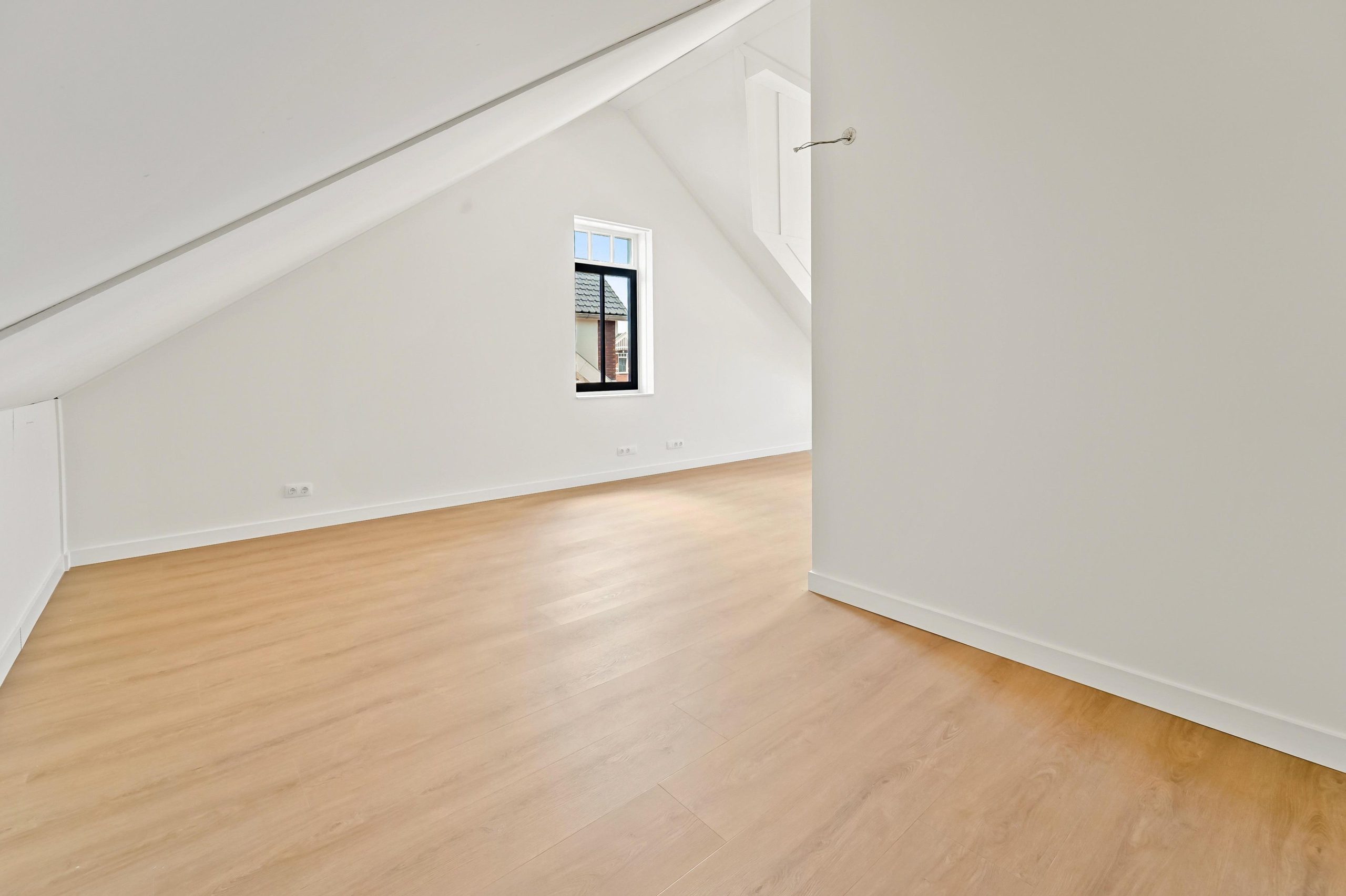 Vanuit de gang trap naar de eerste etage, overloop met toegang tot de drie ruime slaapkamers en badkamer. Badkamer is voorzien van inloopdouche, dubbel wastafelmeubel, toilet, handdoekradiator en vloerverwarming. Via de slaapkamer gelegen aan de voorzijde toegang door middel van openslaande deuren naar het balkon. Trap naar de 2e etage, overloop, technische ruimte met WTW-ventilatie-unit en aasluiting voor de wasmachine en droger. Grote open zolder met dakkapel aan de voorzijde waar gemakkelijk 2 slaapkamers gecreëerd kunnen worden.