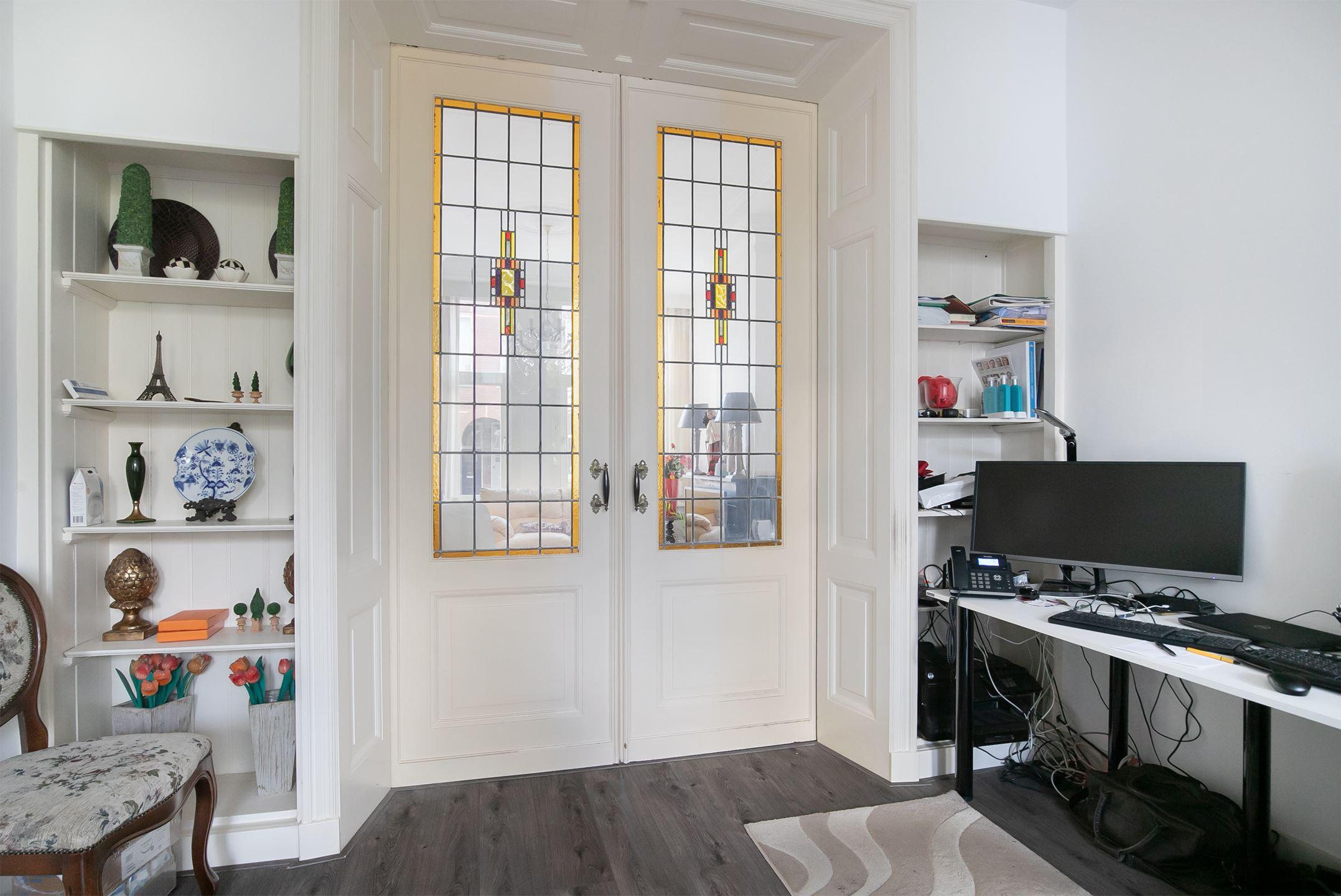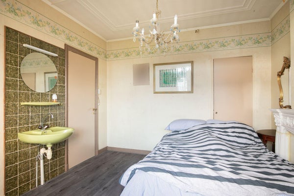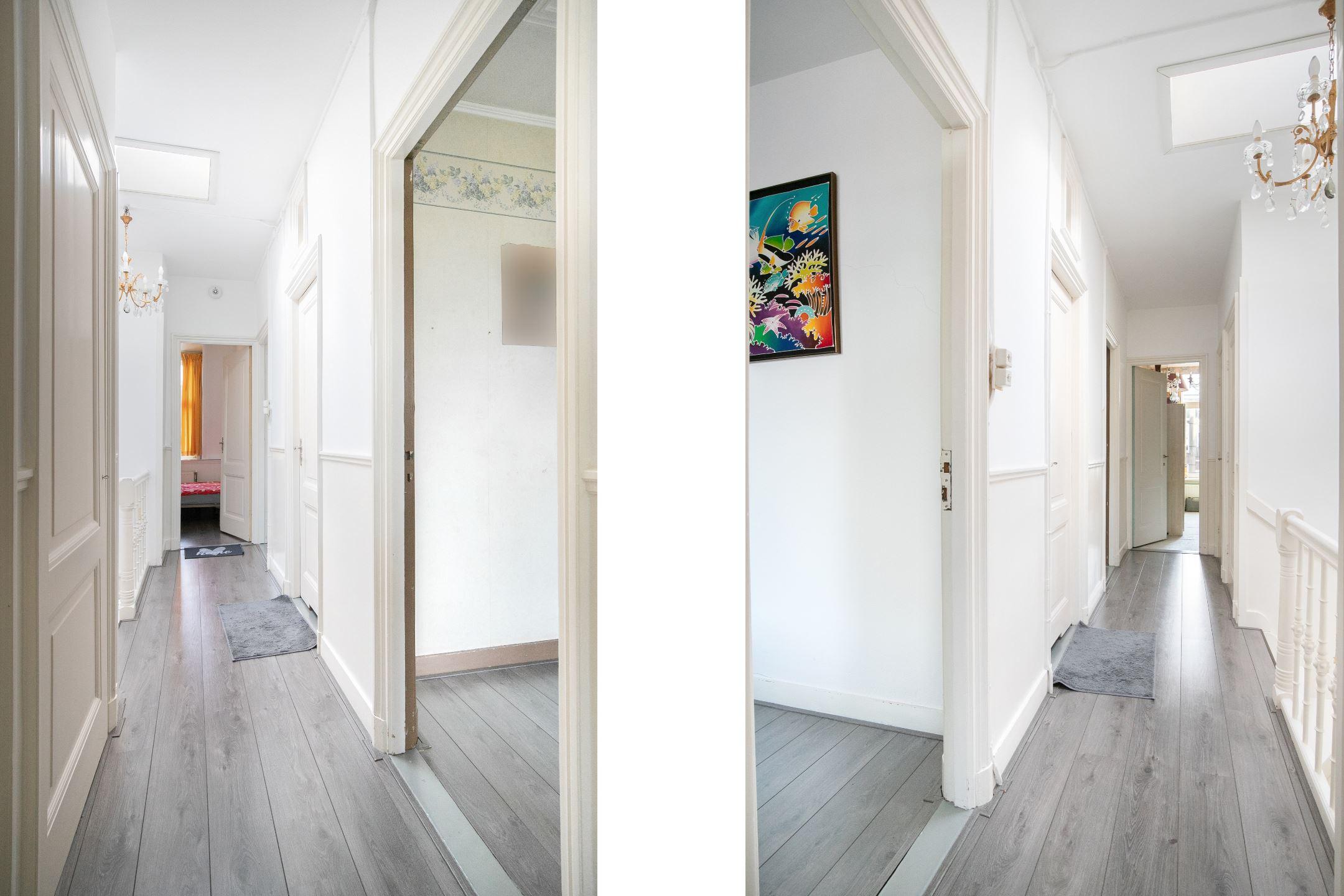 Overloop met toilet en vaste kast. Kamer en suite (goed te gebruiken als woon- eetkamer) welke nog is voorzien van de separatie, schouwen en vaste kasten. Tevens mooie plafonds aanwezig.