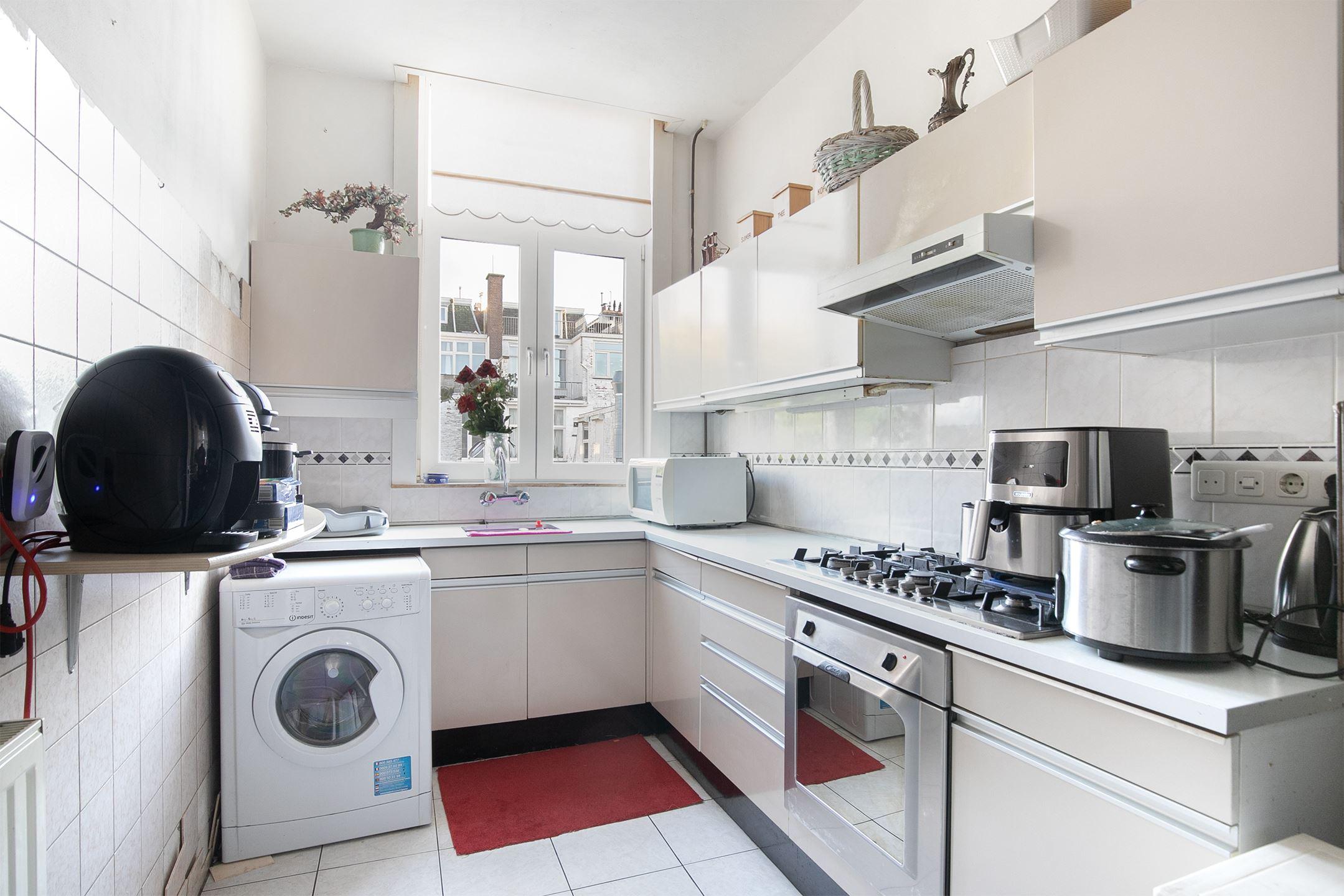 Zijkamer met toegang naar klein balkon aan de voorzijde gelegen. Ruime, maar eenvoudige keuken, gelegen aan de achterzijde welke is voorzien van diverse (inbouw)apparatuur. Er is o.a. sprake van een zes pits gaskookplaat, oven, afzuigkap, opstelplaats wasmachine en koel-vriescombinatie. Trapopgang naar de tweede verdieping.
