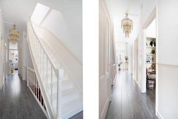 Eigen entree op straatniveau, halletje met trapopgang naar de eerste verdieping.