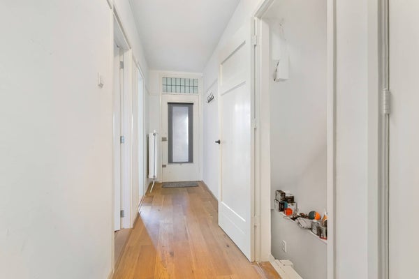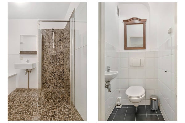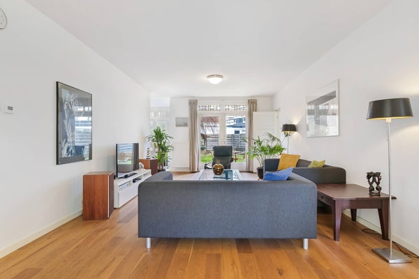 Indeling: Entree op straatniveau via gesloten portiek. Gang met toilet met fontein en bergkast. Sfeervolle woon- eetkamer en suite met aan zowel aan de voor als achterzijde openslaande deuren naar buiten wat voor veel licht zorgt. Woonkamer aan de achterzijde