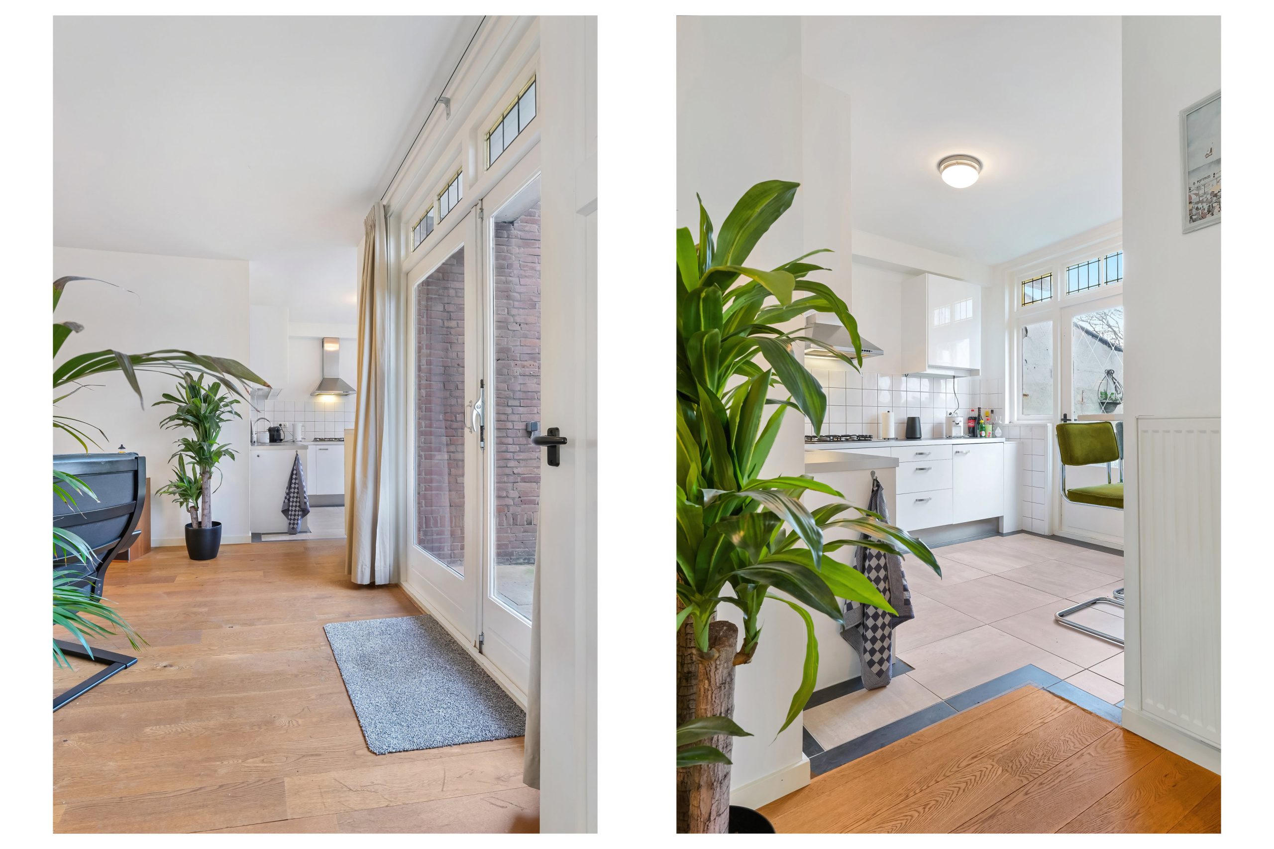 Indeling: Entree op straatniveau via gesloten portiek. Entree woning. Gang met toilet met fontein en bergkast met wasmachineaansluiting. Sfeervolle woon- eetkamer en suite met aan zowel aan de voor als achterzijde openslaande deuren naar buiten wat voor veel licht zorgt. Woonkamer aan de achterzijde met openslaande deuren naar de zeer ruime tuin waar u de hele dag van de zon kunt genieten. Half open keuken met diverse (inbouw)apparatuur zoals 4-pits gasfornuis, oven, koelkast, vriezer en vaatwasser. Eetkamer gelegen aan de voorzijde met openslaande deuren naar de voortuin met oprit. Twee ruime slaapkamers gelegen in de zij aanbouw. Vanuit de gang toegang tot de badkamer met ligbad, douche en wastafel. De gehele woning is voorzien van een prachtige houten vloer. Vanuit de gang is de ruime kelder te bereiken (sta hoogte). Een ideale berging!