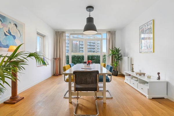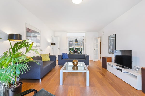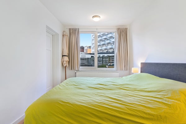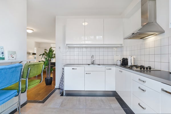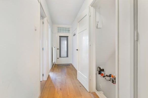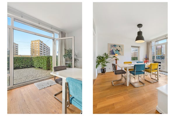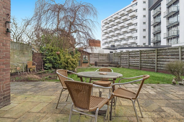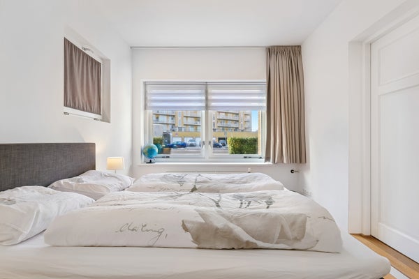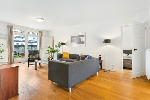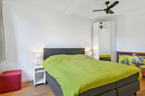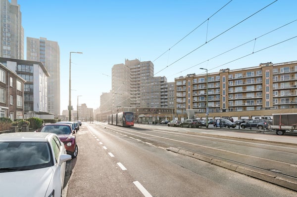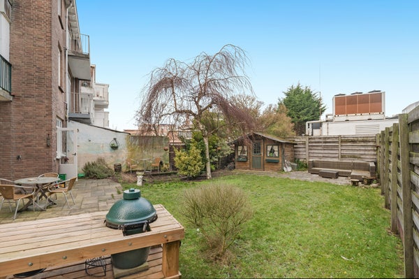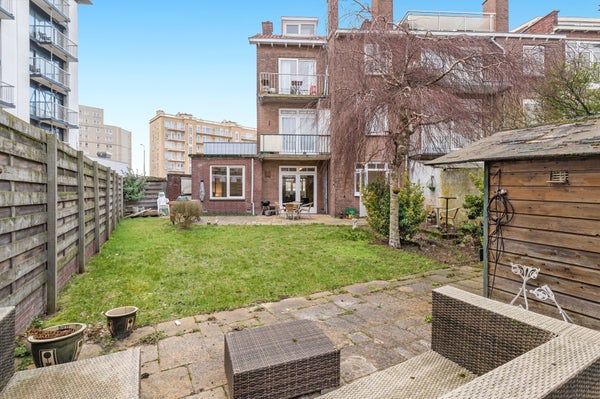 At a 150 meter walk from the beach and the boulevard you will find this great ground floor apartment 102m2 with a huge backyard with storage room, front garden and a private driveway with several parking spaces! Live and enjoy. The house has 2 large bedrooms with an ensuite living room which can also be used as a bedroom. The house also has a basement with plenty of storage space and the leasehold canon has been bought off!
