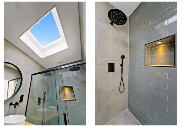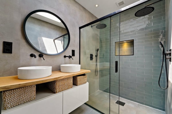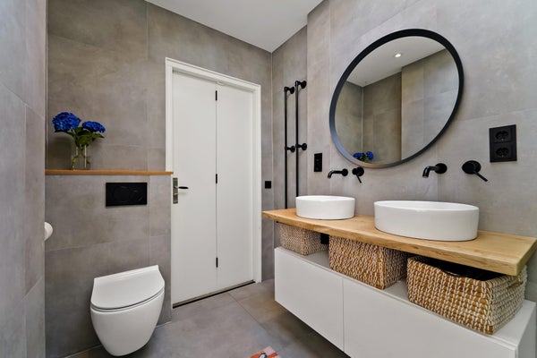 Dubbele wastafel, vloerverwarming geheel, toilet, inloopdouche, hangend toilet