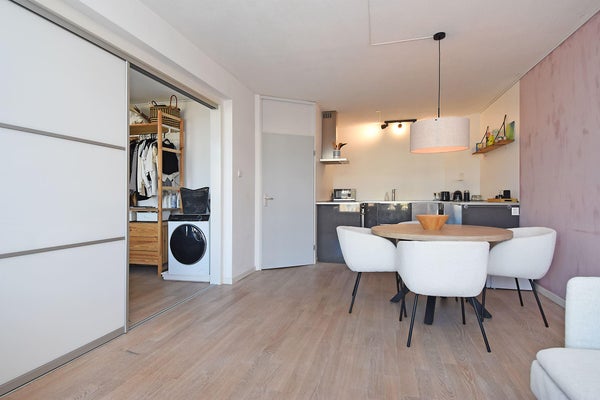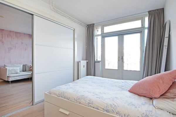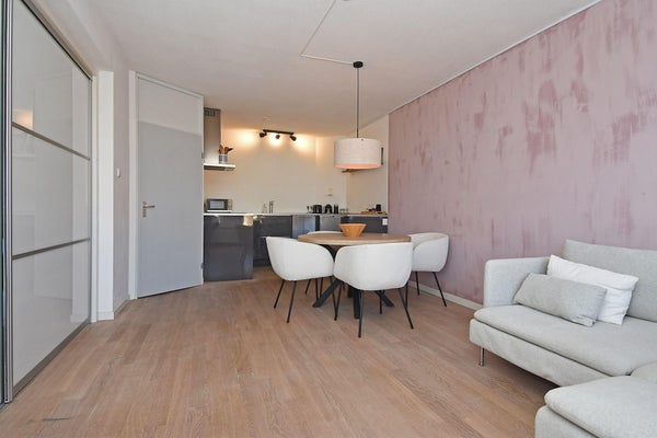 Hal met meterkast en toilet. Moderne badkamer met inloopdouche met glazen wand en brede wastafel met ladekast, spiegel en verlichting. Ruime en lichte woonkamer met open keuken in U vormige opstelling met 4 pits keramische kookplaat, RVS circulatiekap, oven, vaatwasser en koelkast. Middels fraaie schuifwand toegang tot de naastgelegen ruime slaapkamer met openslaande deuren naar het balkon aan voorzijde met namiddag- en avondzon.