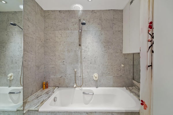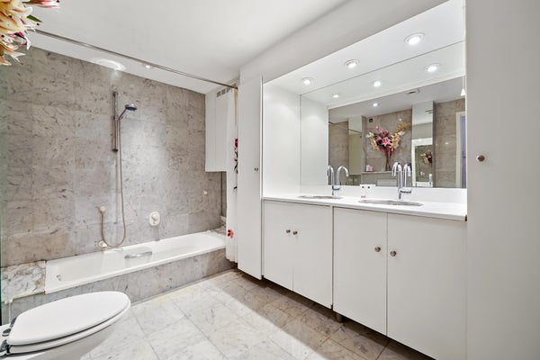 Ligbad, dubbele wastafel, toilet, wastafelmeubel
