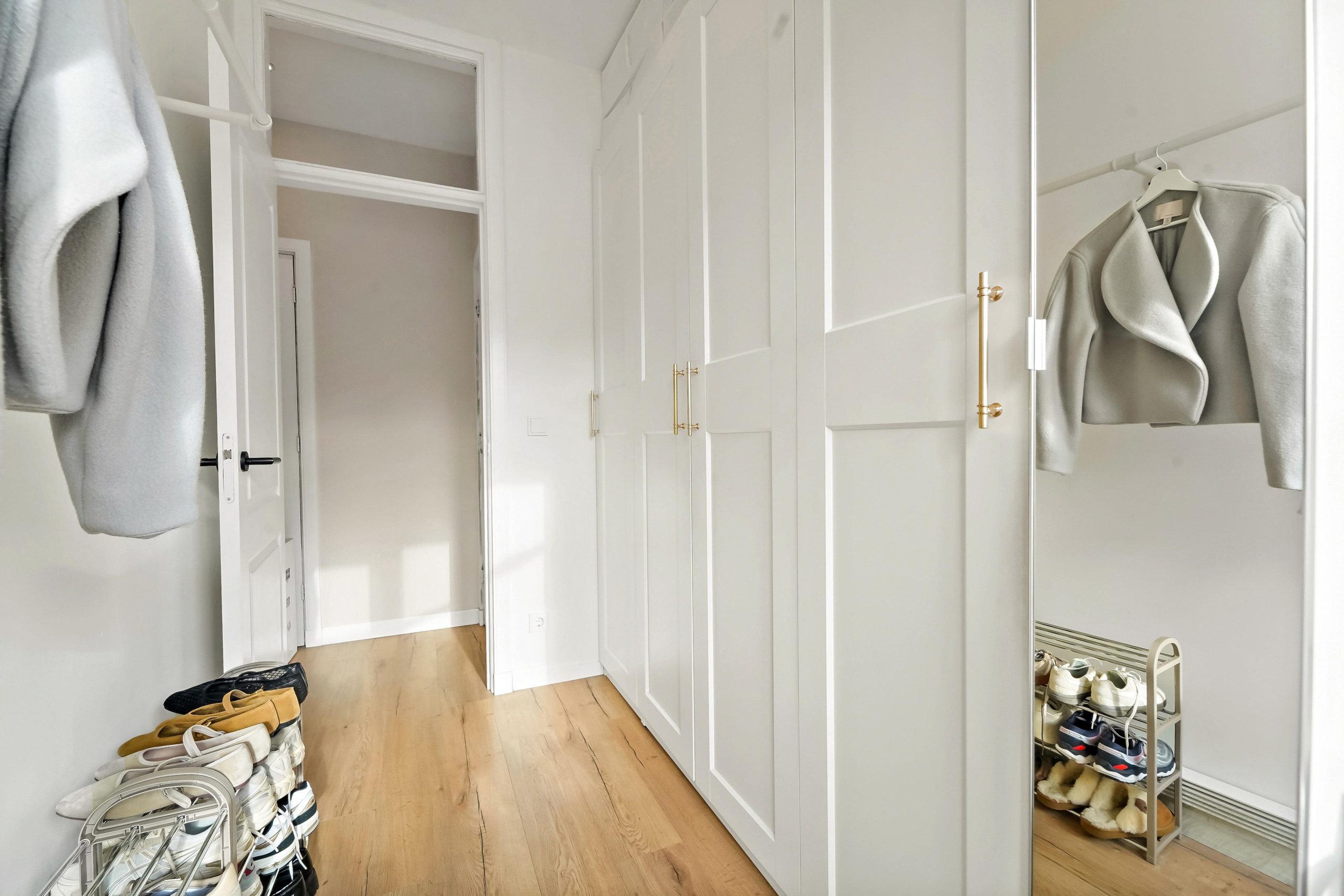 Open Haags portiek met trap naar de eerste etage. Entree woning, hal, gang met toegang tot alle vertrekken. Toilet met fontein, meterkast en provisiekast. Lichte doorzon woon-/eetkamer met luxe open keuken gelegen aan de achterzijde voorzien van inductiekookplaat, afzuigkap, combimagnetron, koel-/vriescombinatie en vaatwasser. Vanuit de achterkamer via openslaande deuren toegang tot het heerlijke balkon (11m2) gelegen op het zuidoosten met ochtend- en middagzon. Hoofdslaapkamer gelegen aan de voorzijde. Tweede slaapkamer gelegen aan de achterzijde met wederom toegang tot het balkon. Badkamer voorzien van inloopdouche, wastafelmeubel en wasmachine en droger aansluiting. De gehele woning is voorzien van een mooie laminaatvloer en kunststof kozijnen met dubbel glas.