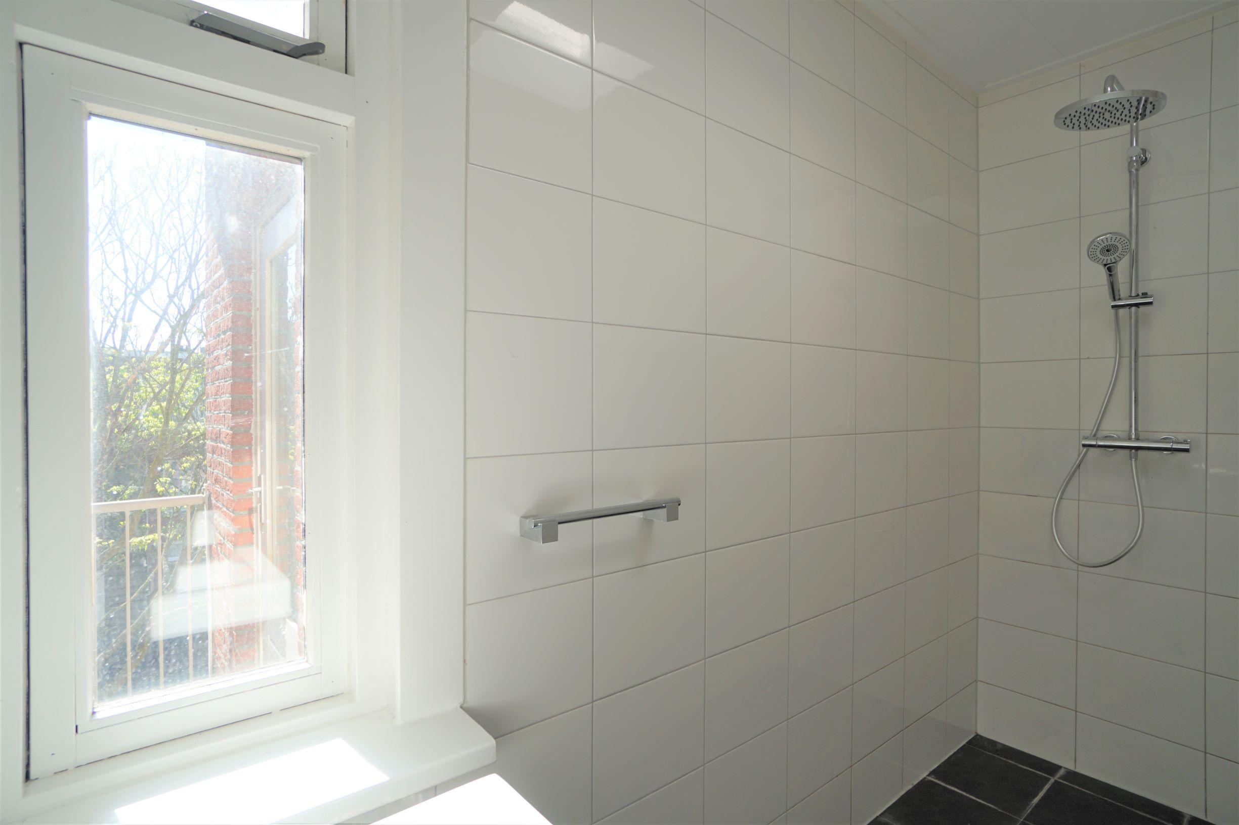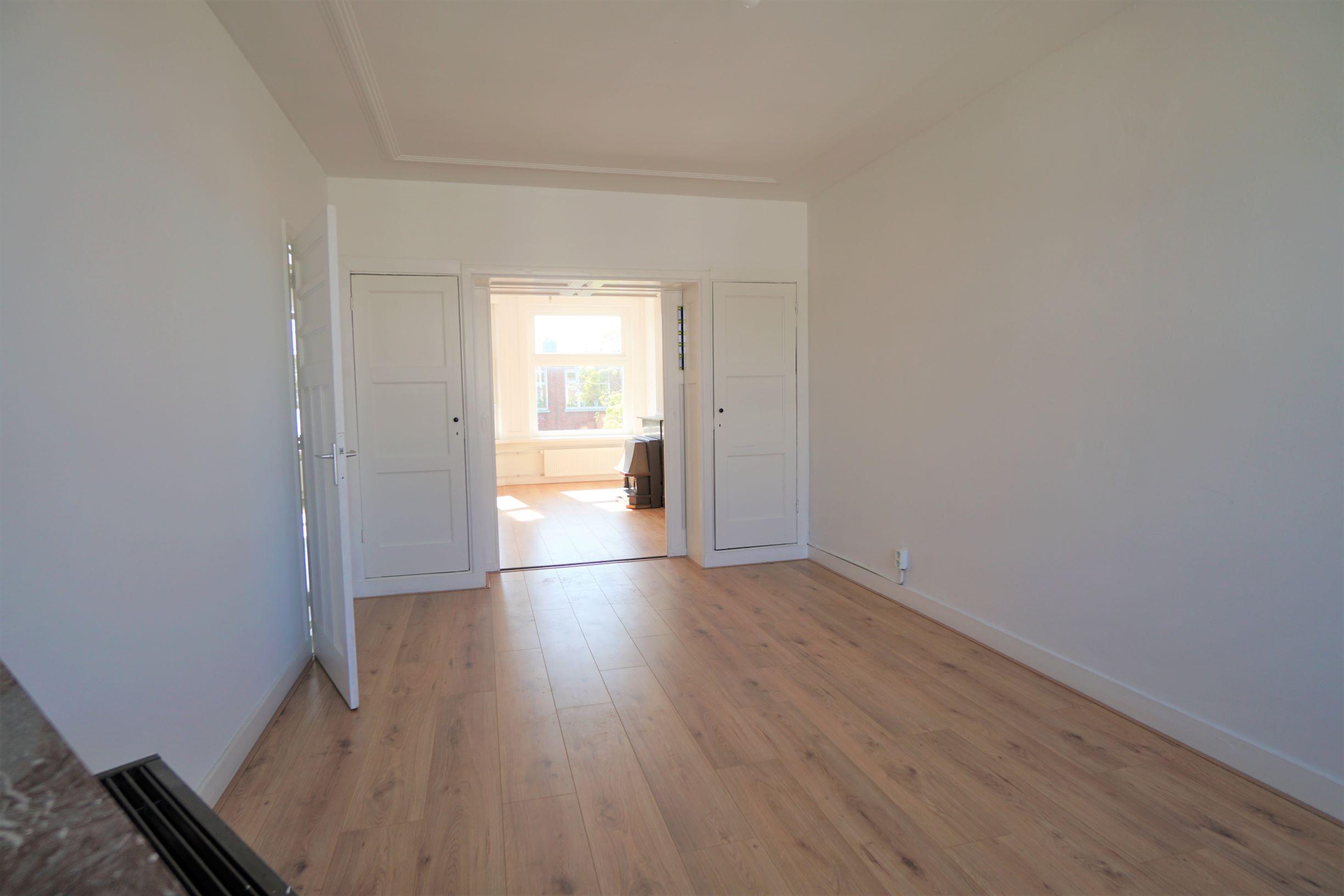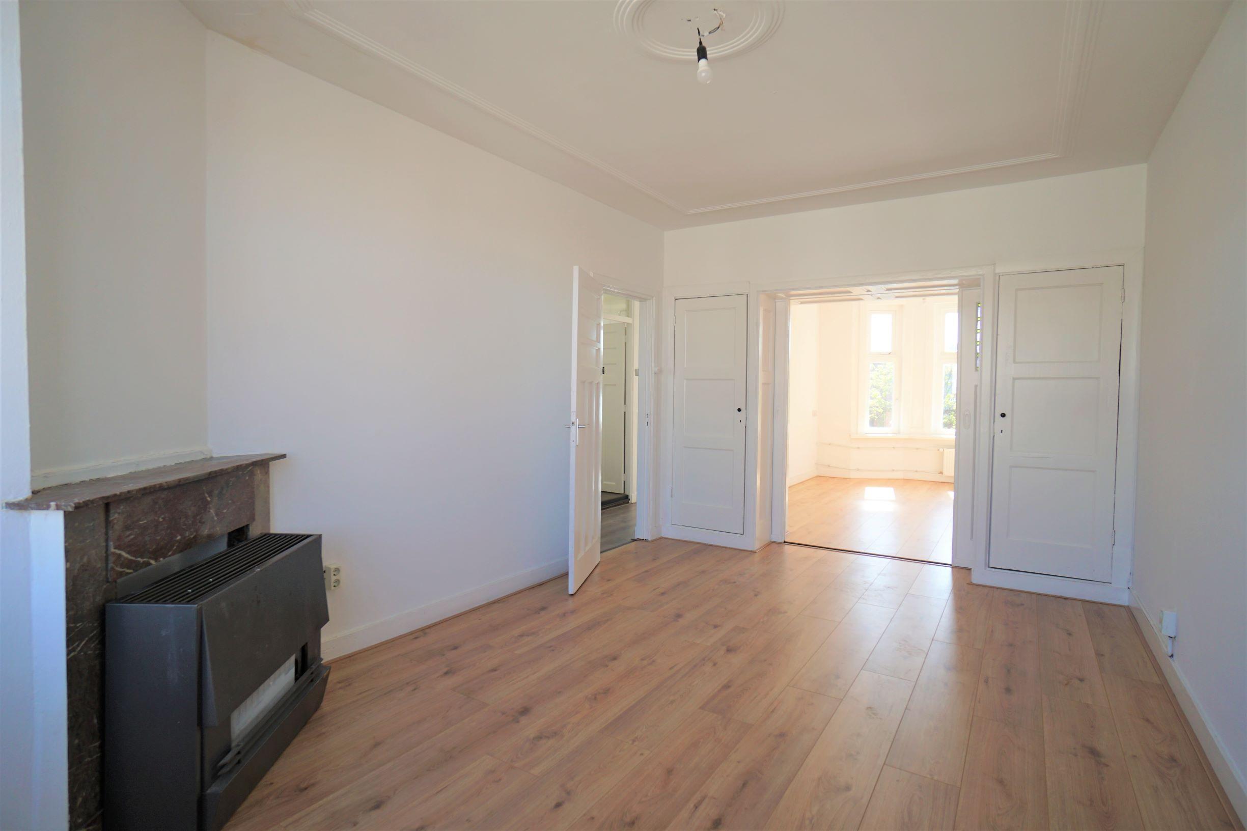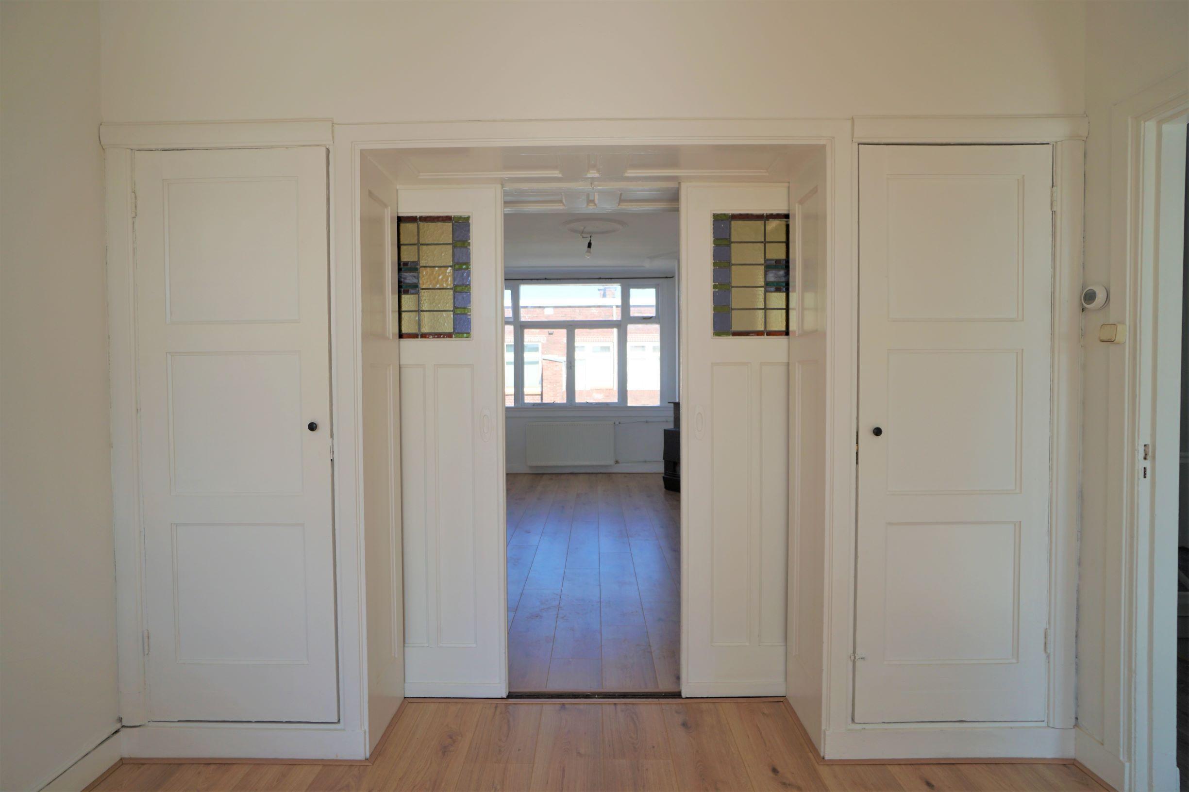 entree 1e etage middels Haags portiek, (fietsen-)bergruimte; binnentrap naar 2e etage; overloop; suite voorkamer, circa 5. m x 3,40 m met originele schouw, schuifdeuren en kastenseparatie en stucplafonds naar suite achterkamer, circa 5,50 m x 3,40 m met originele schouw; voorzijkamer, circa 3,10 m x 2,60 m met balkonnetje; achterzijkamer, circa 2,10 m x 3,50 m; royale doucheruimte, circa 2,85 m x 1,75 m met inloopdouche, dubbel wastafelmeubel, handdoek radiator, voorzieningen wasmachine en droger en wand- en vloertegelwerk; keuken, wit Bruynzeel aanrechtblok, onder- en bovenkasten, r.v.s. blad, 2 spoelbakken en wit wandtegelwerk, gasfornuis met oven en afzuigkap; toilet; achterbalkon.