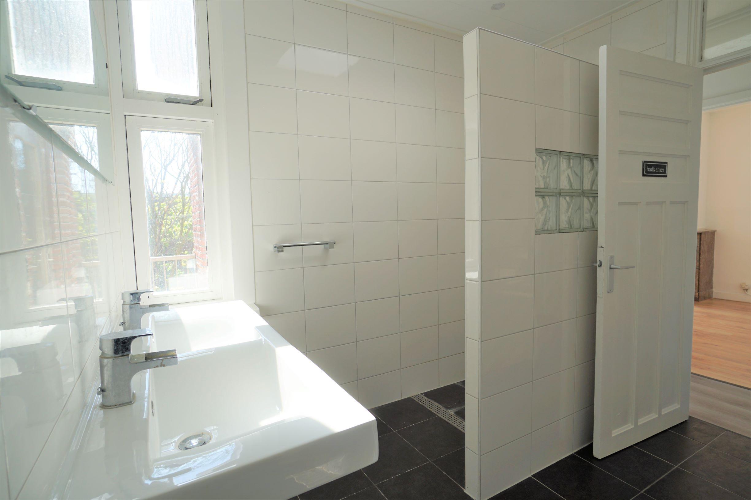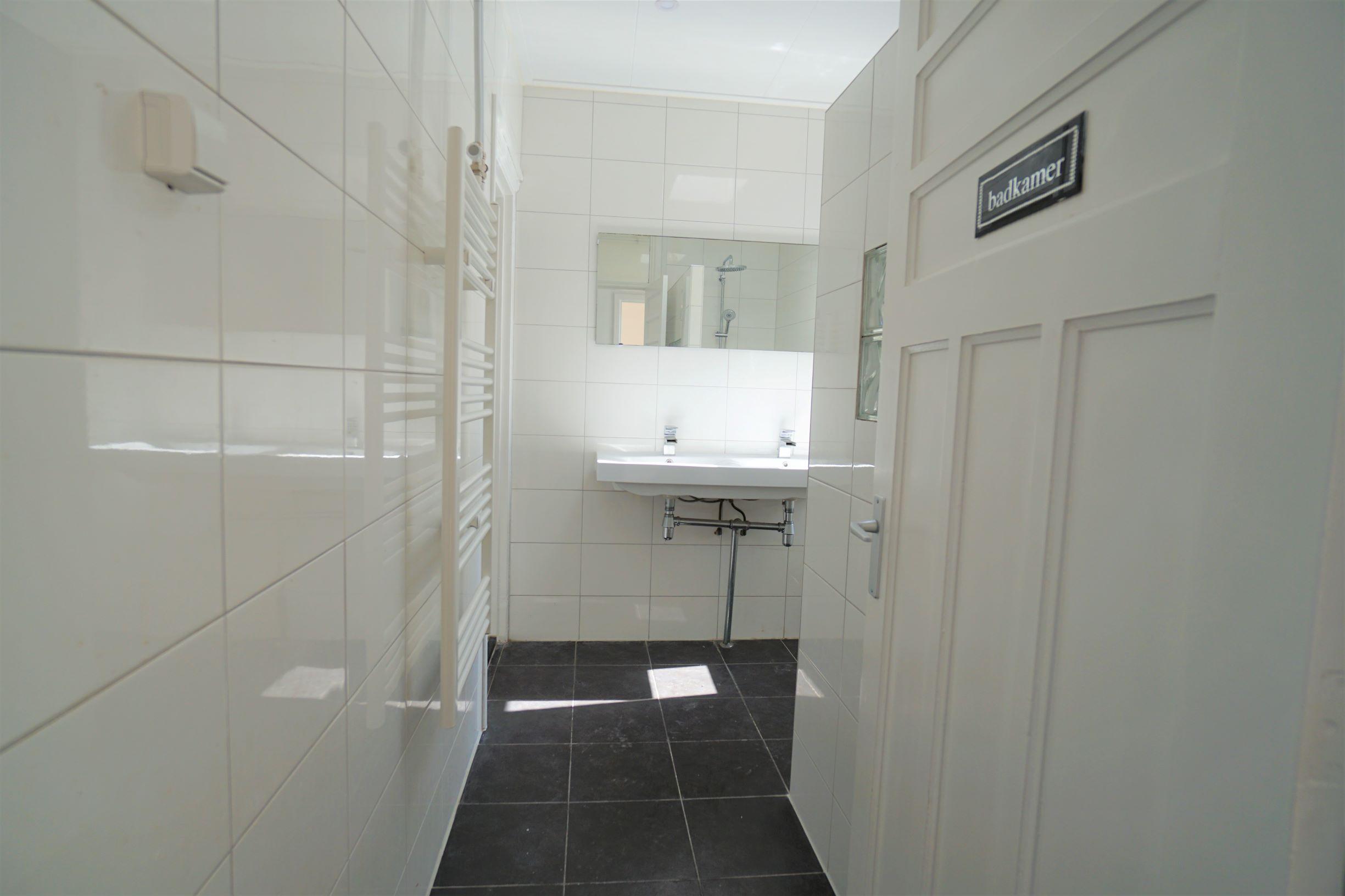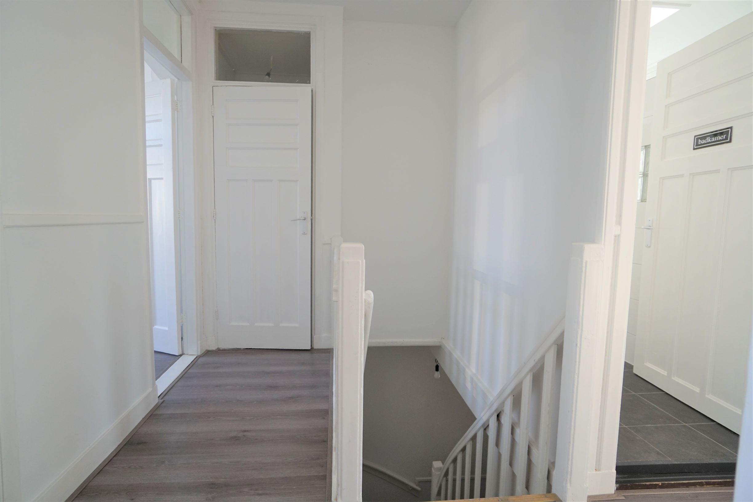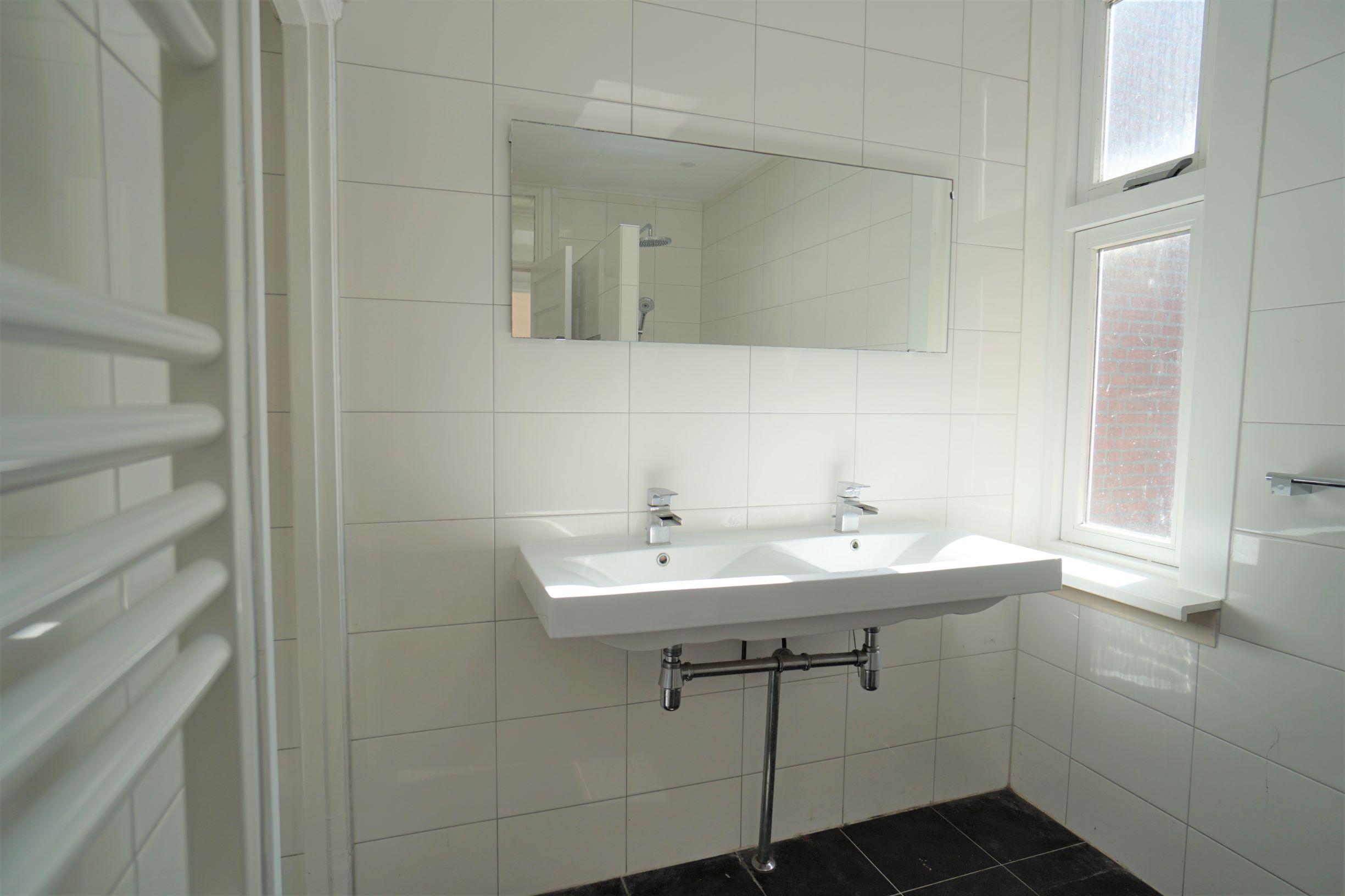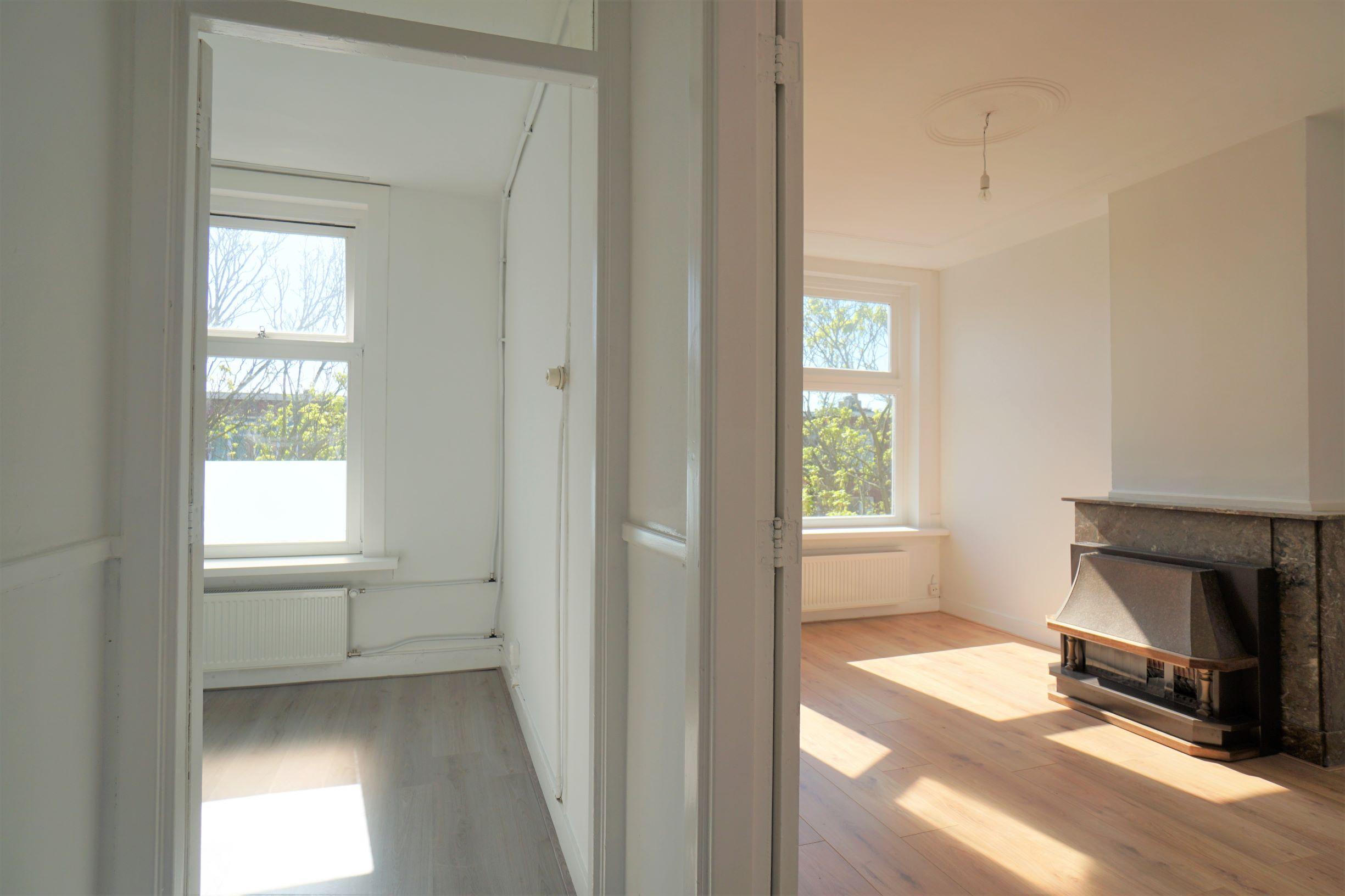 entree 1e etage middels Haags portiek, (fietsen-)bergruimte; binnentrap naar 2e etage; overloop; suite voorkamer, circa 5. m x 3,40 m met originele schouw, schuifdeuren en kastenseparatie en stucplafonds naar suite achterkamer, circa 5,50 m x 3,40 m met originele schouw; voorzijkamer, circa 3,10 m x 2,60 m met balkonnetje; achterzijkamer, circa 2,10 m x 3,50 m; royale doucheruimte, circa 2,85 m x 1,75 m met inloopdouche, dubbel wastafelmeubel, handdoek radiator, voorzieningen wasmachine en droger en wand- en vloertegelwerk; keuken, wit Bruynzeel aanrechtblok, onder- en bovenkasten, r.v.s. blad, 2 spoelbakken en wit wandtegelwerk, gasfornuis met oven en afzuigkap; toilet; achterbalkon.