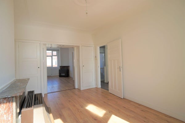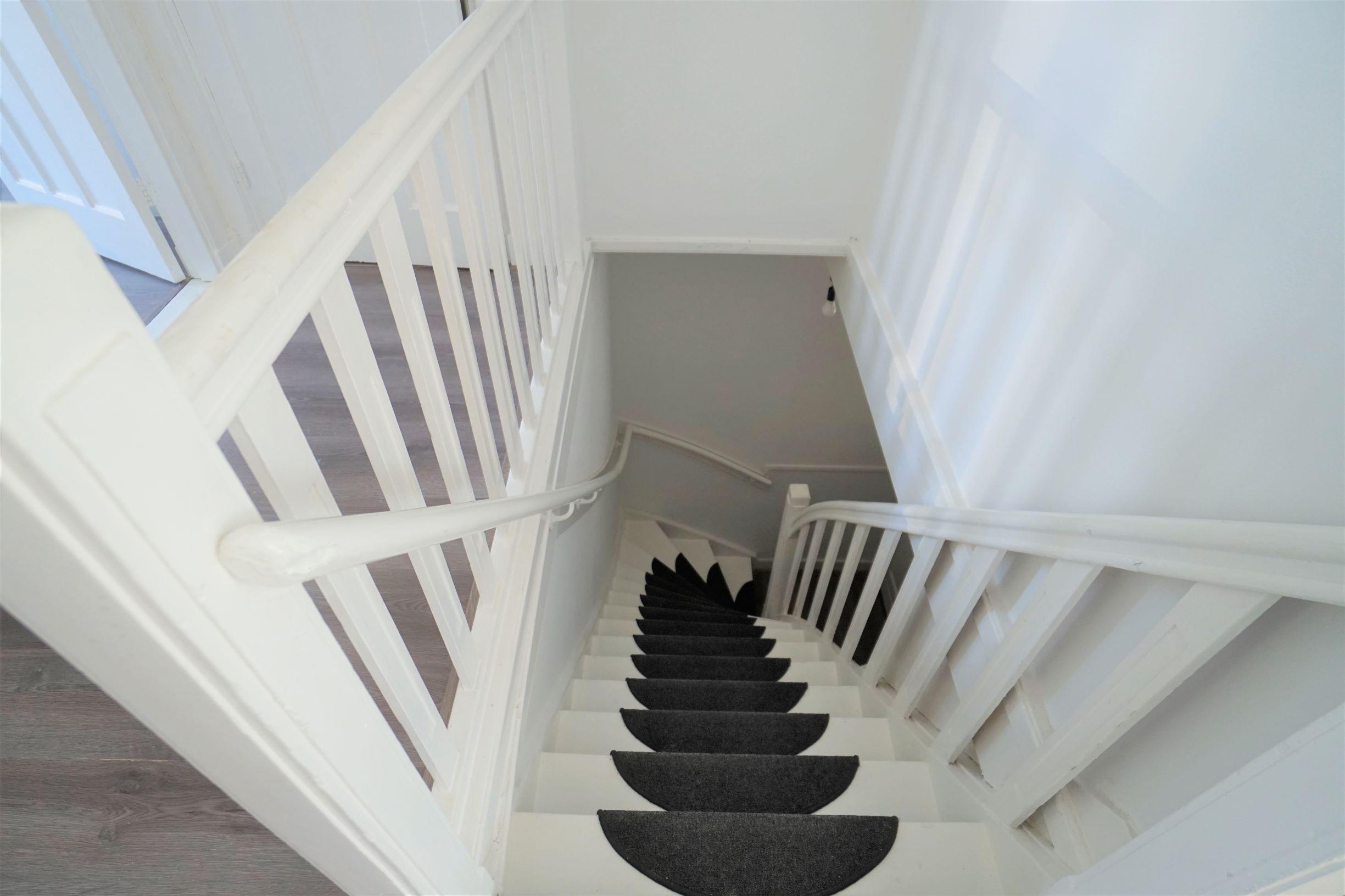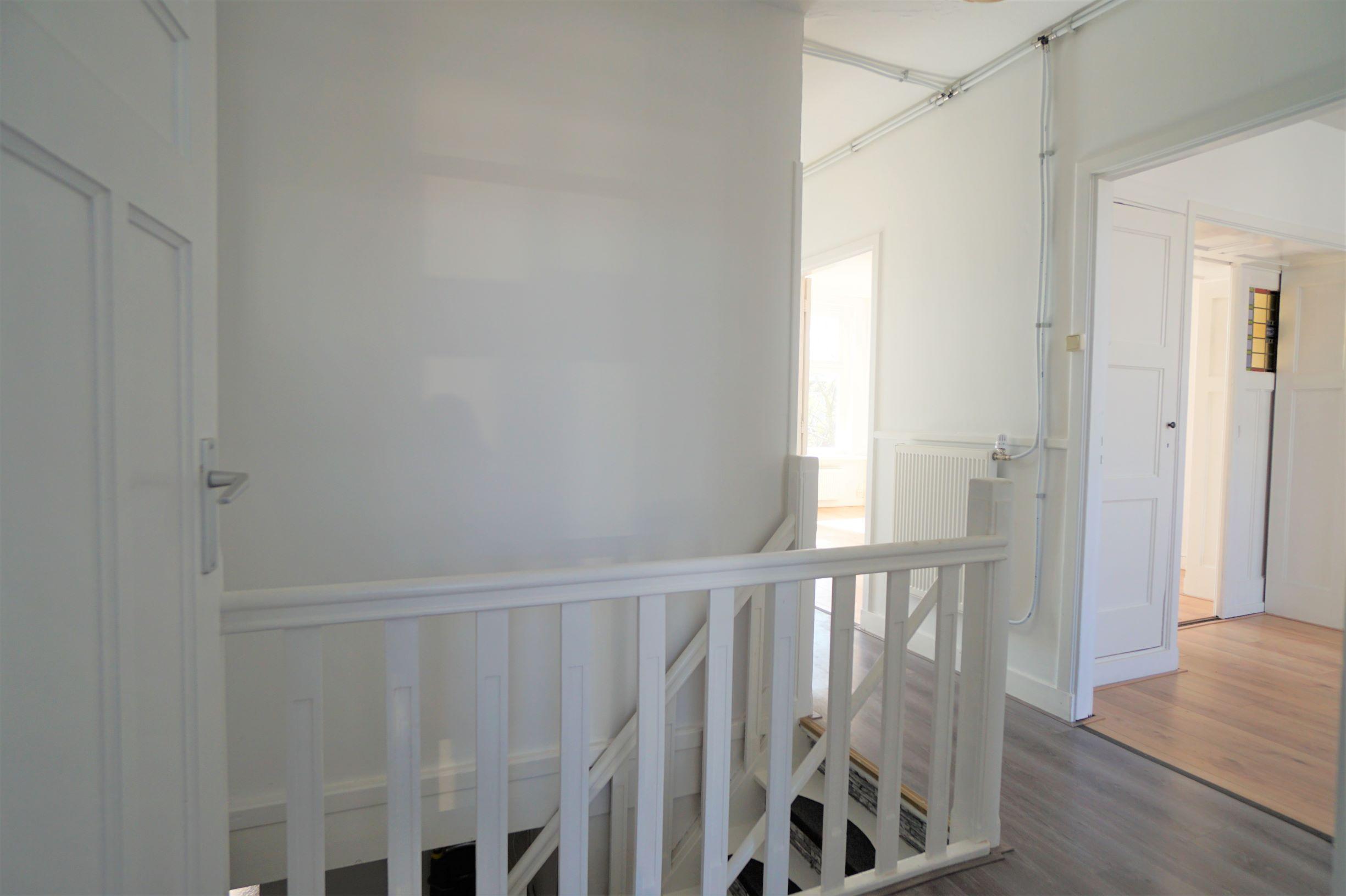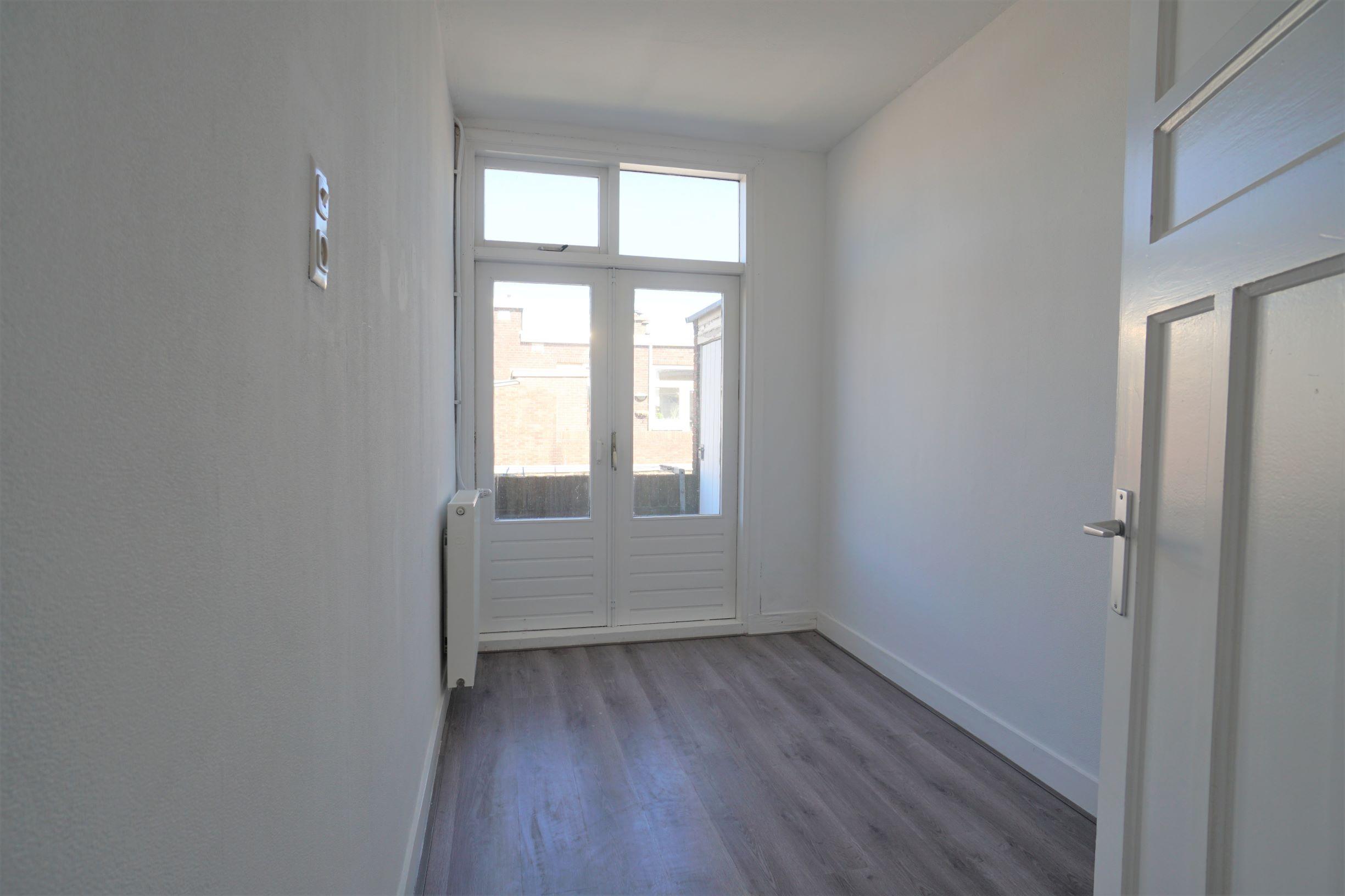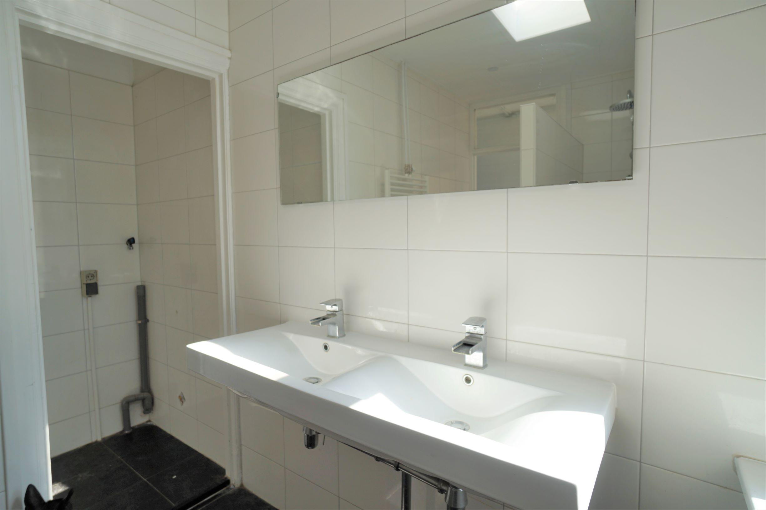 entree 1e etage middels Haags portiek, (fietsen-)bergruimte; binnentrap naar 2e etage; overloop; suite voorkamer, circa 5. m x 3,40 m met originele schouw, schuifdeuren en kastenseparatie en stucplafonds naar suite achterkamer, circa 5,50 m x 3,40 m met originele schouw; voorzijkamer, circa 3,10 m x 2,60 m met balkonnetje; achterzijkamer, circa 2,10 m x 3,50 m; royale doucheruimte, circa 2,85 m x 1,75 m met inloopdouche, dubbel wastafelmeubel, handdoek radiator, voorzieningen wasmachine en droger en wand- en vloertegelwerk; keuken, wit Bruynzeel aanrechtblok, onder- en bovenkasten, r.v.s. blad, 2 spoelbakken en wit wandtegelwerk, gasfornuis met oven en afzuigkap; toilet; achterbalkon.