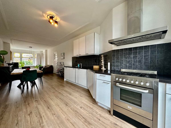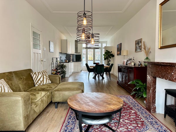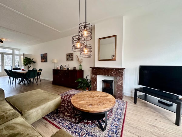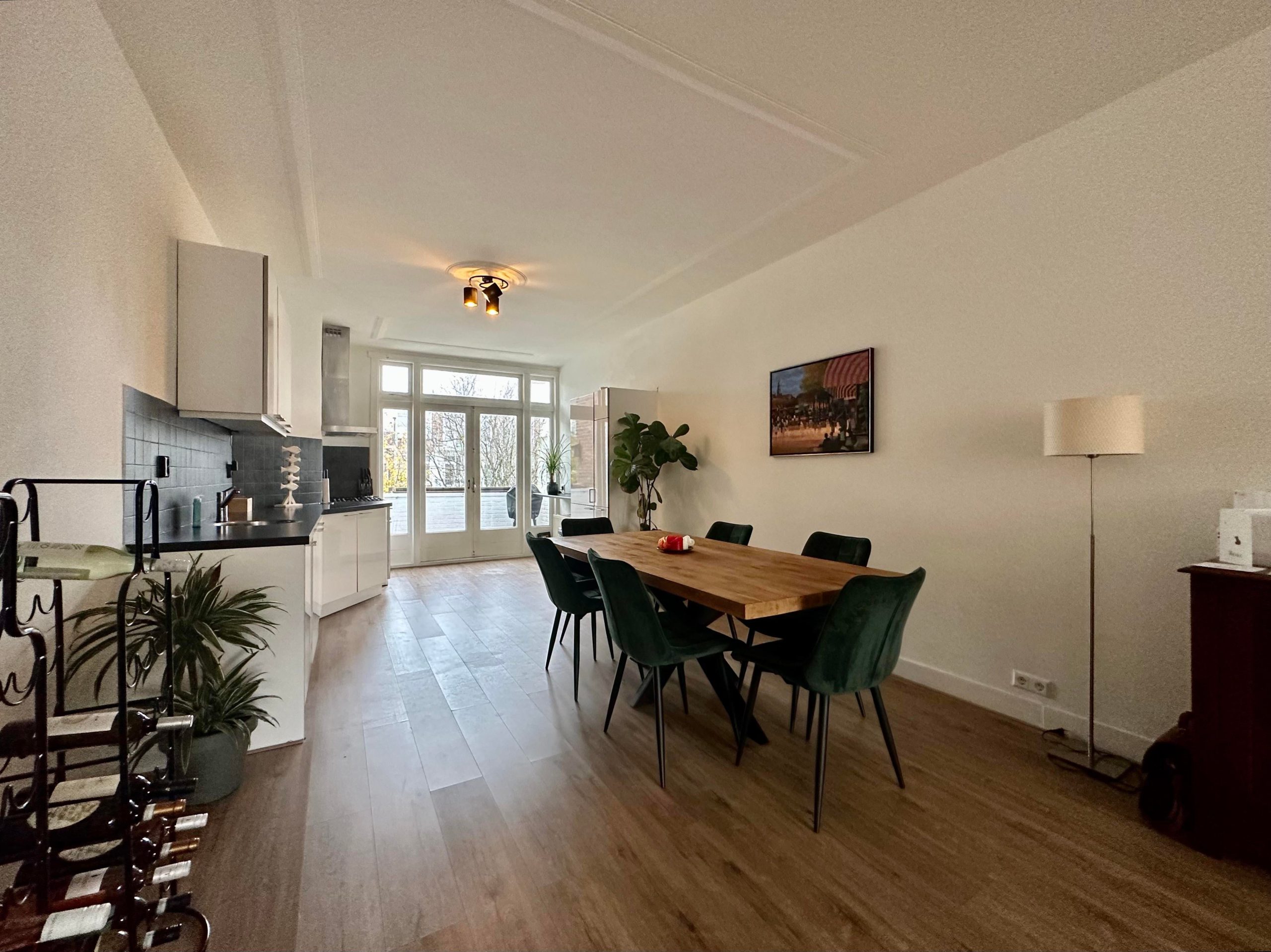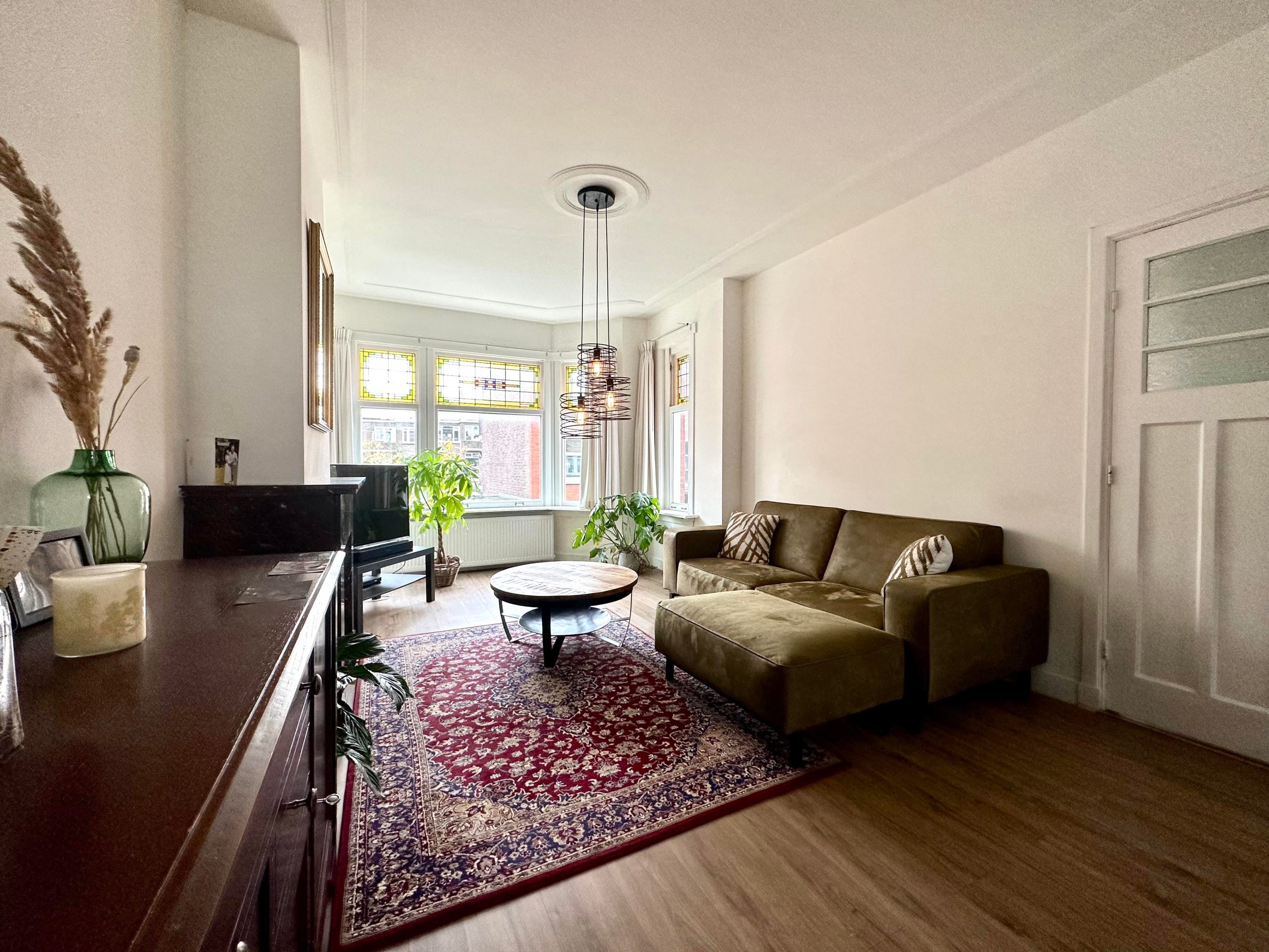 Layout: open porch to the first floor. Entrance to the house, hall with wardrobe, corridor with access to all rooms. Atmospheric living and dining room of approximately 12.5 m long. Living room at the front with attractive bay window with stained glass and original fireplace. Dining room at the rear with open kitchen with sink, dishwasher, beautiful gas stove with oven, extractor hood and fridge/freezer combination. Access to the balcony located on the northwest via French doors. Master bedroom located at the rear with access to the second balcony. Spacious room with cupboard wall and washing machine and dryer space and again access to the balcony. Second bedroom located at the front with a closet. Modern bathroom with washbasin, towel radiator and walk-in shower with rain shower head. Modern toilet.
