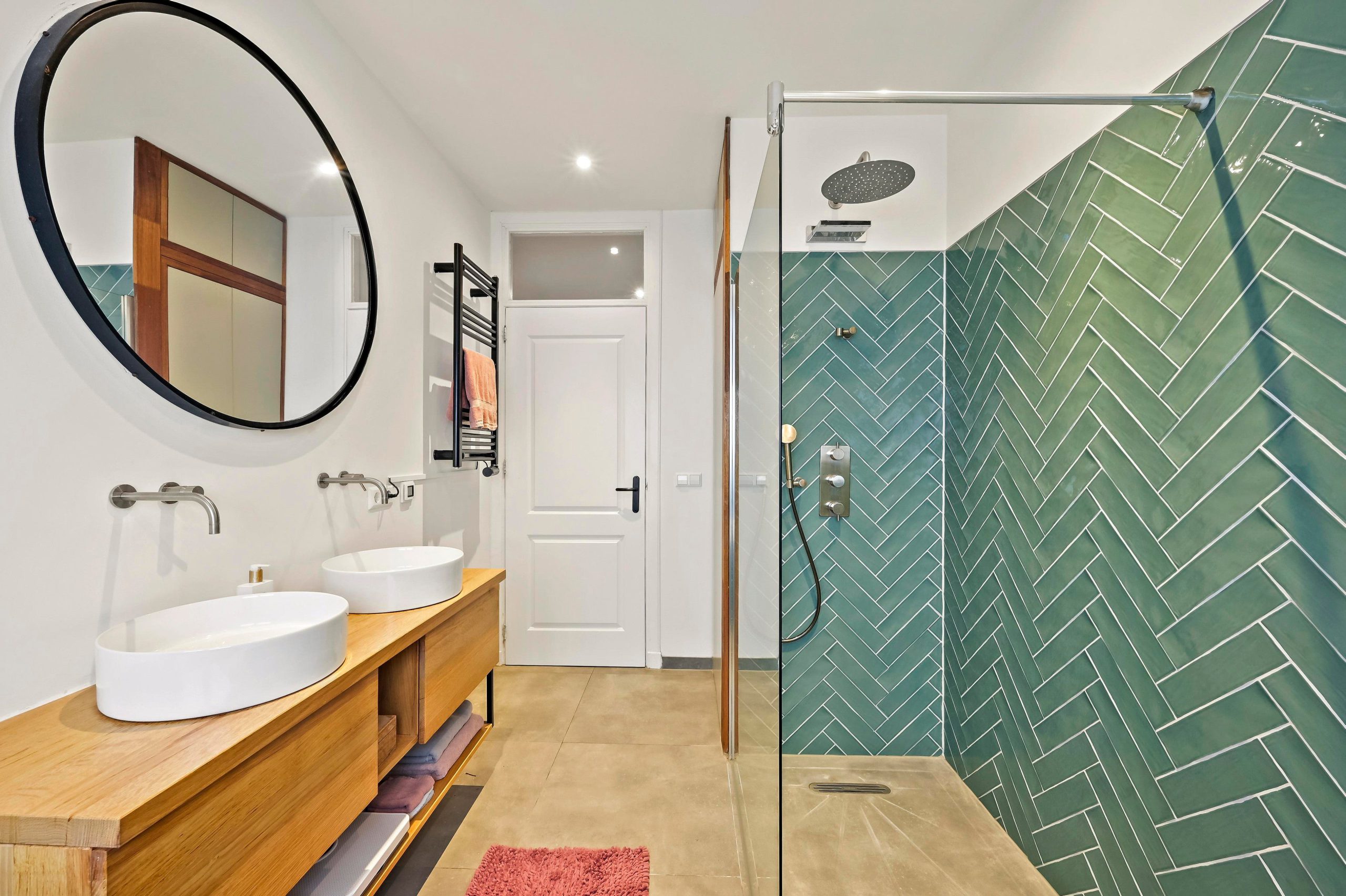 Ligbad, dubbele wastafel, wastafelmeubel, inloopdouche, vloerverwarming geheel