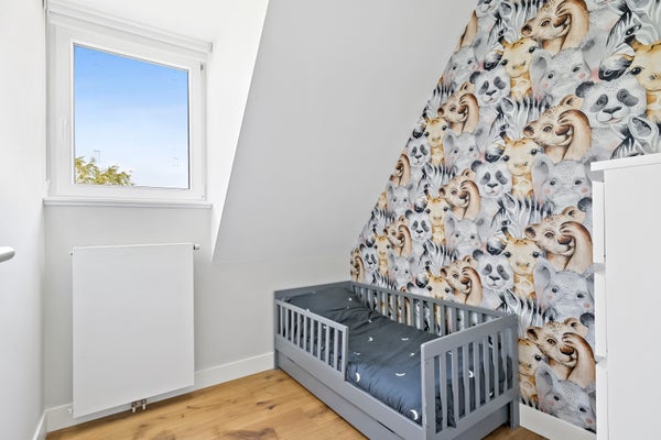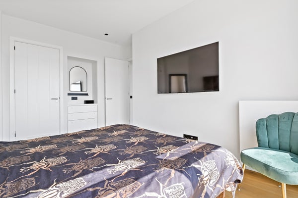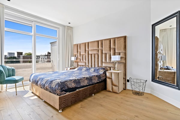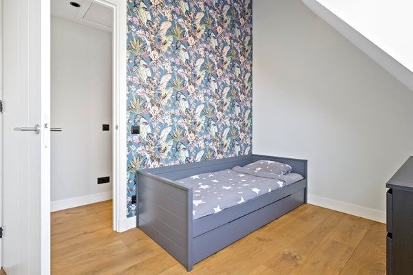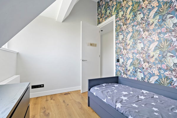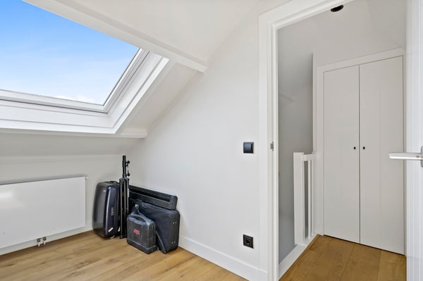 Stairs to the third floor with three bedrooms located at the front with unobstructed and green views and a view of the skyline of The Hague. Second luxury bathroom with freestanding bath, walk-in shower, washbasin, toilet, underfloor heating and towel radiator. In the hallway there is a fixed cupboard with central heating system (Intergas 2021).