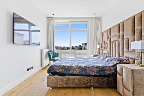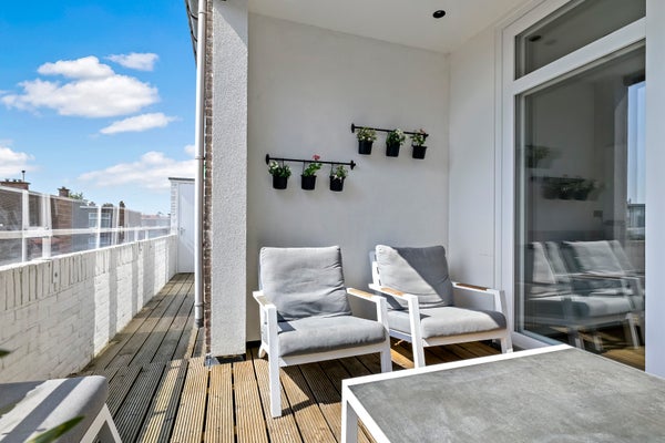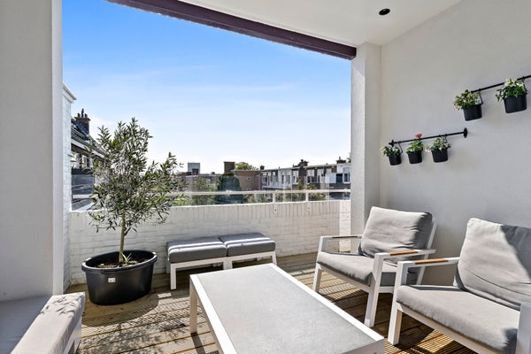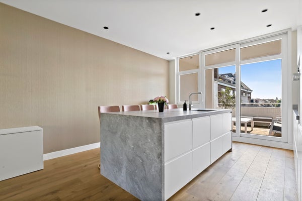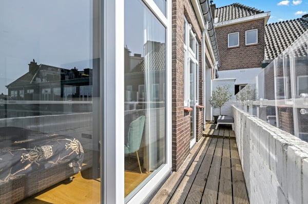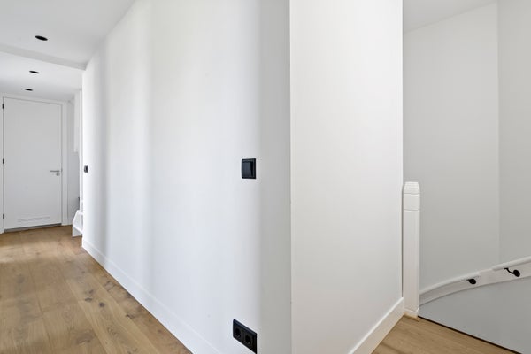 Layout: open Hague porch with stairs to the first floor. Entrance with meter cupboard and storage space. Stairs to the second floor. Corridor with toilet with fountain. Through steel door access to the spacious and bright L-shaped living room with bay window. Luxurious open kitchen with cooking island with induction hob, oven, fridge freezer (SIEMENS) and dishwasher (AEG). Through sliding doors access to the terrace located on the southwest. Back in the hallway, access to the master bedroom with sliding doors to the balcony and luxurious ensuite bathroom with walk-in shower, washbasin, underfloor heating and towel radiator. Second bedroom/study room with again access to the balcony.