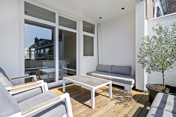 Indeling: open Haags portiek met trap naar de eerste etage. Entree met meterkast en opbergruimte. Trap naar de tweede etage. Gang met toilet met fontein. Via stalen deur toegang naar de ruime en lichte L-vormige woonkamer met erker. Luxe open woonkeuken met kookeiland voorzien van inductiekookplaat, oven, koel-/vriescombinatie (SIEMENS) en vaatwasser (AEG). Via schuifpui toegang tot het terras gelegen op het zuidwesten. Terug in de gang, toegang tot de masterbedroom met schuifpui naar het balkon en luxe badkamer ensuite voorzien van inloopdouche, wastafelmeubel, vloerverwarming en handdoekradiator. Tweede slaapkamer/studeerkamer met wederom toegang tot het balkon.