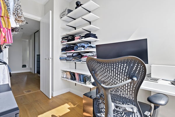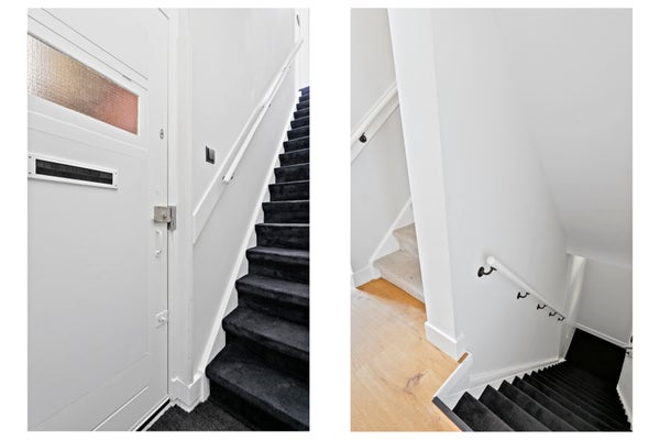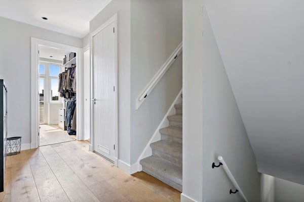 Trap naar de derde etage met drie slaapkamers gelegen aan de voorzijde met vrij en groen uitzicht en zicht op de skyline van Den Haag. Tweede luxe badkamer voorzien van vrijstaand bad, inloopdouche, wastafelmeubel, toilet, vloerverwarming en handdoekradiator. In de gang bevindt zich een vaste kast met CV opstelplaats (Intergas 2021).