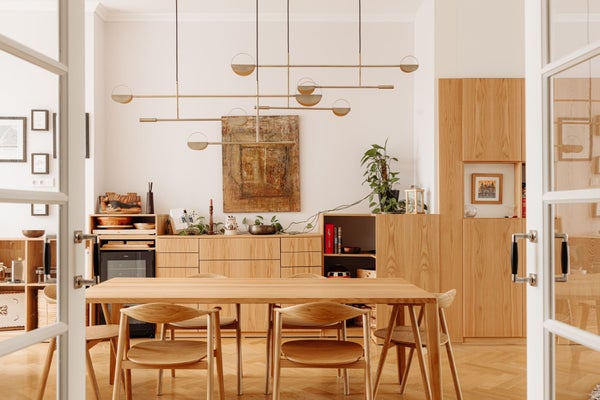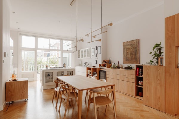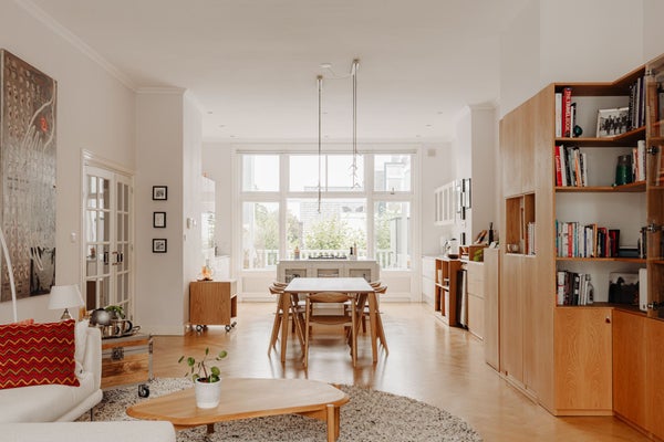 De woonkamer bevindt zich aan de voorzijde van het appartement en biedt meer dan genoeg ruimte om een comfortabele zithoek te creëren. De huidige eigenaar heeft door een architect prachtige op maat gemaakte inbouwkasten laten ontwerpen, die bijna de gehele lengte van het appartement beslaan. Deze kasten zijn vervaardigd uit mooi eikenhout en bieden veel opbergruimte, wat een gevoel van eenheid met de rest van de ruimte creëert.
