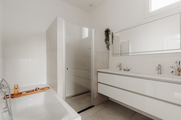 Ligbad, toilet, dubbele wastafel, wastafelmeubel, inloopdouche, vloerverwarming geheel