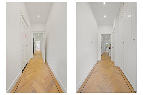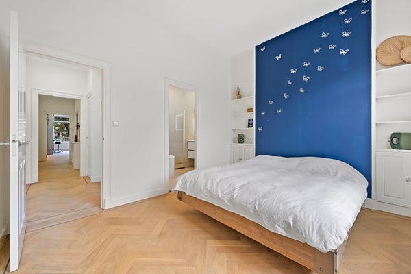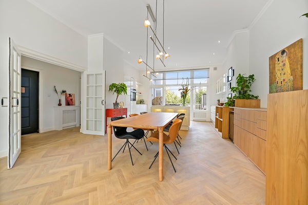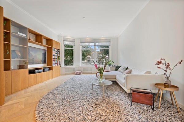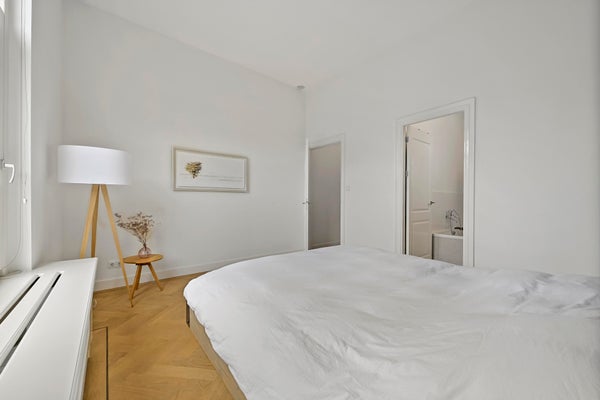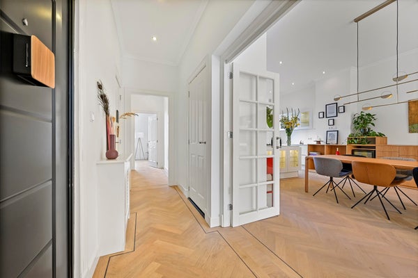 Layout; luxurious communal entrance. Stairs and elevator to the first floor. Upon entering the apartment, a number of unique aspects immediately stand out: spaciousness, beautiful light and a beautiful finish. The apartment was renovated in 2016 and has been perfectly maintained since then. High ceilings, many windows, wooden herringbone floor and lovely outdoor spaces together form a beautiful whole.