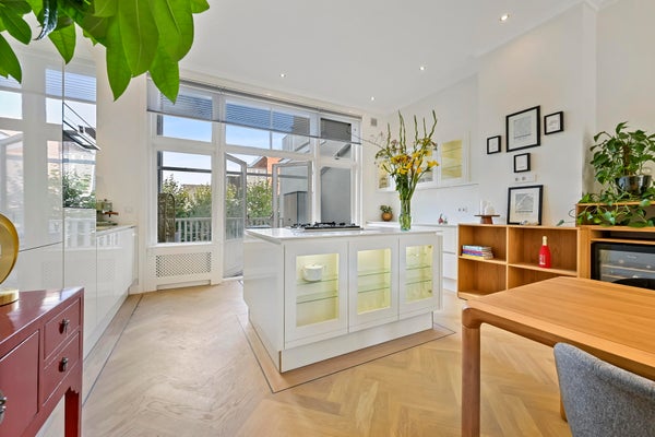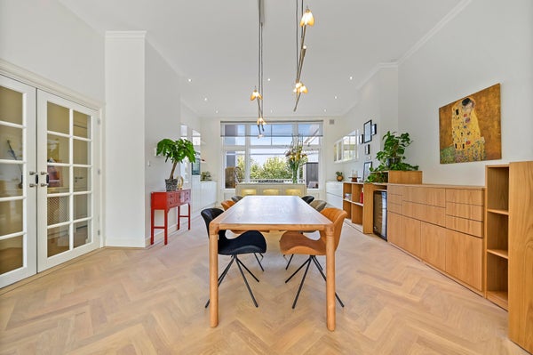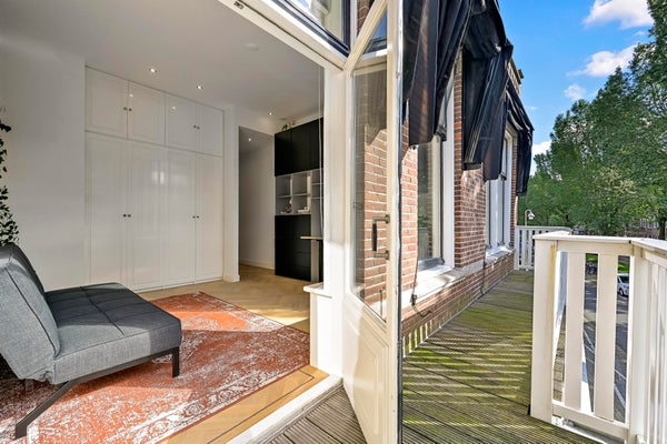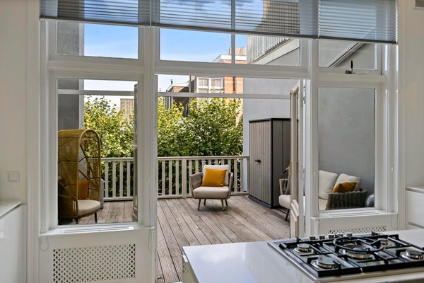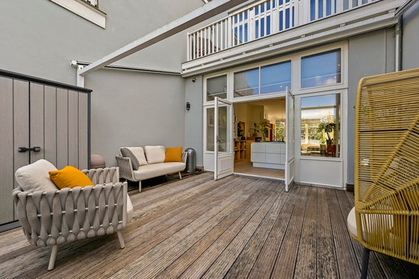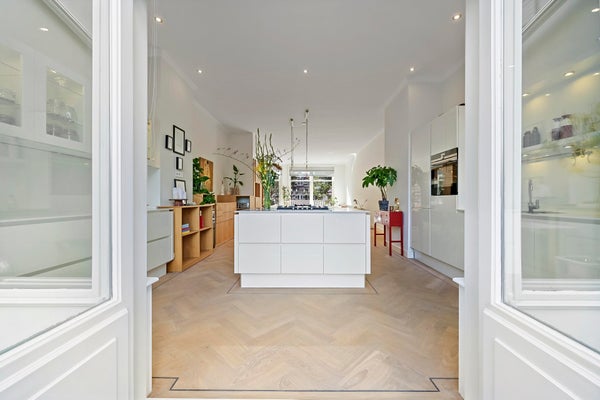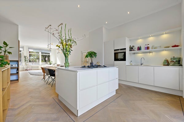 Hall with French doors to the spacious living room. At the rear is the luxurious kitchen, equipped with a cooking island with gas hob and built-in extractor system. Cupboard walls with fridge/freezer combination, large oven, and sufficient storage space. Through French doors access to the very spacious terrace located on the east with morning and early afternoon sun. For the evening sun you can go to the balcony at the front, which runs across the entire width of the house and offers a view of the chic Prins Mauritslaan.