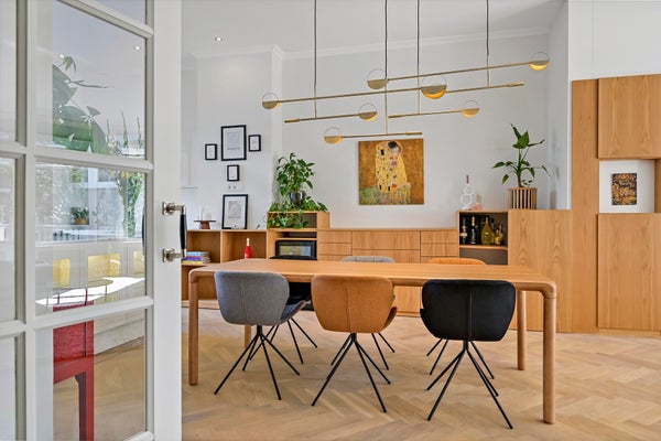 The living room is located at the front of the apartment and offers more than enough space to create a comfortable sitting area. The previous owner had an architect design beautiful custom-made built-in cupboards, which cover almost the entire length of the apartment. These cabinets are made of beautiful oak and offer plenty of storage space, which creates a sense of unity with the rest of the space.
