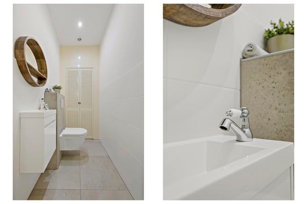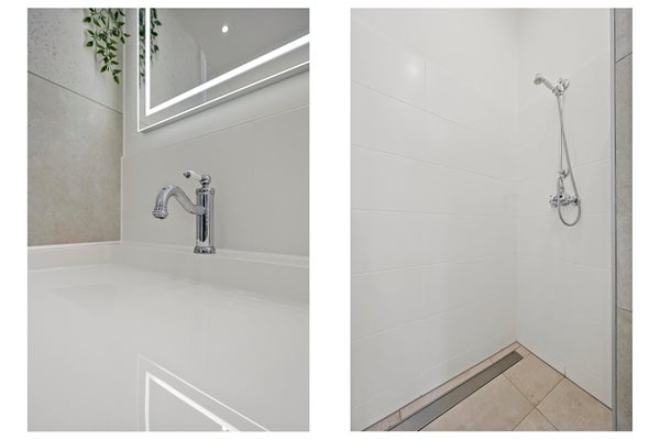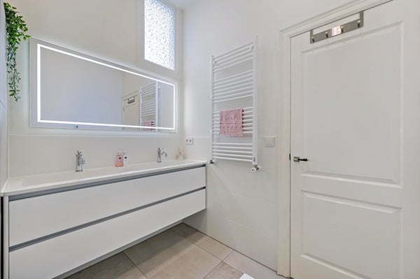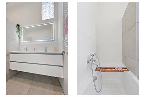Ligbad, dubbele wastafel, vloerverwarming geheel, inloopdouche, wastafelmeubel