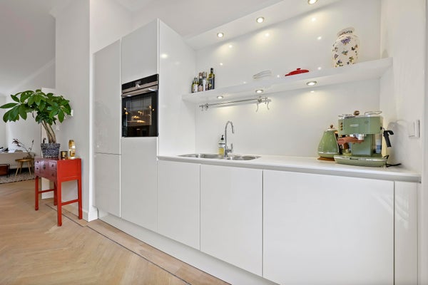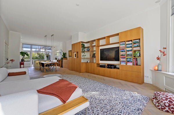 De woonkamer bevindt zich aan de voorzijde van het appartement en biedt meer dan genoeg ruimte om een comfortabele zithoek te creëren. De vorige eigenaar heeft door een architect prachtige op maat gemaakte inbouwkasten laten ontwerpen, die bijna de gehele lengte van het appartement beslaan. Deze kasten zijn vervaardigd uit mooi eikenhout en bieden veel opbergruimte, wat een gevoel van eenheid met de rest van de ruimte creëert.