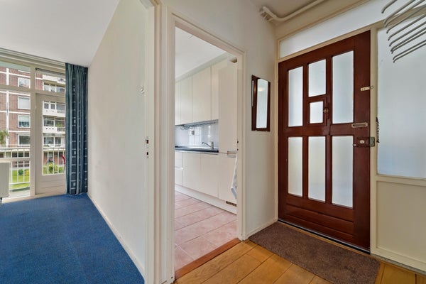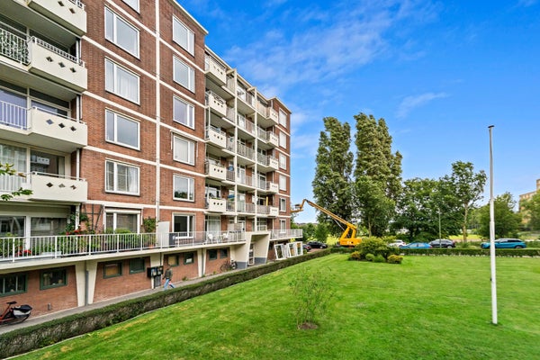 Gesloten portiek met intercom, brievenbussen- en bellentableau, hal met een tochtdeur naar de lift en het trappenhuis. Entree woning, ruime hal met toegang tot alle vertrekken. Lichte woon-/eetkamer met groen uitzicht en een schuifpui naar het zonnige extra brede balkon (ZW), keuken voorzien van diverse inbouwapparatuur zoals een koel-/vriescombinatie, een oven vaatwasser, 5-pits gaskookplaat en voldoende kastruimte. Vanuit de keuken toegang tot het balkon gelegen aan de achterzijde met ochtendzon en is voorzien van een balkonkast. Twee ruime slaapkamers gelegen aan de achterzijde welke beide toegang bieden tot het balkon. Zeer ruime badkamer voorzien van inloopdouche, wastafel, handdoekradiator en wasmachine en droger aansluiting. Separaat toilet met fontein.