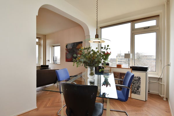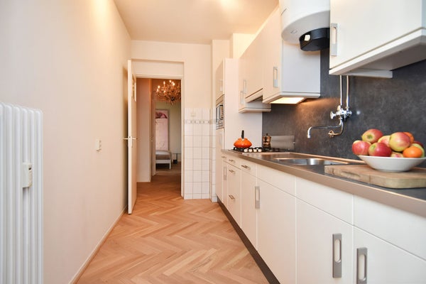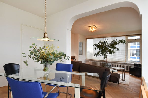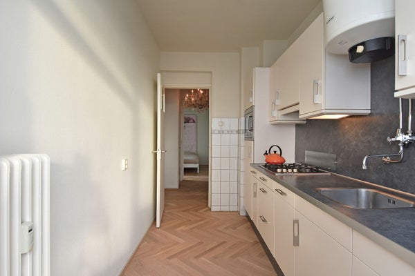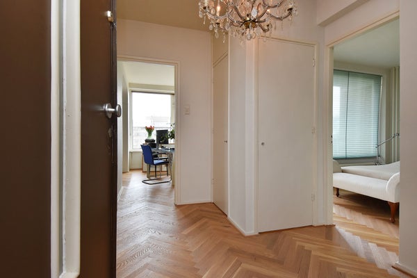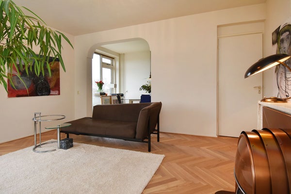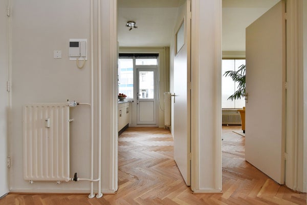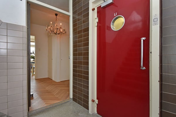 Gesloten portiek met brievenbussen- en bellentableau, videofoon, lift en trappenhuis. Entree, ruime hal met eiken visgraat parketvloer (m.u.v. het sanitair), een meterkast en vaste kasten, lichte woonkamer met een schouw en gashaard, vaste kasten met glas in lood, annex eetkamer, ruime slaapkamer met vaste kasten en een deur naar het balkon I, annex badkamer met een douche, een wastafelmeubel en de wasmachineaansluiting, keuken met moderne inrichting bestaande uit een koelkast met vriesvak, een combi oven, een 4 pits gascomfort, een afzuigkap, een vaatwasmachine en een 80 L. boiler (eigendom), lade, boven-, onderkasten en een deur naar het balkon II met een vaste kast, separaat toilet met een fonteintje.