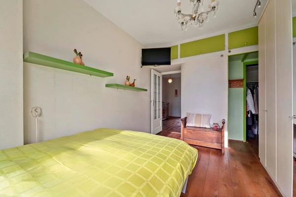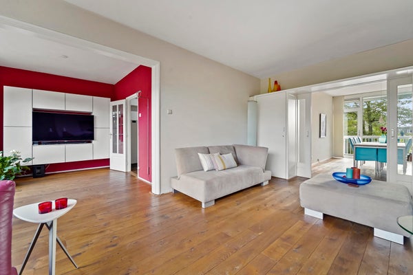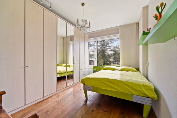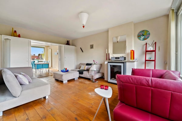 Layout: Access via closed porch at the front and rear. Bell and mailbox tableau. Via elevator or stairs to the second floor. Entrance to the house, spacious hall with wardrobe and access to all rooms. Spacious and bright living-dining room ensuite with sliding doors and closets. From the dining room at the rear access to the sunny balcony with electric sunscreen. Bright living room at the front with an additional front side room (this can easily be converted into a second bedroom). The entire house has a beautiful wooden floor, plastic frames and double glazing. Kitchen located at the rear with an induction hob, fridge-freezer and washing machine connection. From the kitchen there is access to the second balcony with pantry. The spacious master bedroom located at the rear has a deep closet. Modern bathroom with walk-in shower, washbasin and towel radiator.