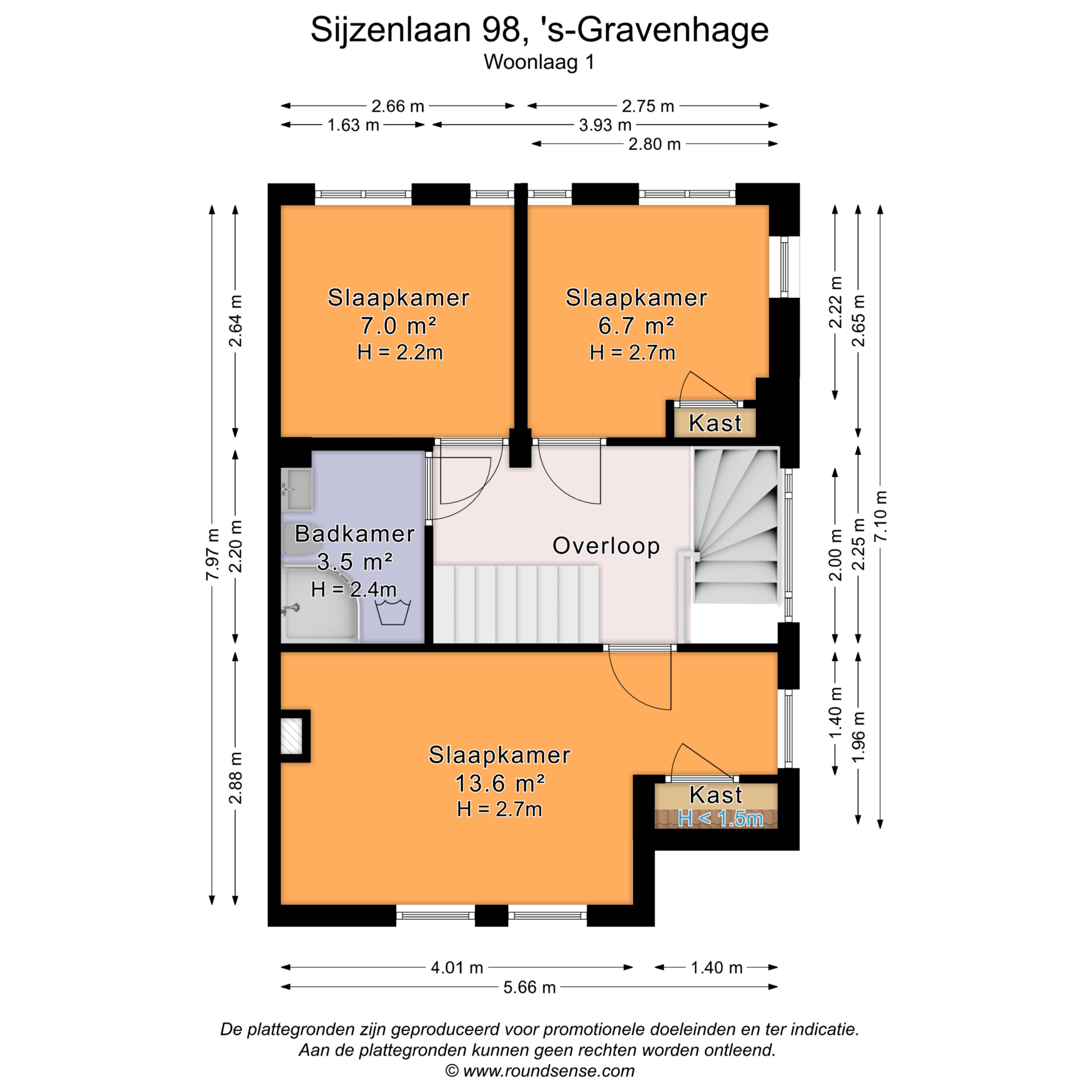 Vanuit de gang trap naar de eerste etage, ruime overloop met veel lichtinval door grote raampartij aan de zijkant. Hoofdslaapkamer gelegen aan de voorzijde met uitzicht over de Sijzenlaan. Badkamer voorzien van inloopdouche, sanibroyeur en wastafel. Slaapkamer 2 en slaapkamer 3 gelegen aan de achterzijde. Middels vaste trap bereikt u de zolder waar een 4e en 5e slaapkamer gecreëerd kunnen worden.