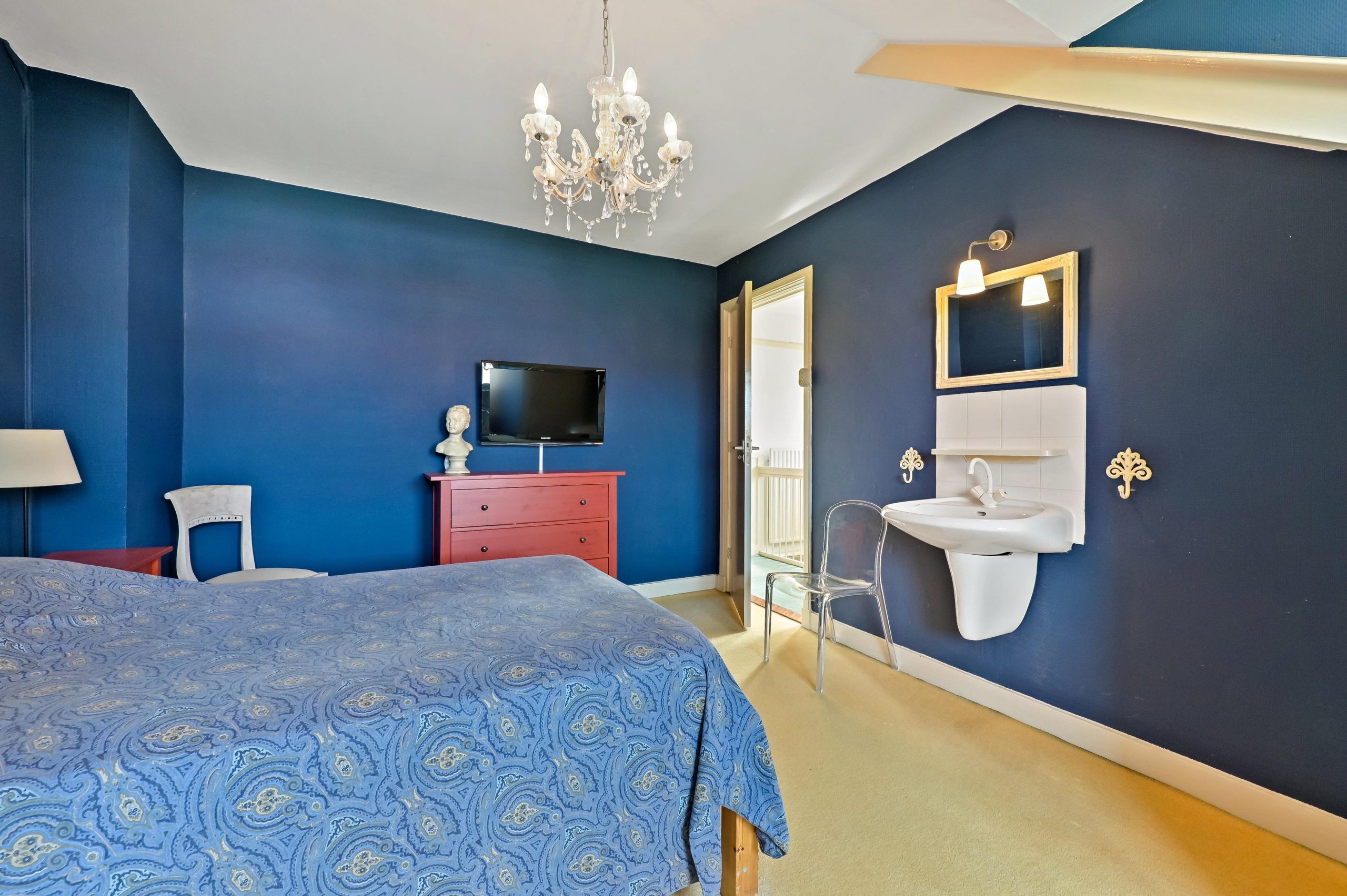 Stairs from the hallway lead to the first floor, a spacious landing with plenty of natural light thanks to windows along the side wall. The master bedroom is located at the rear, with French doors leading to the balcony. Both the bedroom and the hallway provide access to the bathroom, which is equipped with a shower, sink, and bathtub. The second and third bedrooms are at the front, the largest of which has air conditioning and a vanity unit. A toilet is located in the hallway. Stairs lead to the second floor landing, with a very spacious bedroom at both the front and rear, both featuring a dormer window, sink unit, built-in wardrobes, and access to the attic, which could be converted into an additional room. The rear bedroom has a dormer window and built-in wardrobe. The second bathroom is located at the front, featuring a shower and ample storage space.