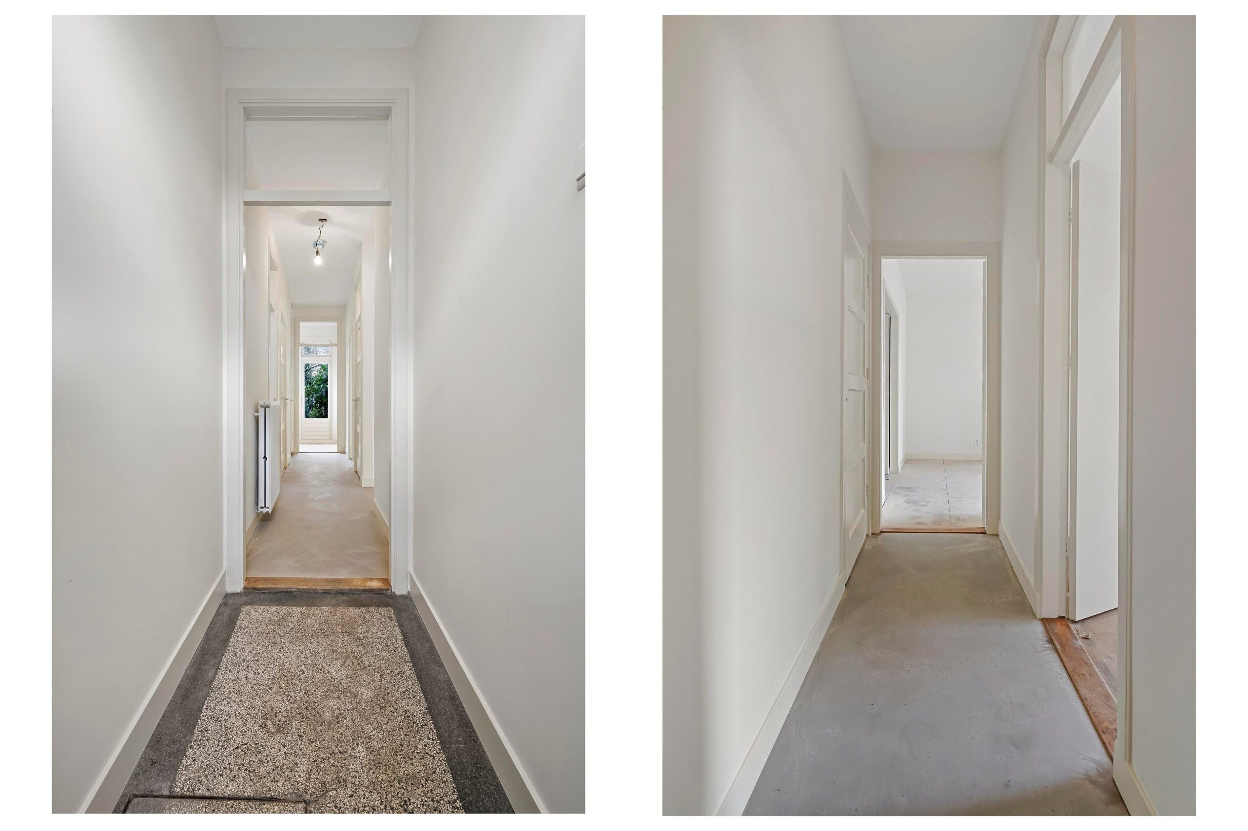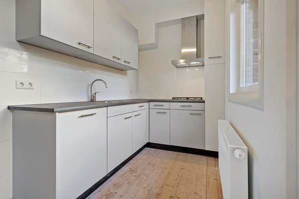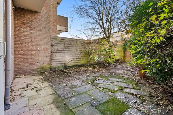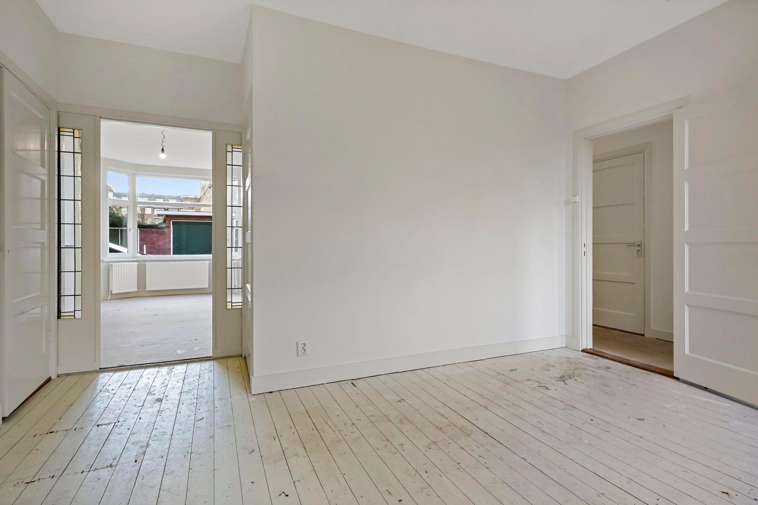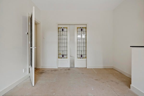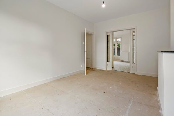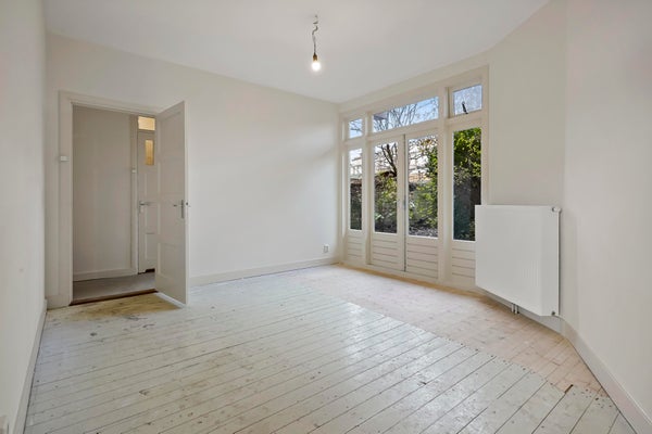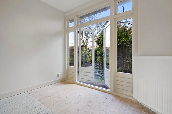 Entrance house with vestibule. Spacious hallway with access to all rooms and separate toilet with washbasin. Spacious and bright living/dining room ensuite with authentic sliding separation with stained glass. Through French doors access to the lovely spacious garden. The garden is quite deep and has a wooden shed. New kitchen located at the rear with various built-in appliances such as gas hob, extractor hood, dishwasher and central heating boiler. Through the kitchen again access to the garden. Modern bathroom with a spacious walk-in shower, towel radiator, washbasin with mirror and washing machine connection. Two spacious bedrooms located at the front. It is possible to create a third bedroom at the rear.
