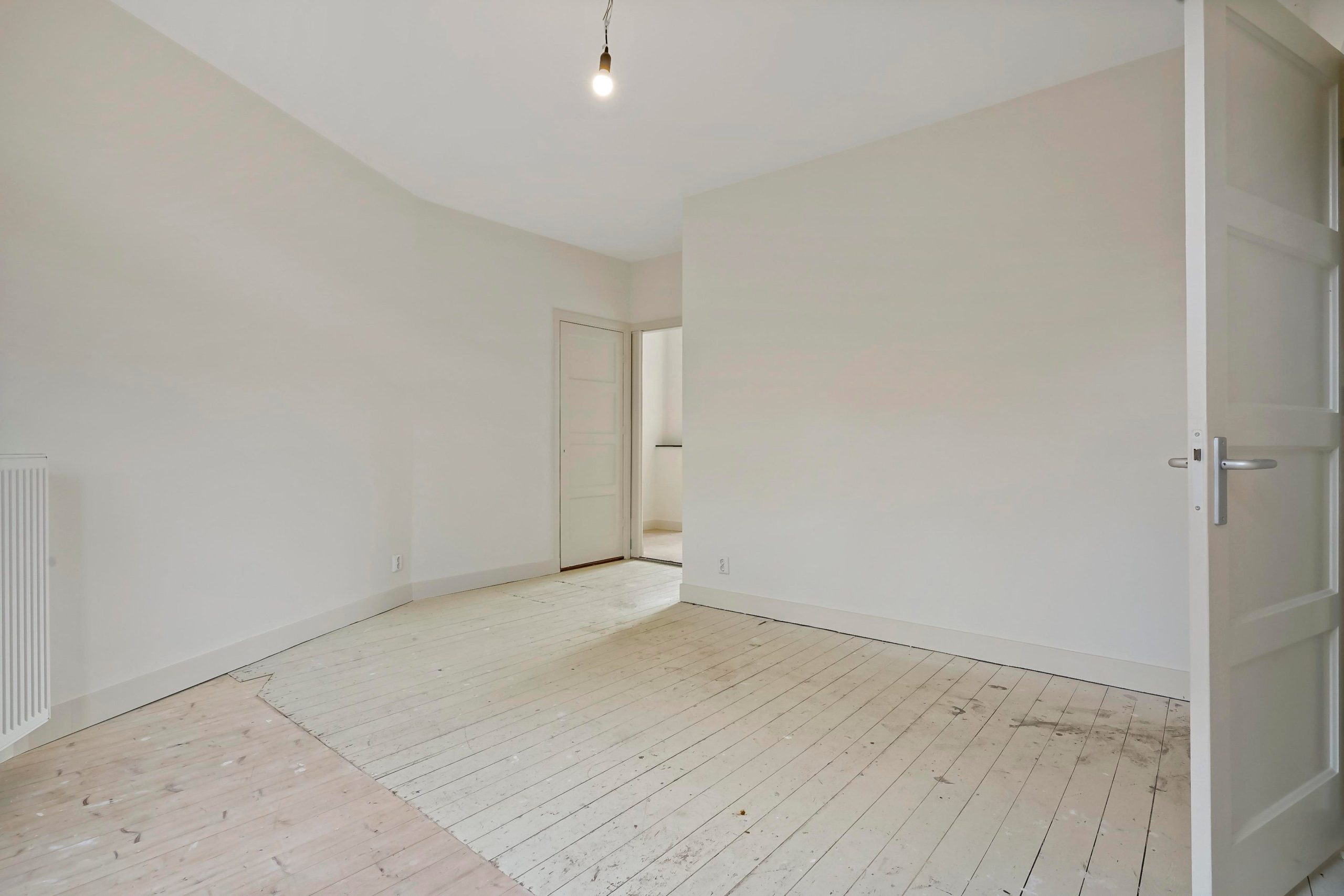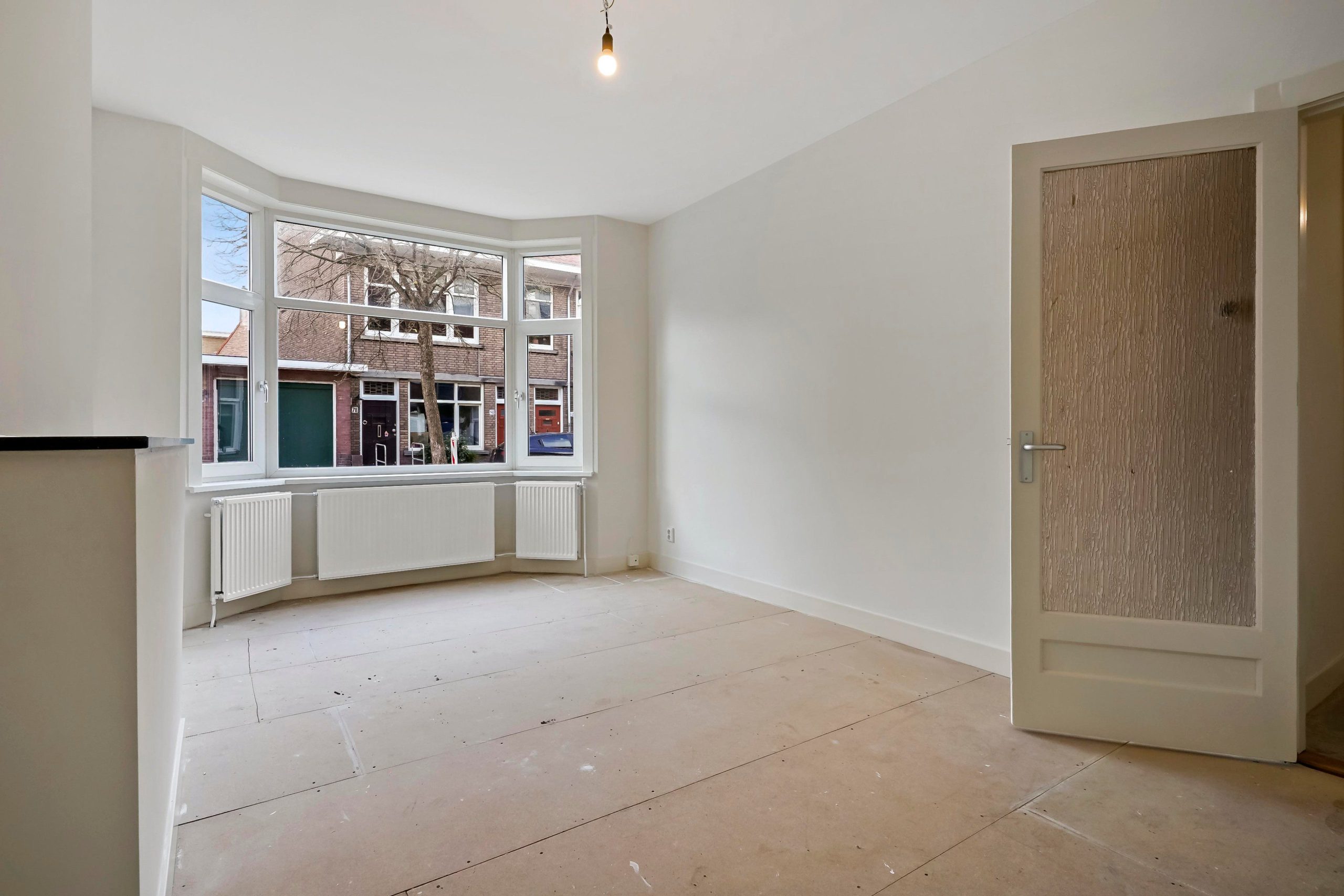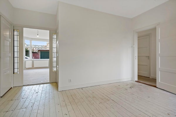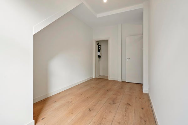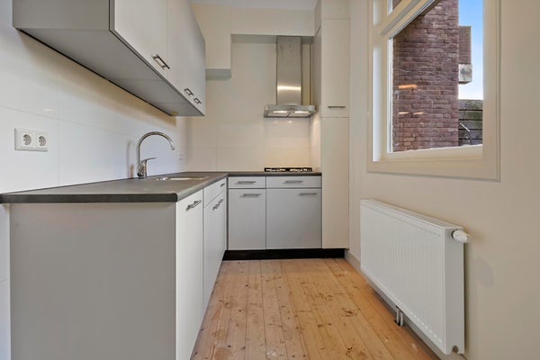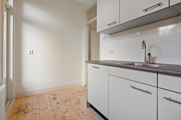 Entrance house with vestibule. Spacious hallway with access to all rooms and separate toilet with washbasin. Spacious and bright living/dining room ensuite with authentic sliding separation with stained glass. Through French doors access to the lovely spacious garden. The garden is quite deep and has a wooden shed. New kitchen located at the rear with various built-in appliances such as gas hob, extractor hood, dishwasher and central heating boiler. Through the kitchen again access to the garden. Modern bathroom with a spacious walk-in shower, towel radiator, washbasin with mirror and washing machine connection. Two spacious bedrooms located at the front. It is possible to create a third bedroom at the rear.