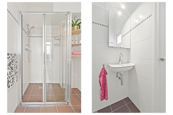 Very spacious bedroom located at the rear with fixed deep cupboard and again access to the balcony with morning sun. Bathroom with shower (Grohe) and washbasin. The entire house has a beautiful laminate floor.